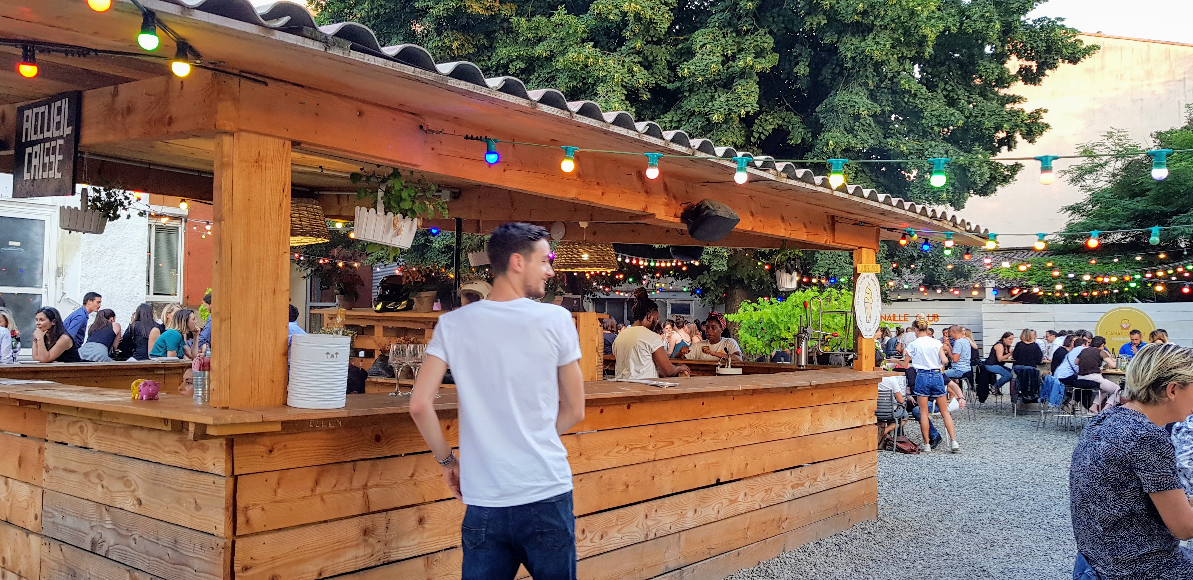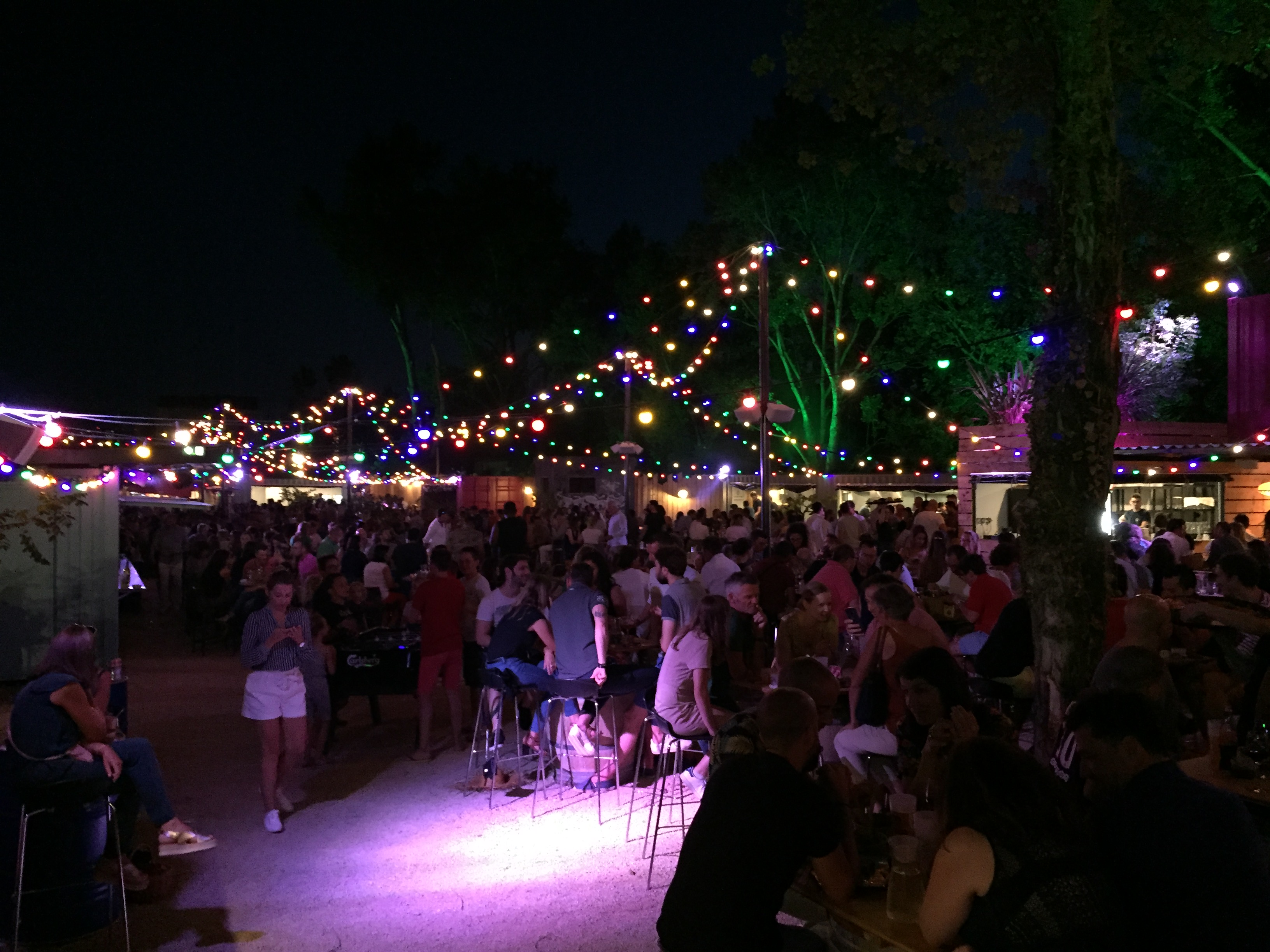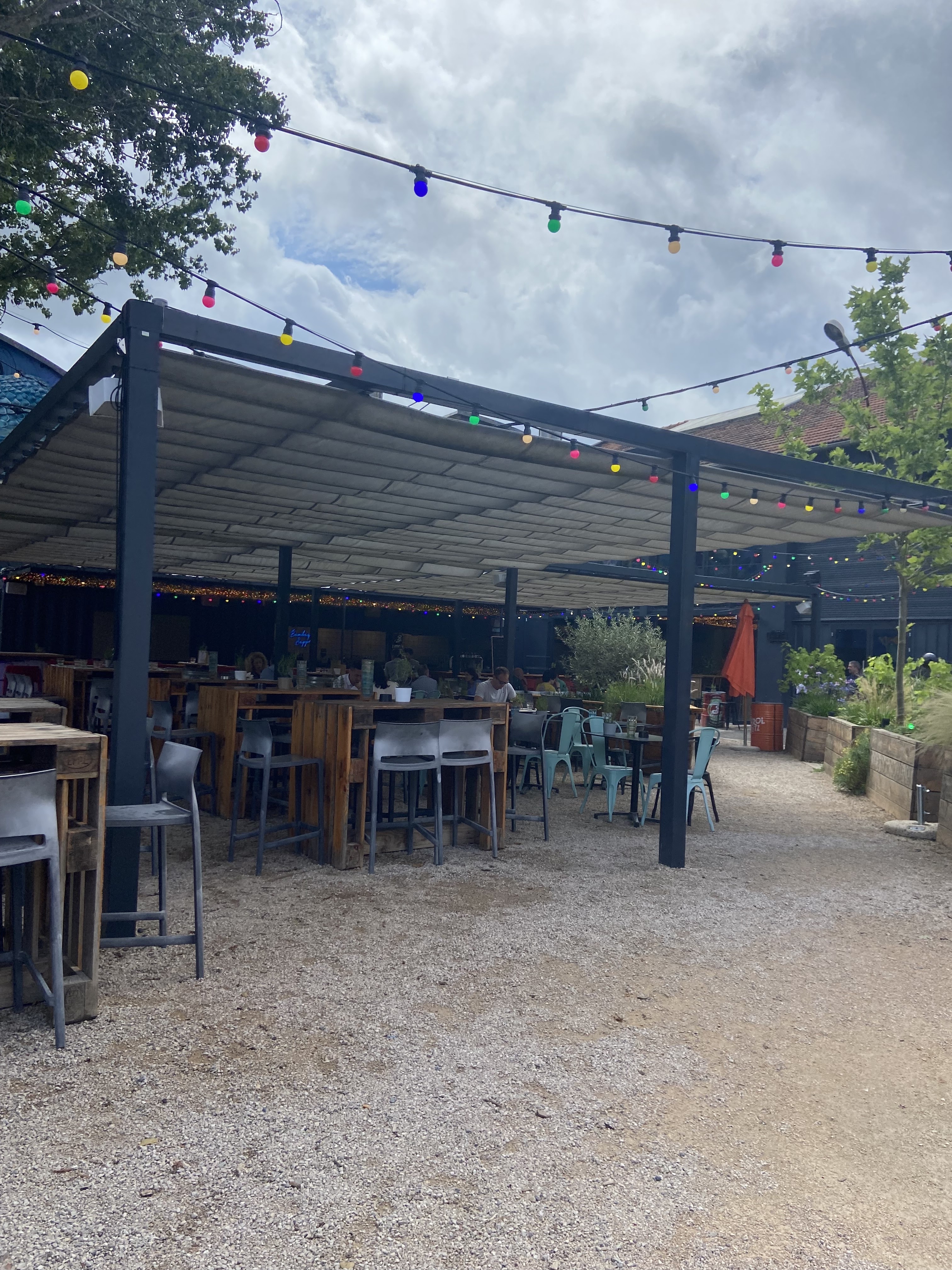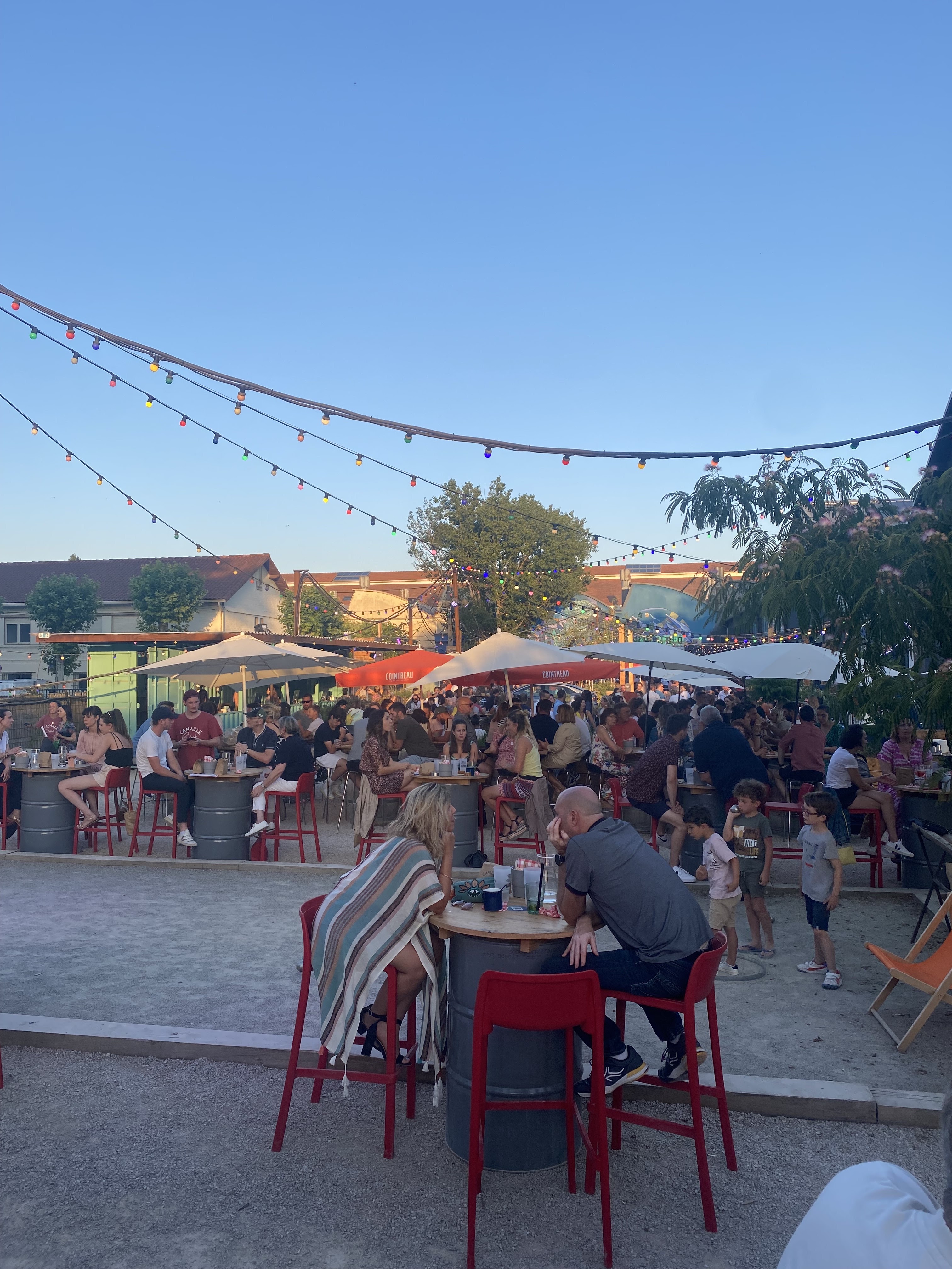 Nouveau lieu du côté de l'espace COBALT. Il présente l'avantage d'être très spacieux et est fait à base de palettes, bidons et conteneurs. Plusieurs bars avec des nourritures différentes. Il y a deux terrains de pétanque et un bac à sables pour vos enfants. La musique est plus forte que dans l'ancien endroit je suppose car il y a moins de voisinages autour. À tester l'été pour une soirée entre amis !!