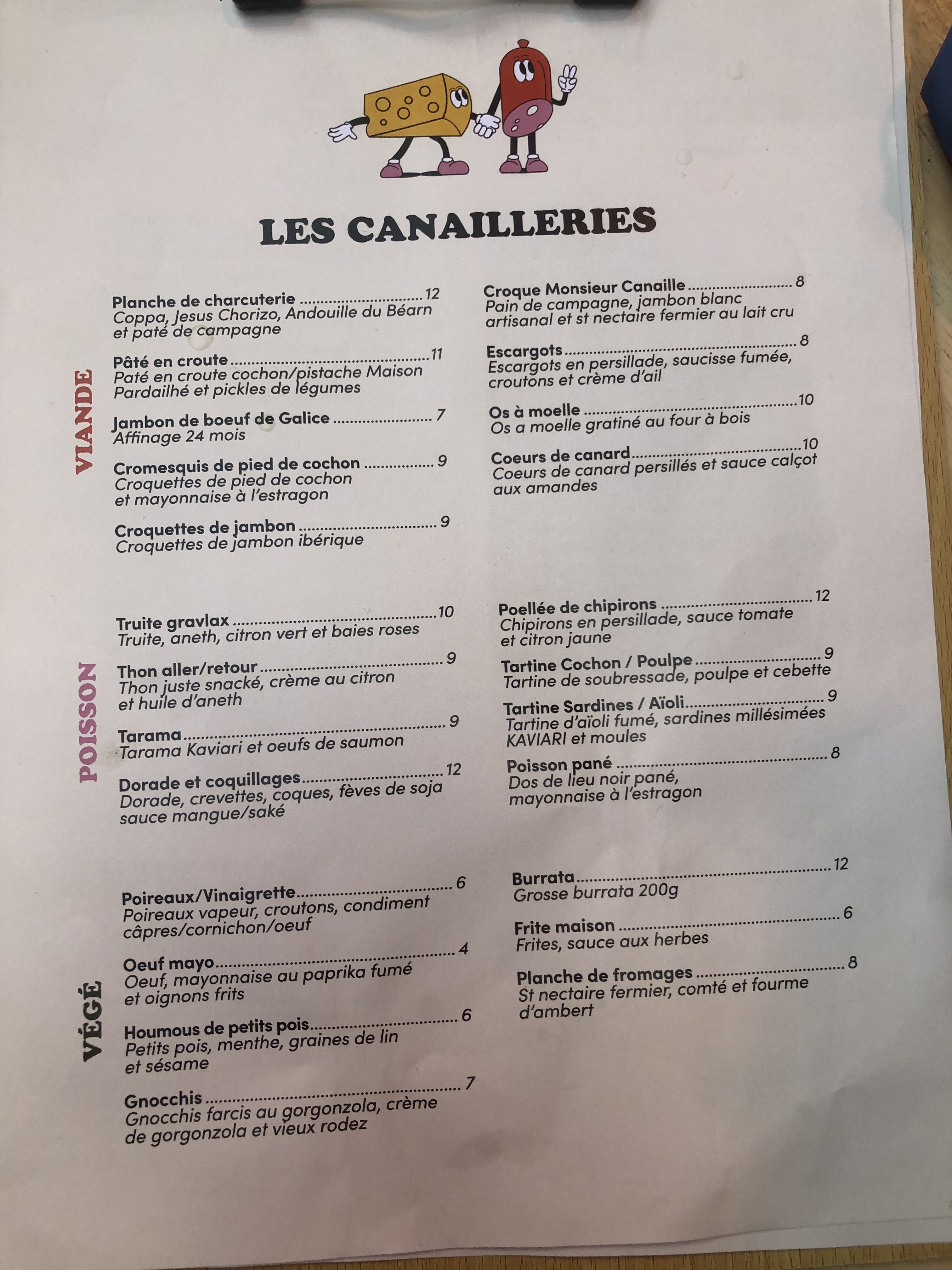 Ancienne adepte du canailles depuis 4 ans. Grosse déception ! Je suis venue il y a 10 jours. Quantité minuscule, carte minimaliste, peu de tapas, carte très chère ayant faim en partant! Ce qui n’était pas le cas avant. J’ai mis ça sur le dos de l’ouverture Nouvelle tentative ce week-end avec d’autres amis. Même réaction de tous! Rapport qualité / prix non concevable. Peu de choix, responsable non correct cocktail imbuvable… à faire des remarques. Ce ne sera pas la guinguette de notre été pourtant nous venions de nombreuses fois chaque été … très dommage. Manque de tapas et baisser les prix