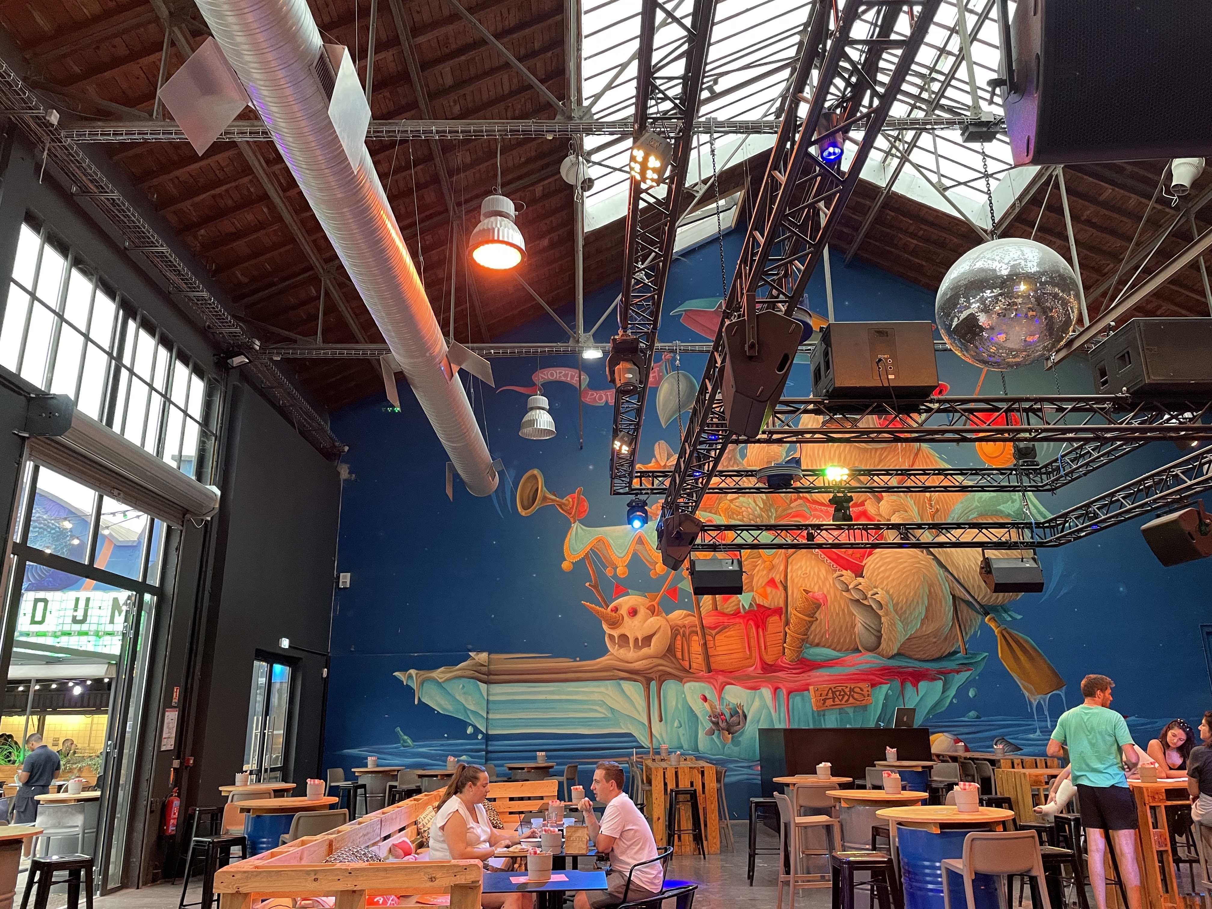 Le lieu est assez vaste c'est vrai mais c'est très agréable. Nous ne sommes pas les uns sur les autres. Le service se fait essentiellement via l'application et un QR code. Une fois la commande passée le service est assez rapide, il vaut mieux commander en plusieurs fois que tout d'un coup. Les plats que nous avions commandés étaient tous très bons, burgers, pizza, lobster roll, tapas. Le personnel est pro, très sympa et très réactif. Petits bémol sur les tarifs un peu excessifs notamment sur les boissons, et pas de possibilité de payer avec la carte tickets resto. Nous reviendrons tt de même avec plaisir.