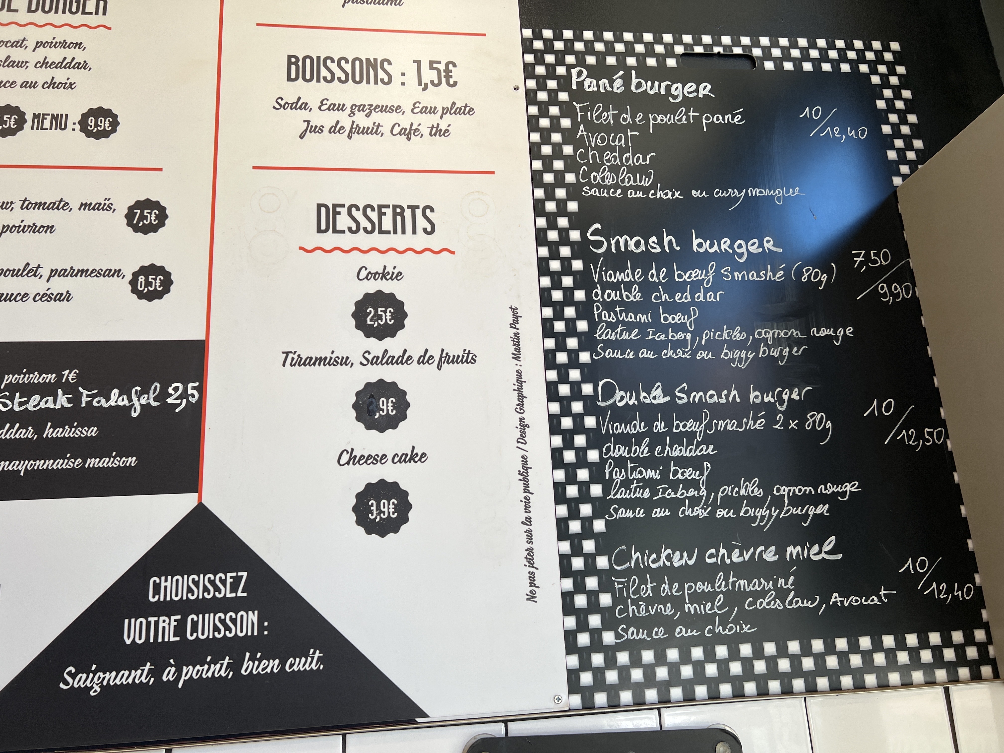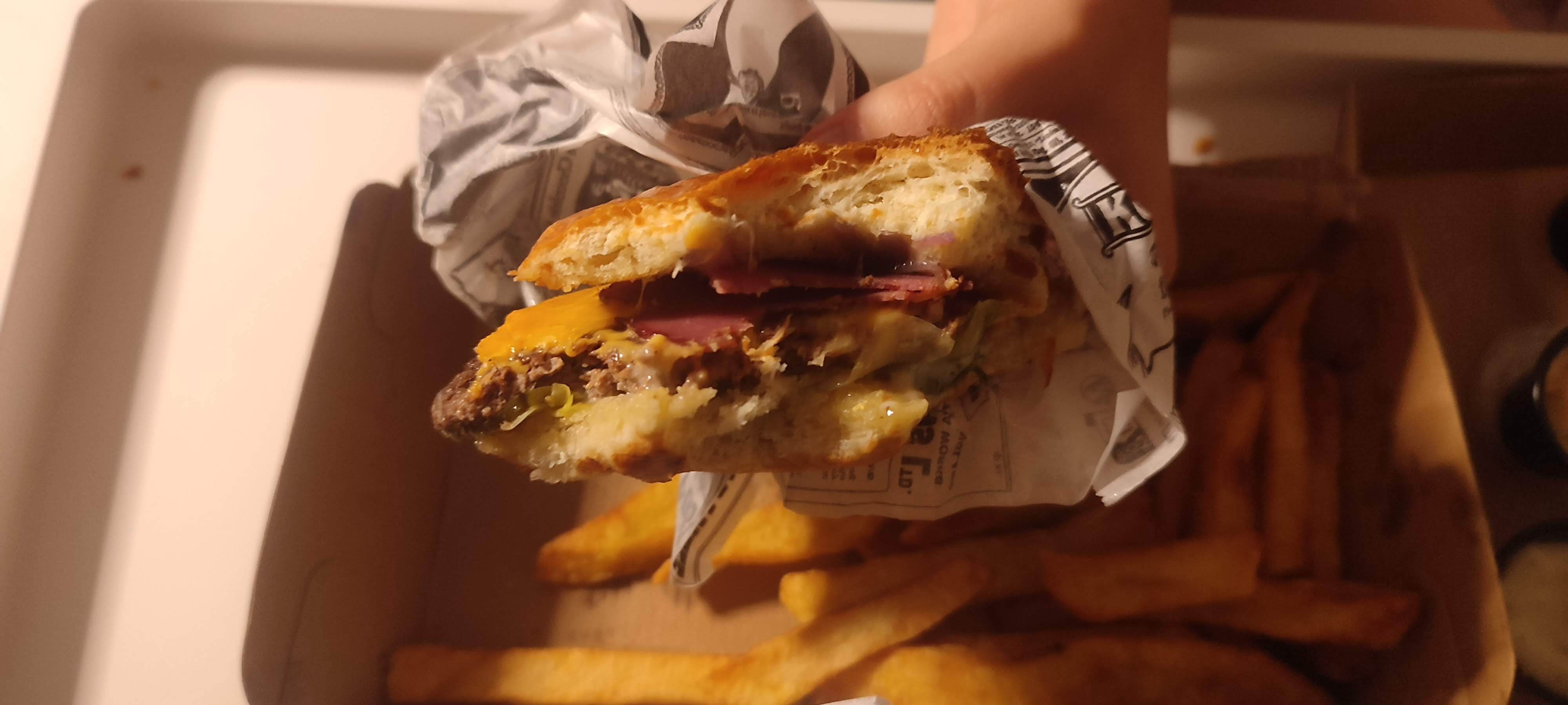 Bonsoir, bon burger nous en avons pris trois en tout. Petit reproche à faire ils ne sont pas assez copieux j’en ai mangé 2 un chicken et un smash burger. Après la commande vous avez encore faim. Dommage.... Trop cher pour ce que c’est. J’ai tester c’est le principal.
