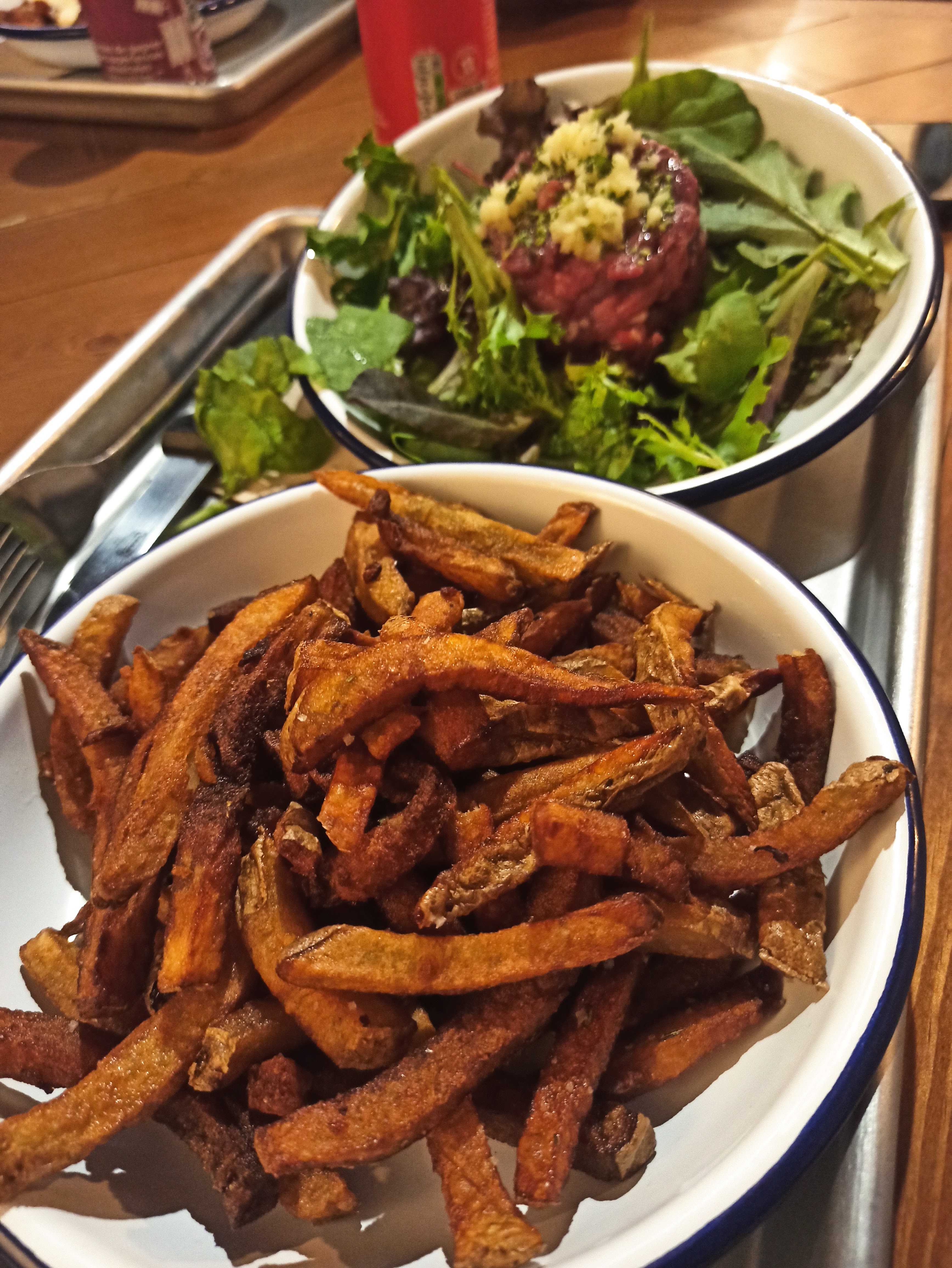 Un peu déçue. Cette enseigne ressemble plus à un fast-food qu’à un restaurant. Lors de notre passage, j’ai été surprise par la qualité ; je m’attendais à mieux. Les frites sont grasses et à peine tièdes; la viande est posée par-dessus. Ensuite, on débarrasse son plateau (comme d’autres fast-food); cela ne nous pose aucun souci. Par contre, les assiettes sales étaient empilées, la poubelle débordait, et les couverts trempent dans une eau grasse. Il n’y avait pas foule ce soir là ; je pense que la plonge aurait pu être faite au fur et à mesure. Ça ne fait pas très propre. Ce n’est pas mauvais, mais c’est loin d’être bon. Pour ma part, je ne suis pas emballée pour revenir…