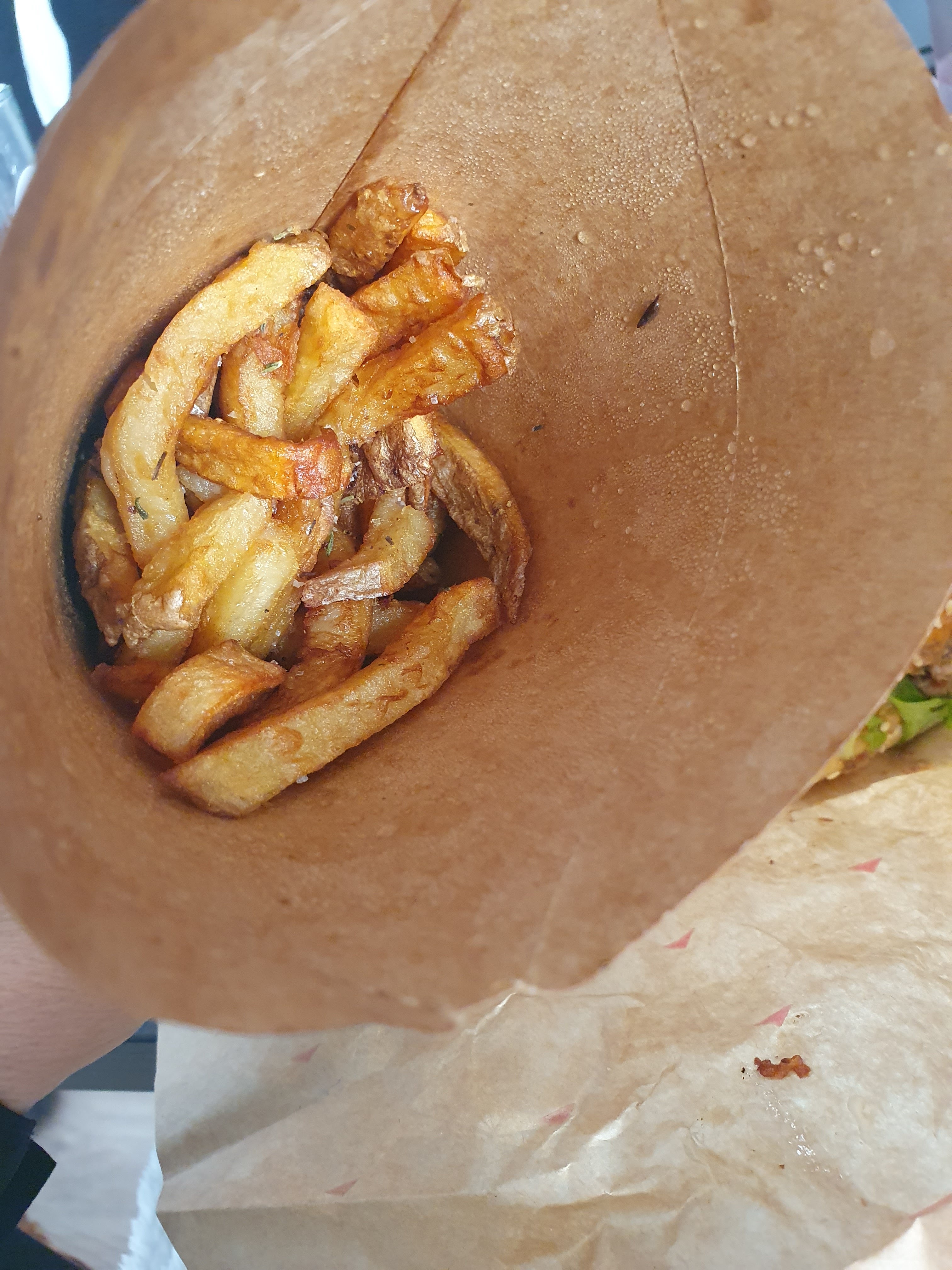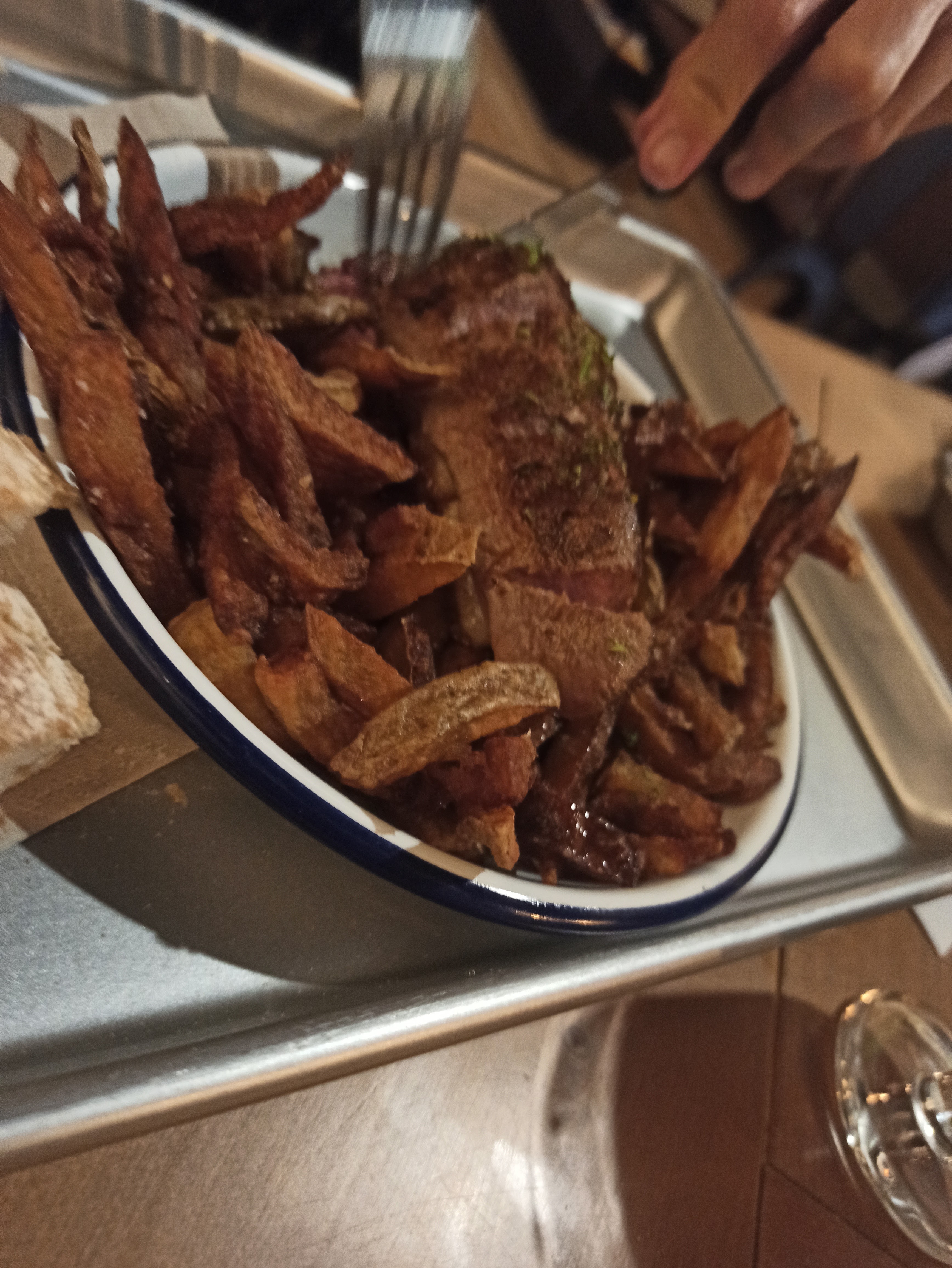 Frites trop cuites(bon exo pour la mâchoire), burger trop petit, on nous sert meme pas à table. La déco elle est pas mal mais je mange pas la déco. Bienvenue à Bordeaux