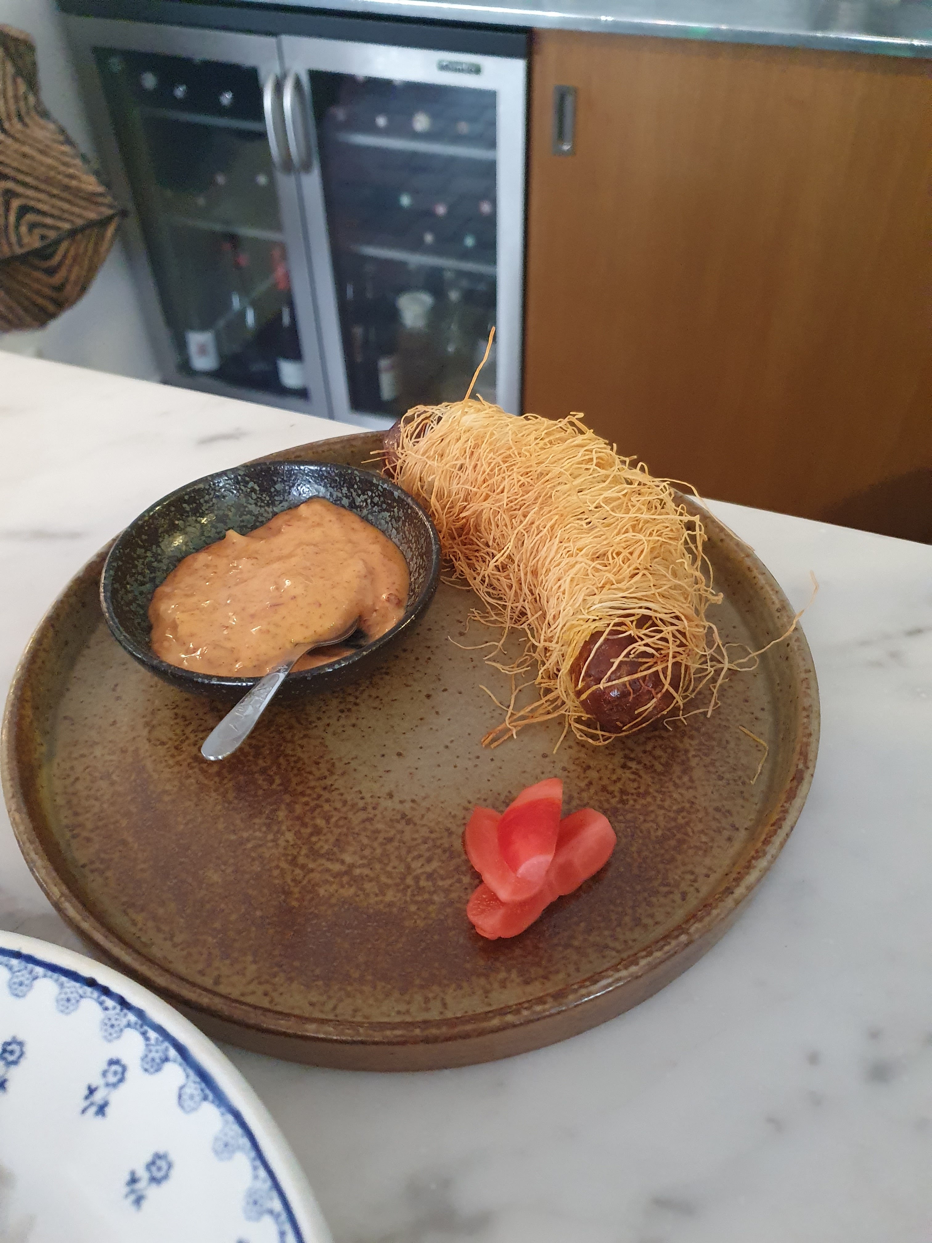Très belle adresse dans un cadre cosy et avec une décoration soignée. Nous avons passé un dîner très agréable, les plats étaient très savoureux et originaux. Mention spéciale pour la seiche en entrée et pour le shawarma de porc en plat qui étaient parfaitement cuit et assaisonné à merveille ! Seul petit bémol de la soirée: l’attente entre les plats. Cela est peut être due au fait que le restaurant était complet et que l’équipe était peu nombreuse en salle.