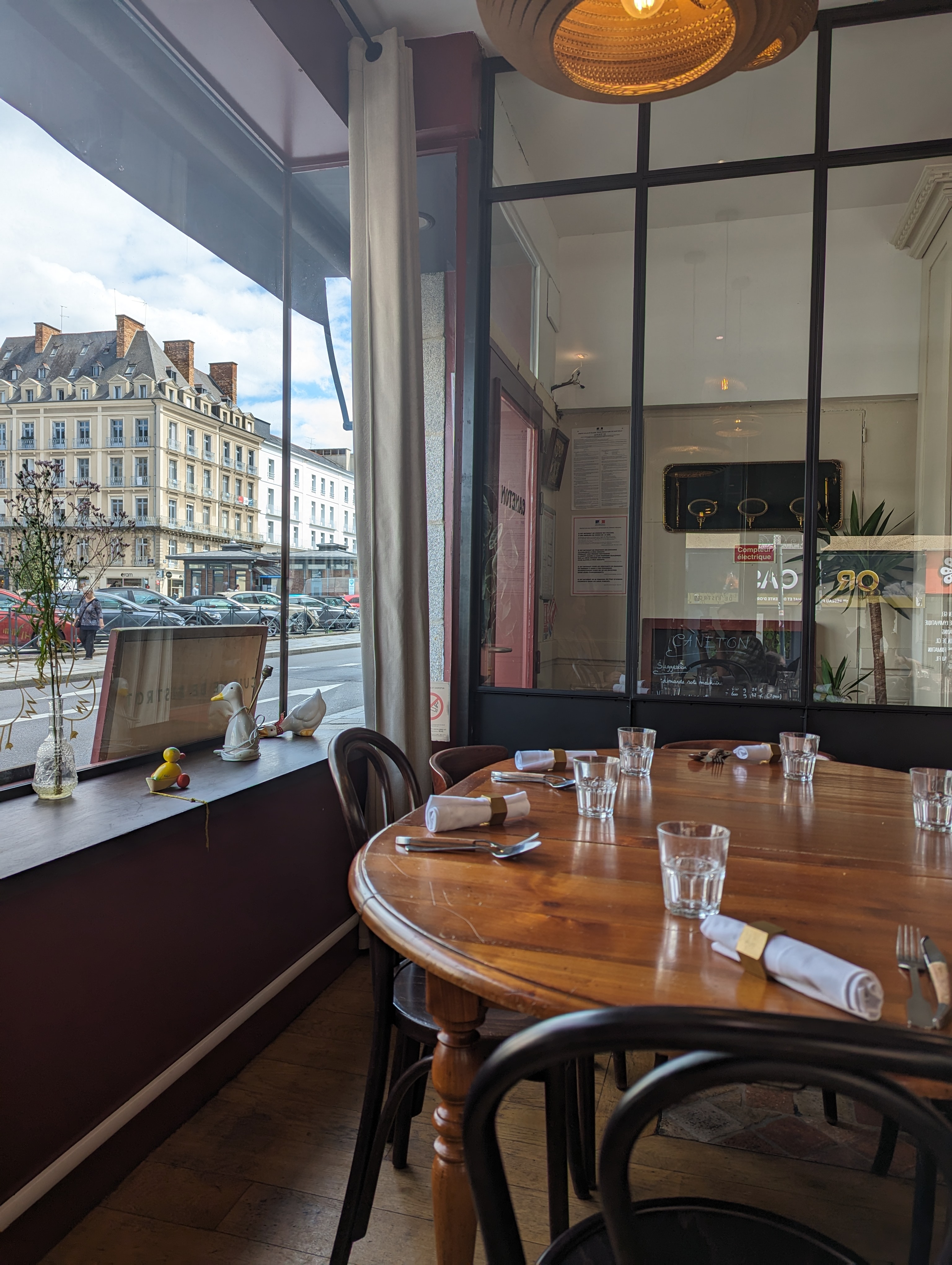Nous sommes venus dîner à deux chez Caneton un soir de début de semaine très calme. La cuisine est bonne, les produits sont locaux ou français et bien choisis. Nous avons pris deux entrées, quiche d'églefin,radis, coriandre…/burrata des pouilles tomates locales …, ensuite pour le plat deux rumsteak frites, légumes frais et sauce, puis en desserts une fantastique et gourmande ganache au chocolat, poires pochées, tuiles de sarrasin et une brioches perdue, pomme rôtie, crème anglaise à l’eau de vie de cidre. En ajoutant un verre de vin et un grand verre de limonade (2x(entrée/plat/dessert) nous avons payé 80€ soit 40€ chacun. Les serveuses étaient de bons conseils et sympathiques. Le lieux est charmant, j’ajouterai juste un “mais” au niveau de l’ambiance musicale très intrigante. Toutes les musiques sont bien mais nous n’avons pas compris le changement entre la musique jazz et douce à du rap old school américain ou des musiques de kanye west très “dynamique”. Nous avons mangé à la fois chez Canton et the big duck. Je recommande la cuisine Caneton si vous êtes sur Rennes. nb : photo très mauvaise qualité veuillez m’excusez.