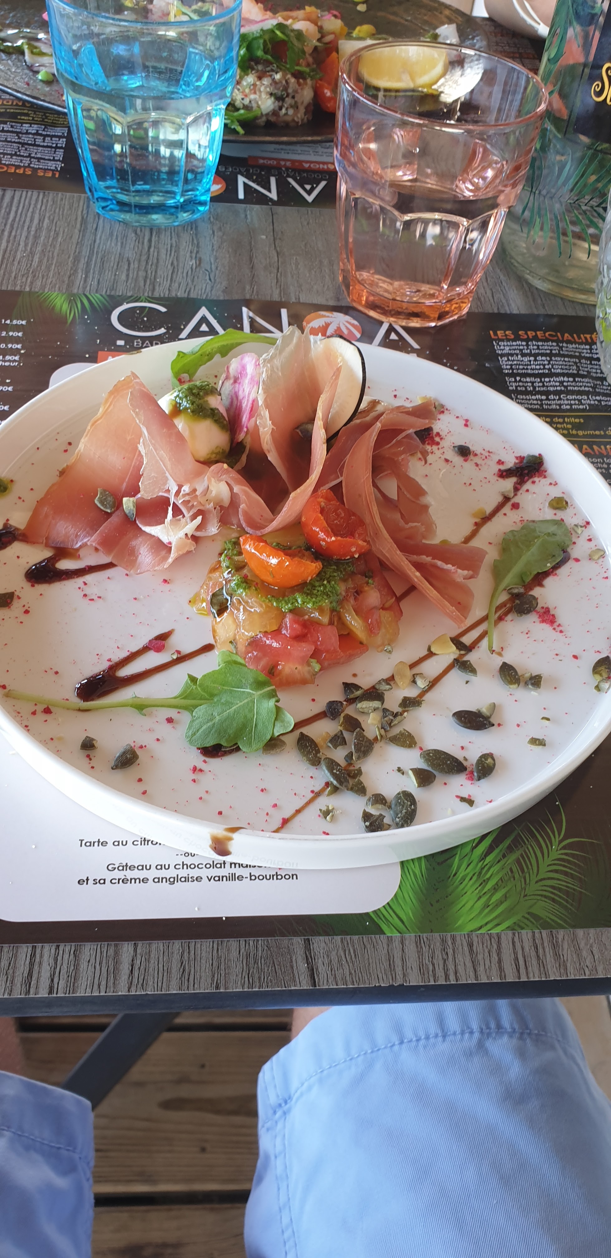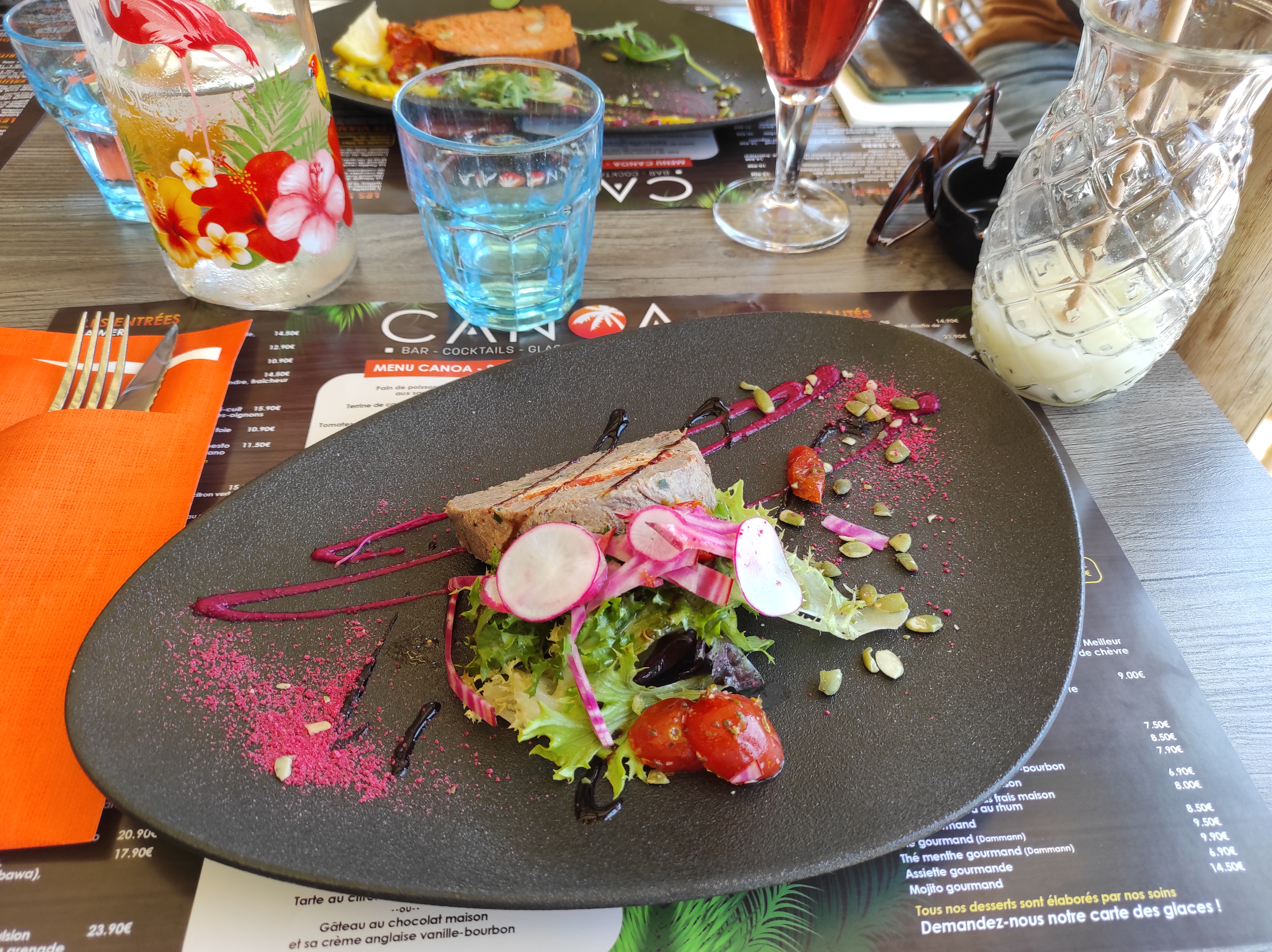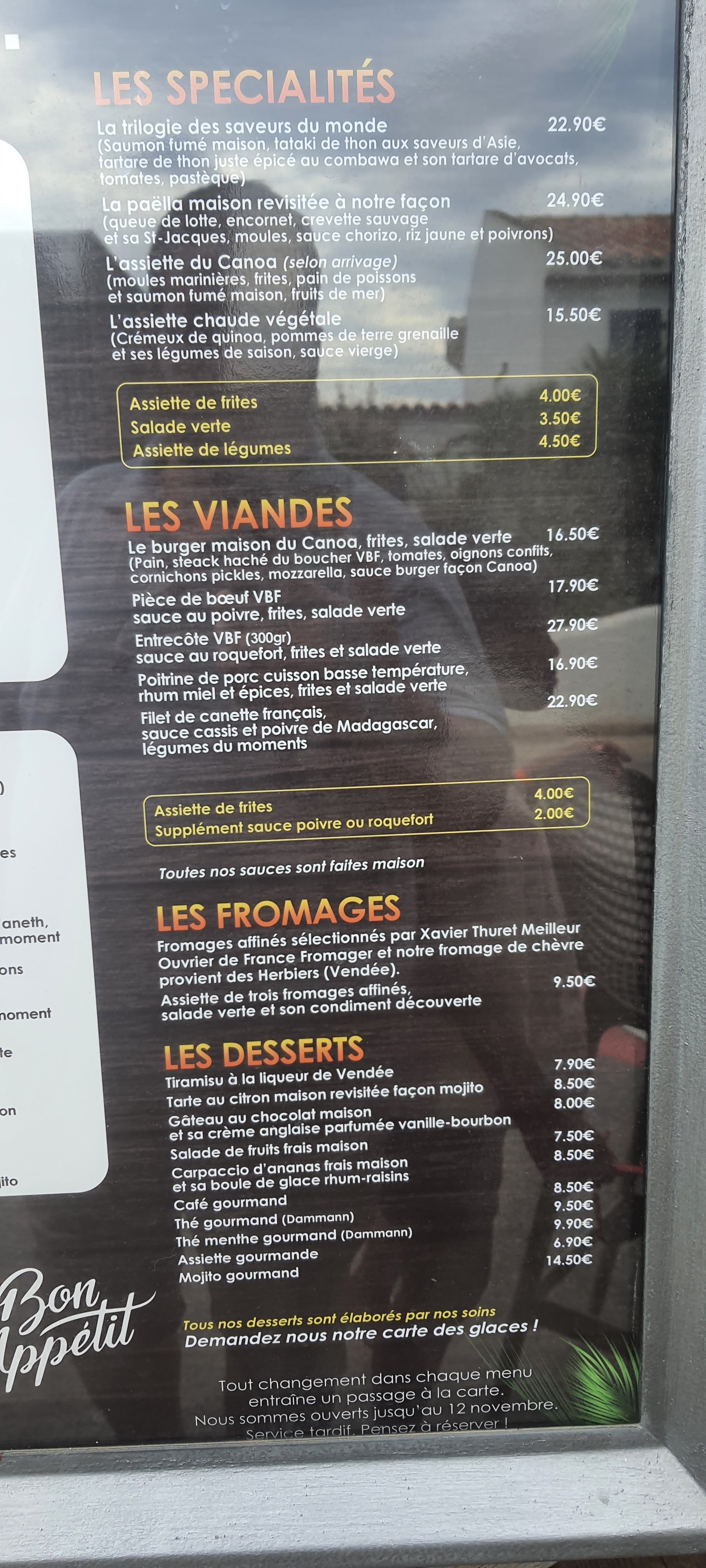 A chaque fois que nous séjournons sur Jard une petite visite au Canoa s'impose car le cadre est très agréable, décor original et proche de l'océan. Accueil très sympathique du patron et le personnel toujours souriant et à l'écoute. Régal pour les yeux avant les papilles. Les plats sont raffinés et savoureux de l'entrée au dessert. Avec l'apéritif amuse bouche maison offert avec toasts : un délice. Ce midi nous avons déjeuné en terrasse et avons opté pour : le foie gras de canard marbré maison et son chutney mangue-hibiscus, le filet de canette sauce miel romarin au poivre de Madagascar et ses légumes du moment, carpaccio d'ananas frais et sa boule de glace. La terrine de canard et son cœur marbré aux fruits confits à la troussepinette de Vendée, la poitrine de porc cuisson basse température sauce rhum miel épices avec frites et salade verte et tiramisu à la liqueur de Vendée. Il n'y avait plus rien dans les assiettes. Je vous recommande les yeux fermés