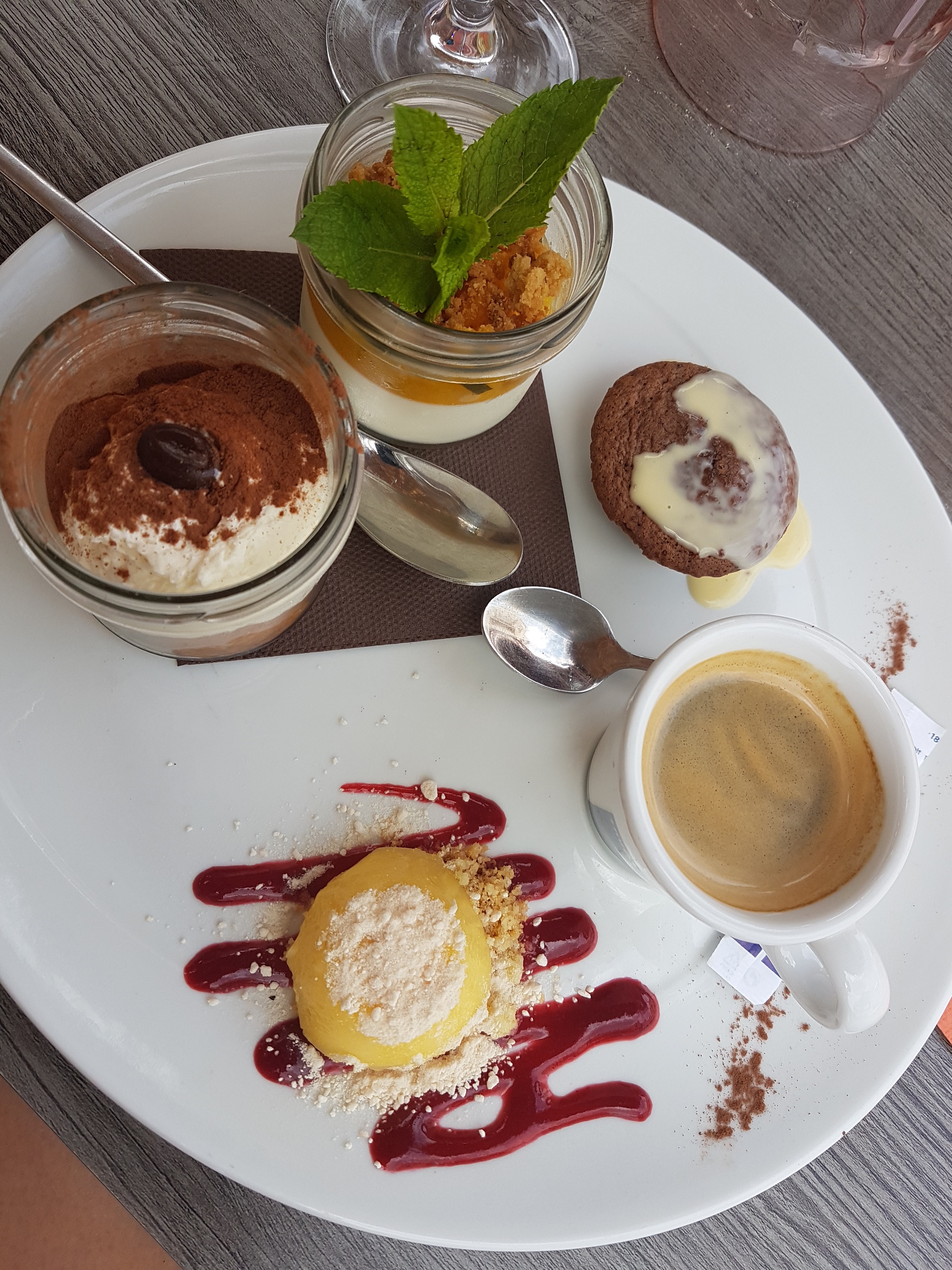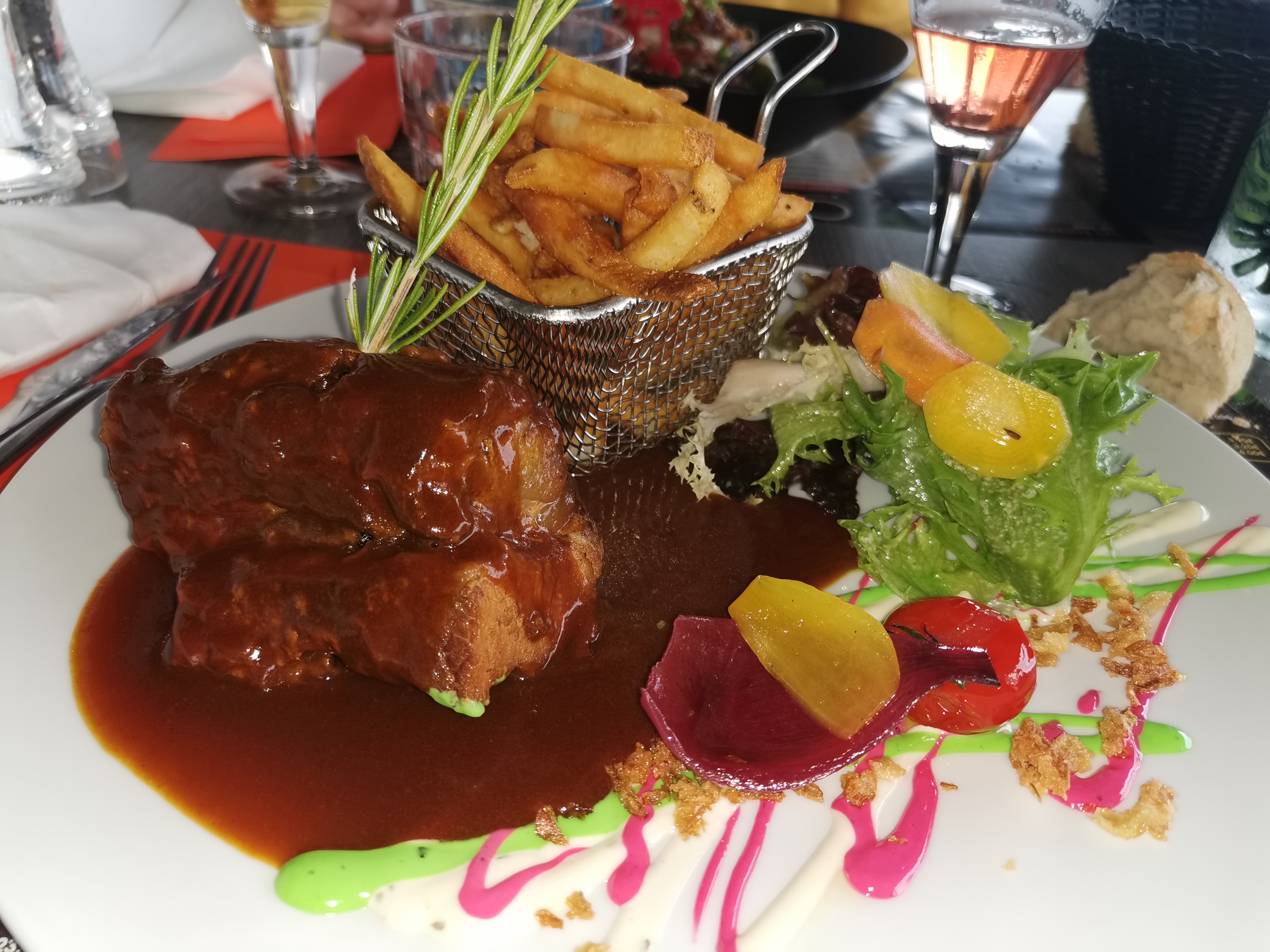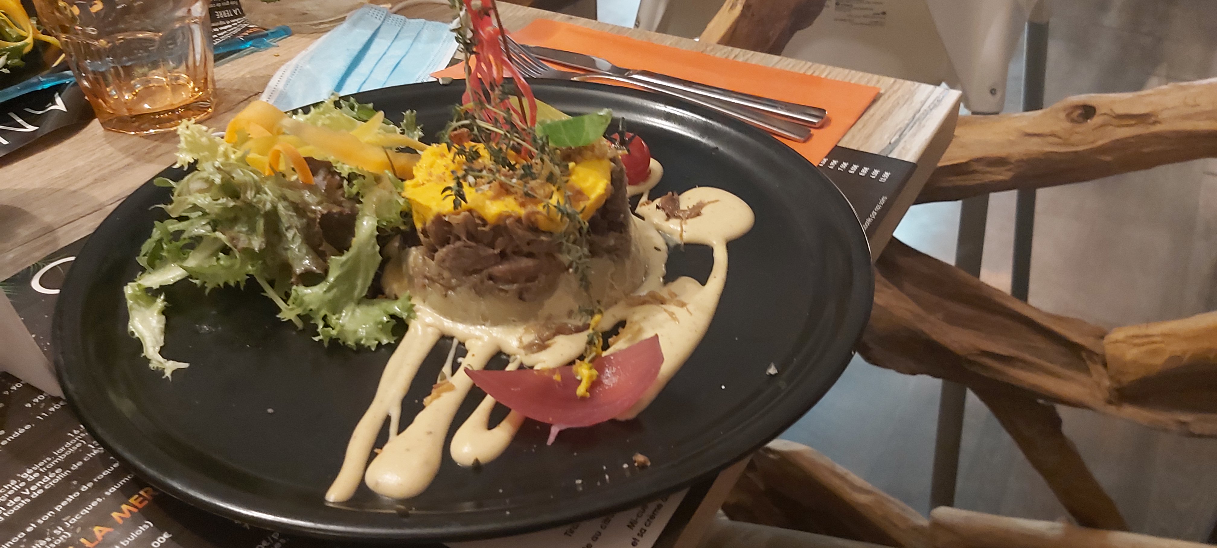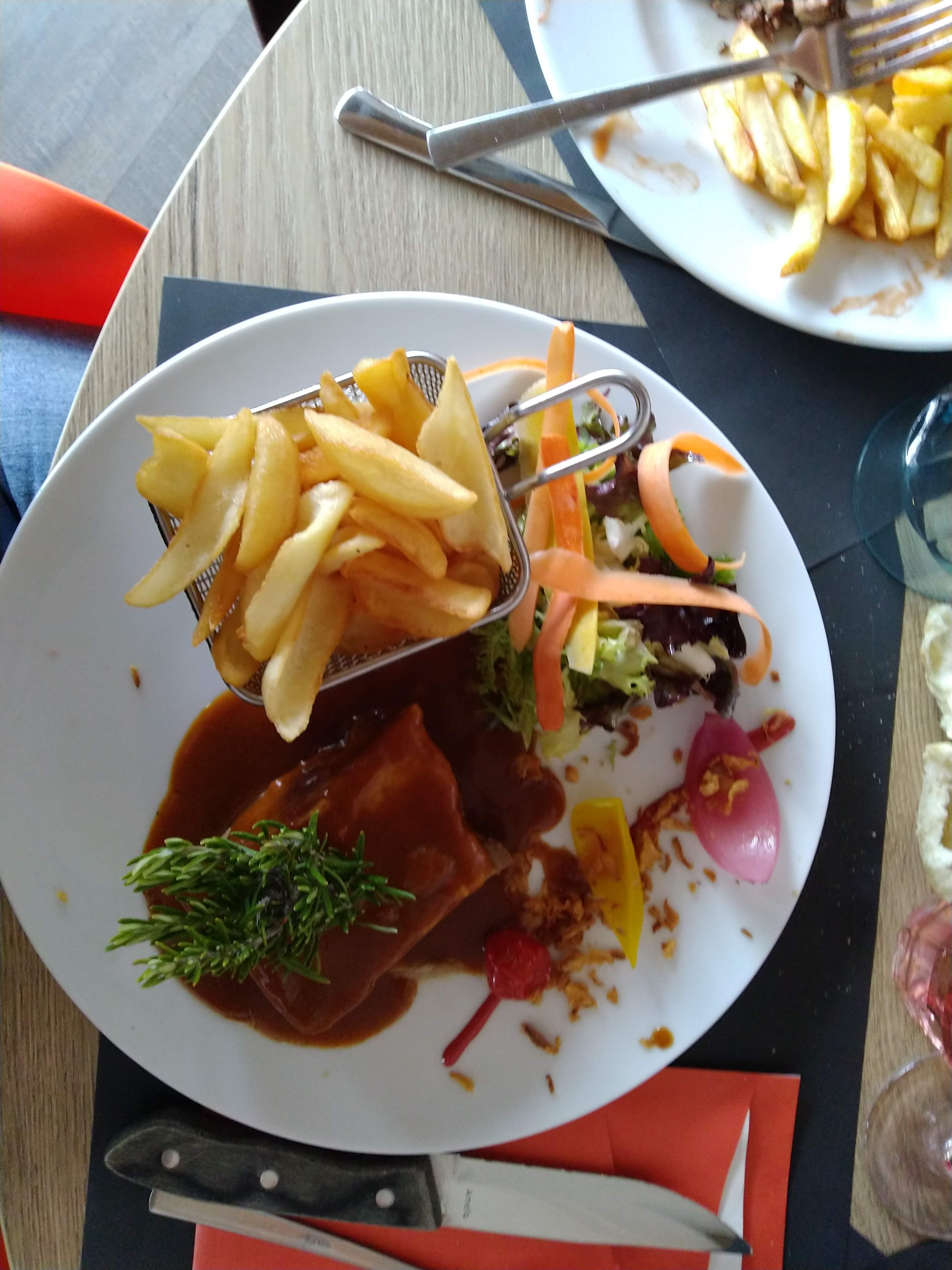 On a très bien mangé. On s’est fait chasser de notre table pendant le digestif par la serveuse puis par le patron car il y avait le 2e service. Ledit patron nous a dit de revenir en Septembre. C’est devenu l’usine, dommage.