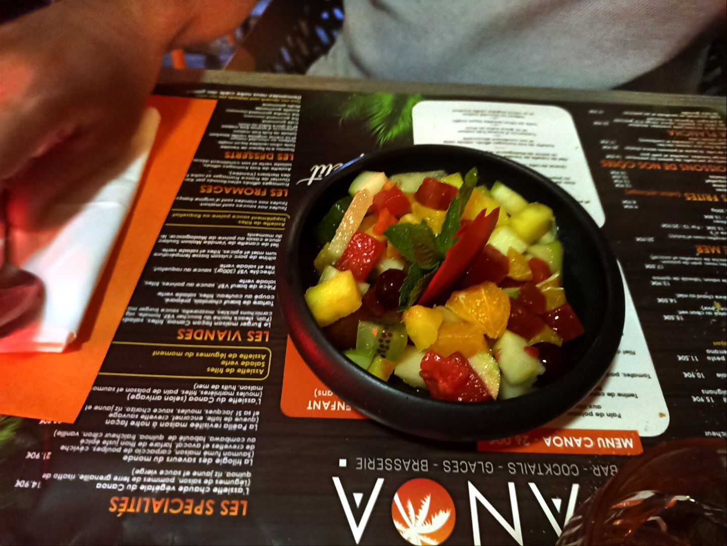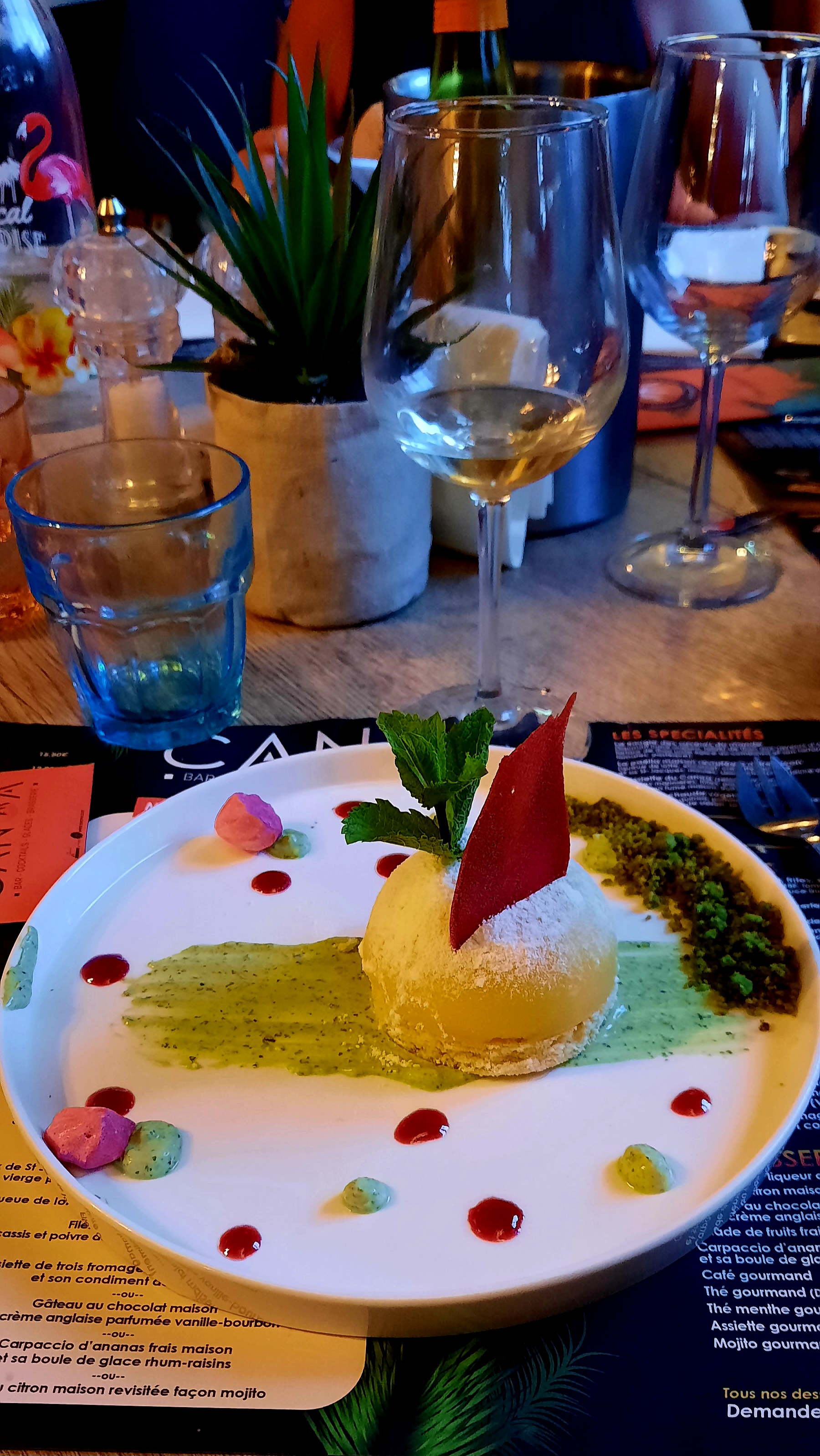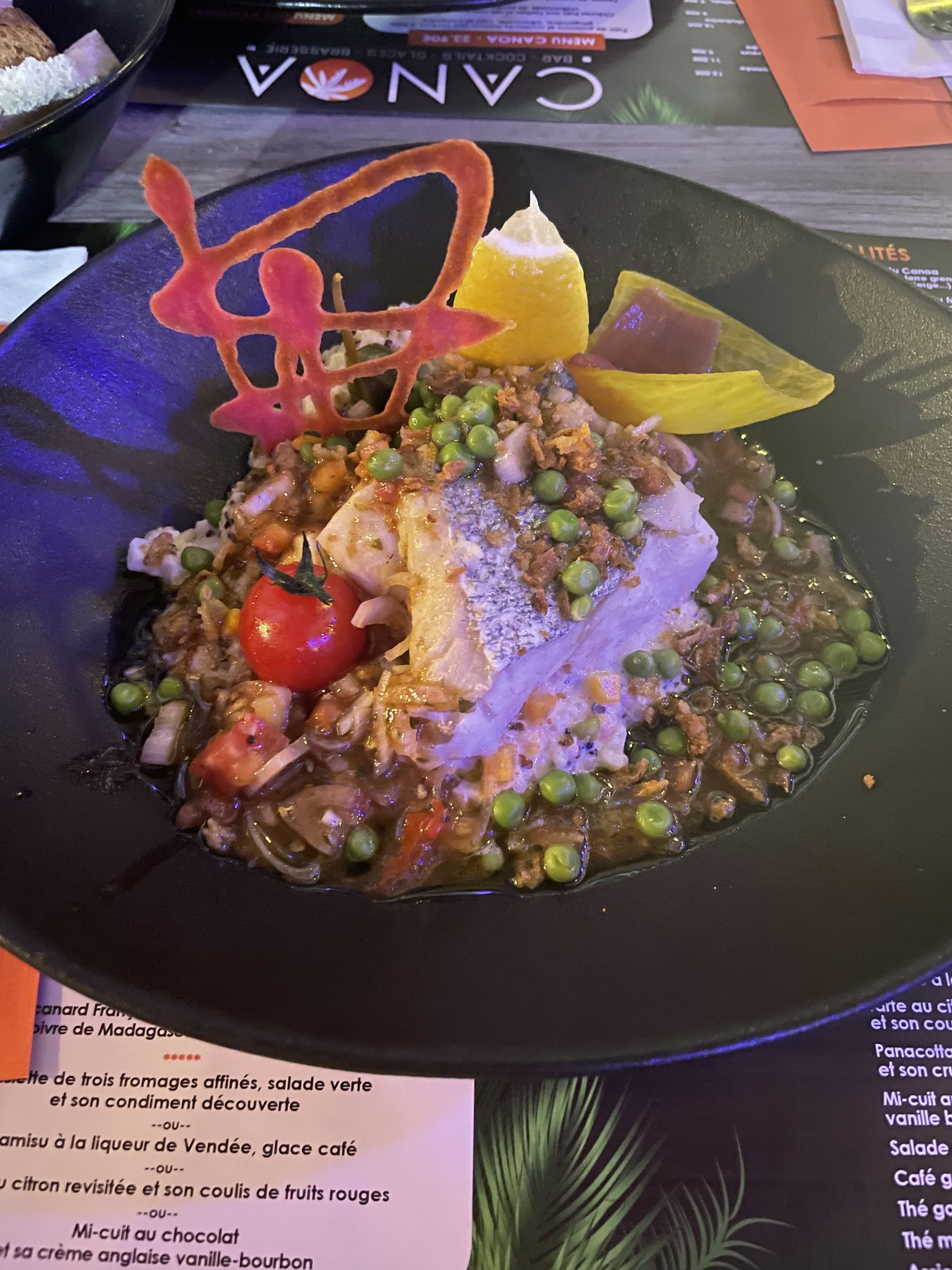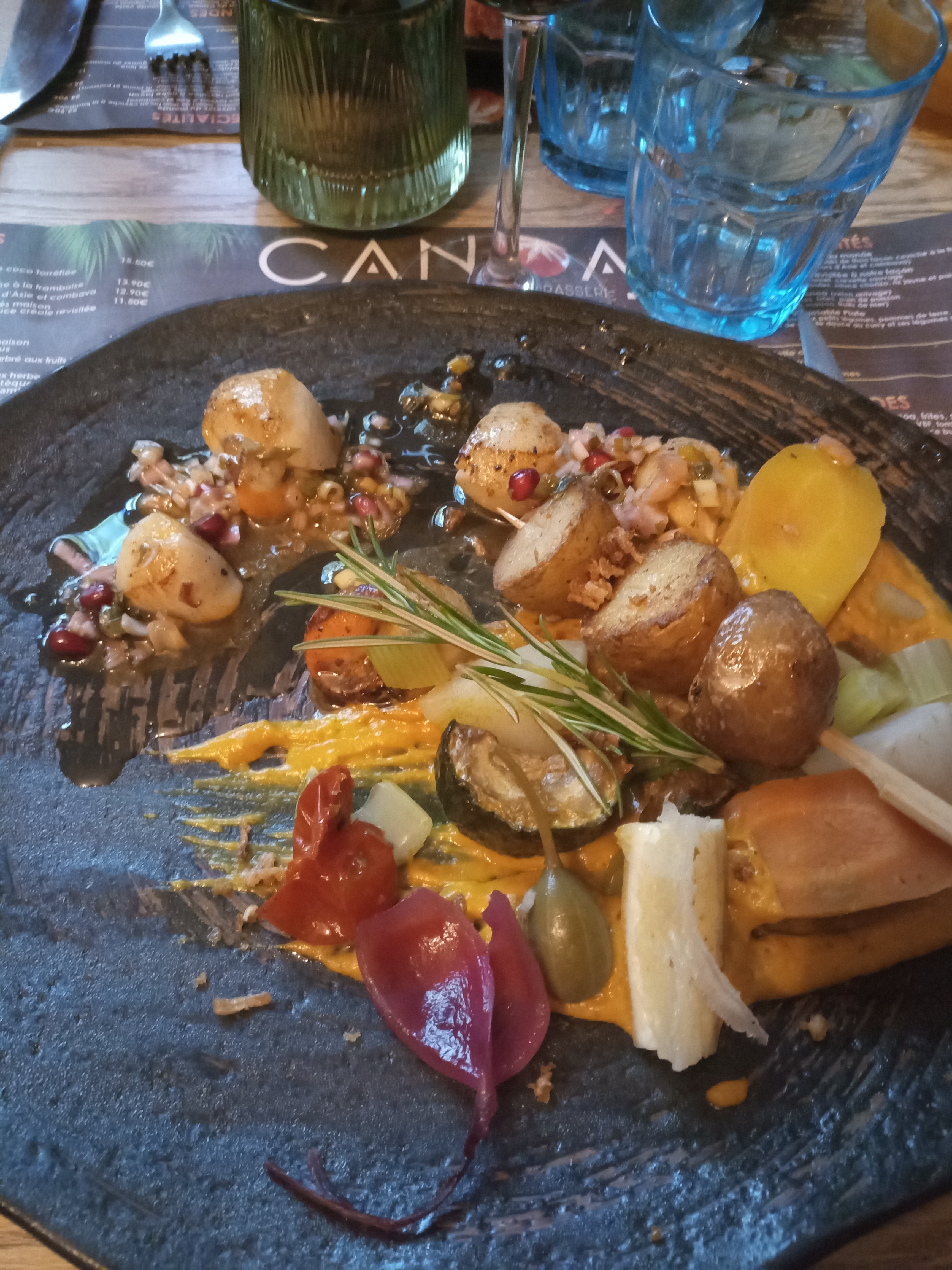 Encore un passage au canoa. Et… encore des nouveautés. Saucisson antillais en grignotage. Baba au rhum en dessert. Risotto de blé, et j’en passe. Merci de vous renouveler sans jamais changer. À bientôt !