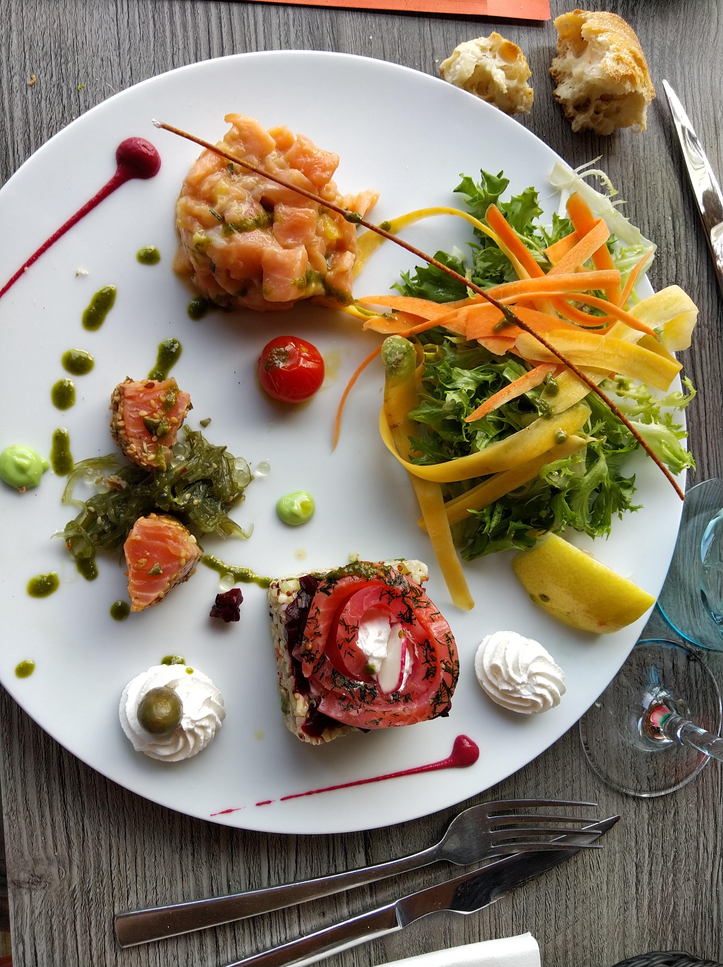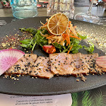 On as goûté à la trilogie aux fusions des saveurs du monde (saint Jacques, thon, saumon…). Plat froid, produits de qualités, nous nous attendions à un voyage plus épicé. Excellente tarte au citron revisitée. Service agréable à refaire pour continuer le voyage.