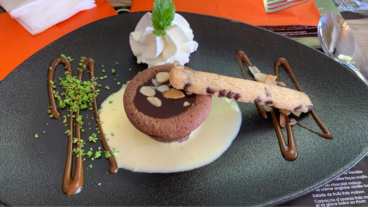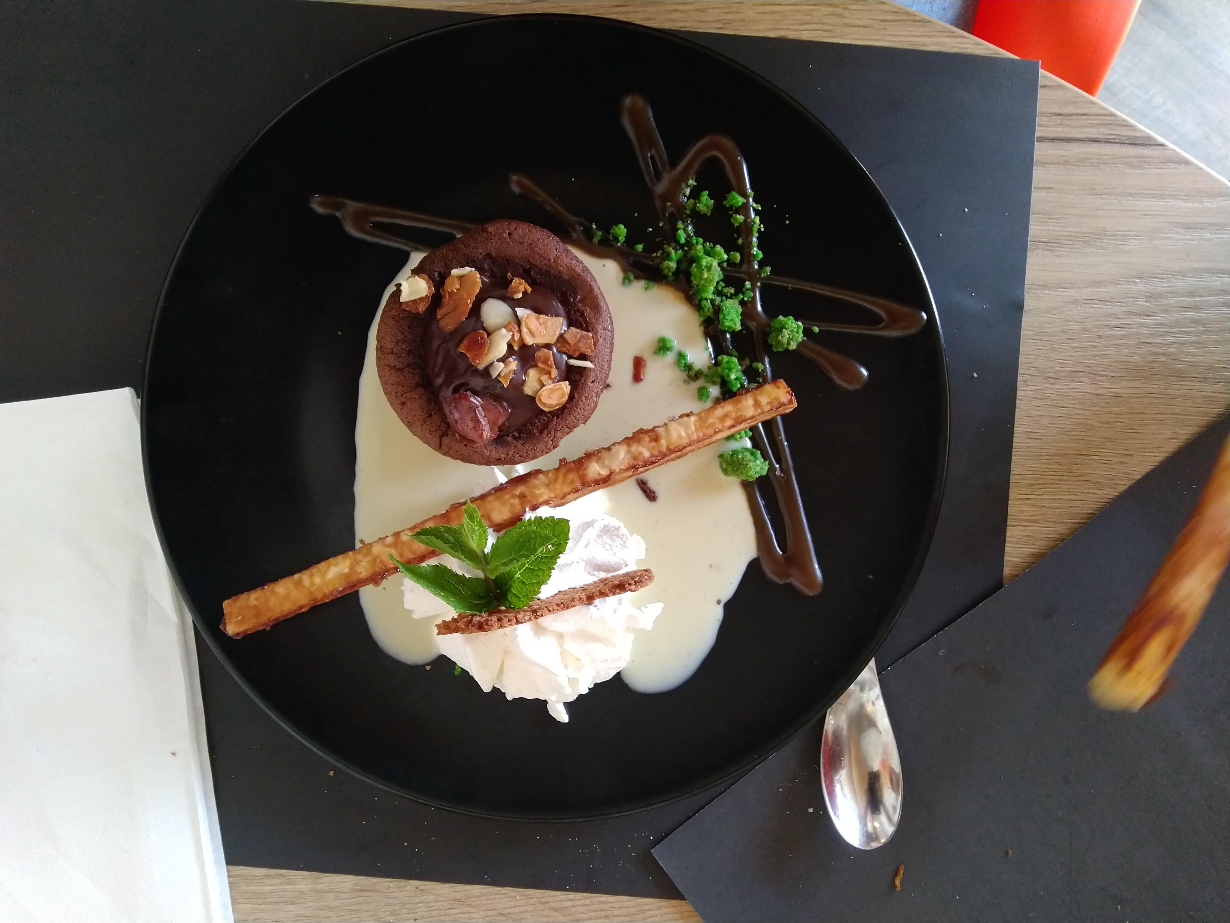 Personnel aimable, Les plats sont bons et bien présentés, Amuse-bouche agréable avec l'apéritif, Nous ne sommes pas fan du quinoa mais le filet de merlu est bon, Le moelleux au chocolat est très bon, Un bon moment.