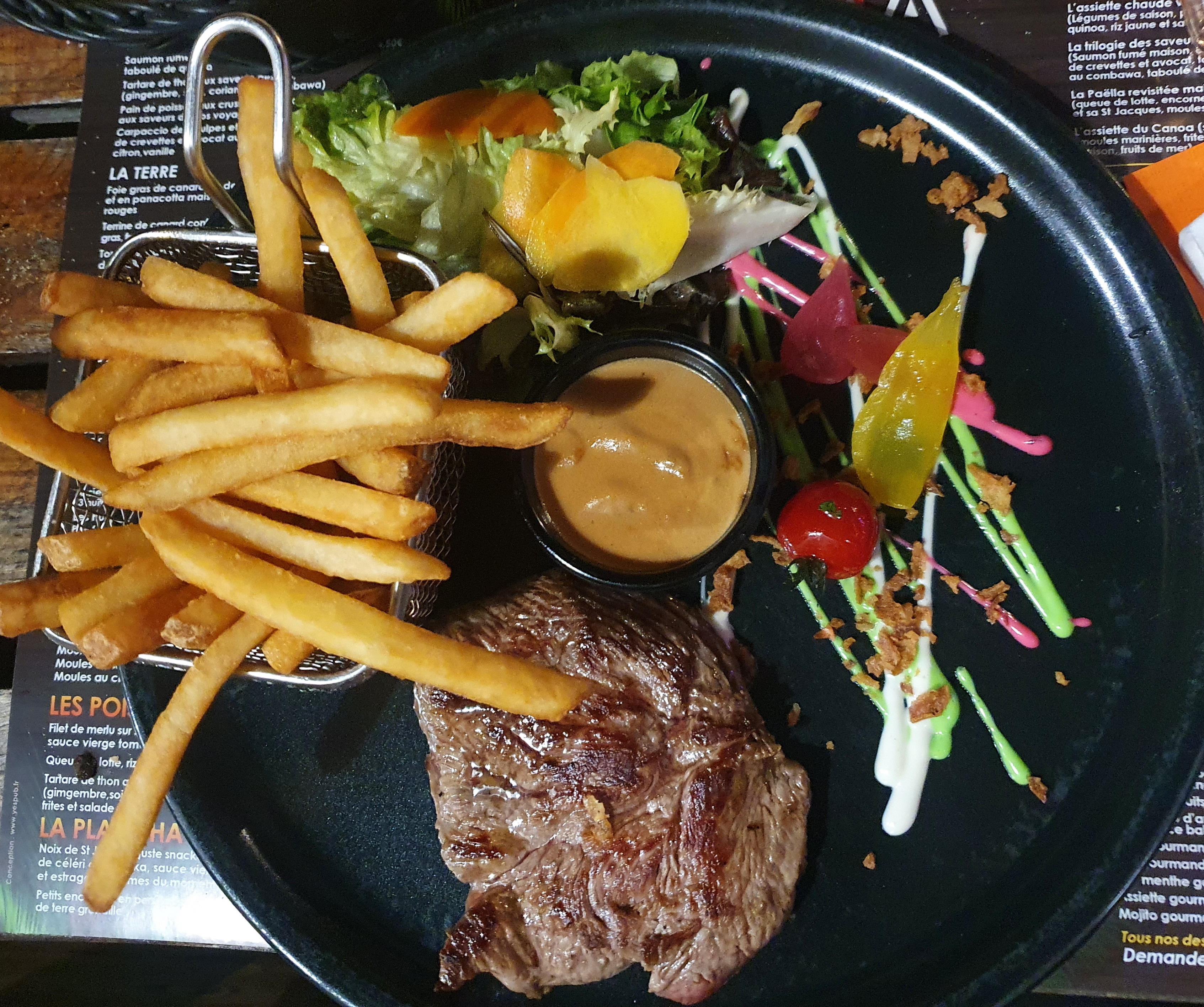 Joli cadre, pas a la portée de toutes les bourses!! Pris une pièce de bœuf avec des pomme grenailles ( équivalent de 2 petites pomme de terres prises en photos, trop juste à mon goût en quantité), le mojito a 7€90 ça commence à piquer beaucoup !! Vous êtes dans la salle et vous supportez les aller-retour des enfants du propriétaire avec leur chien, cest bien désagréable !!!