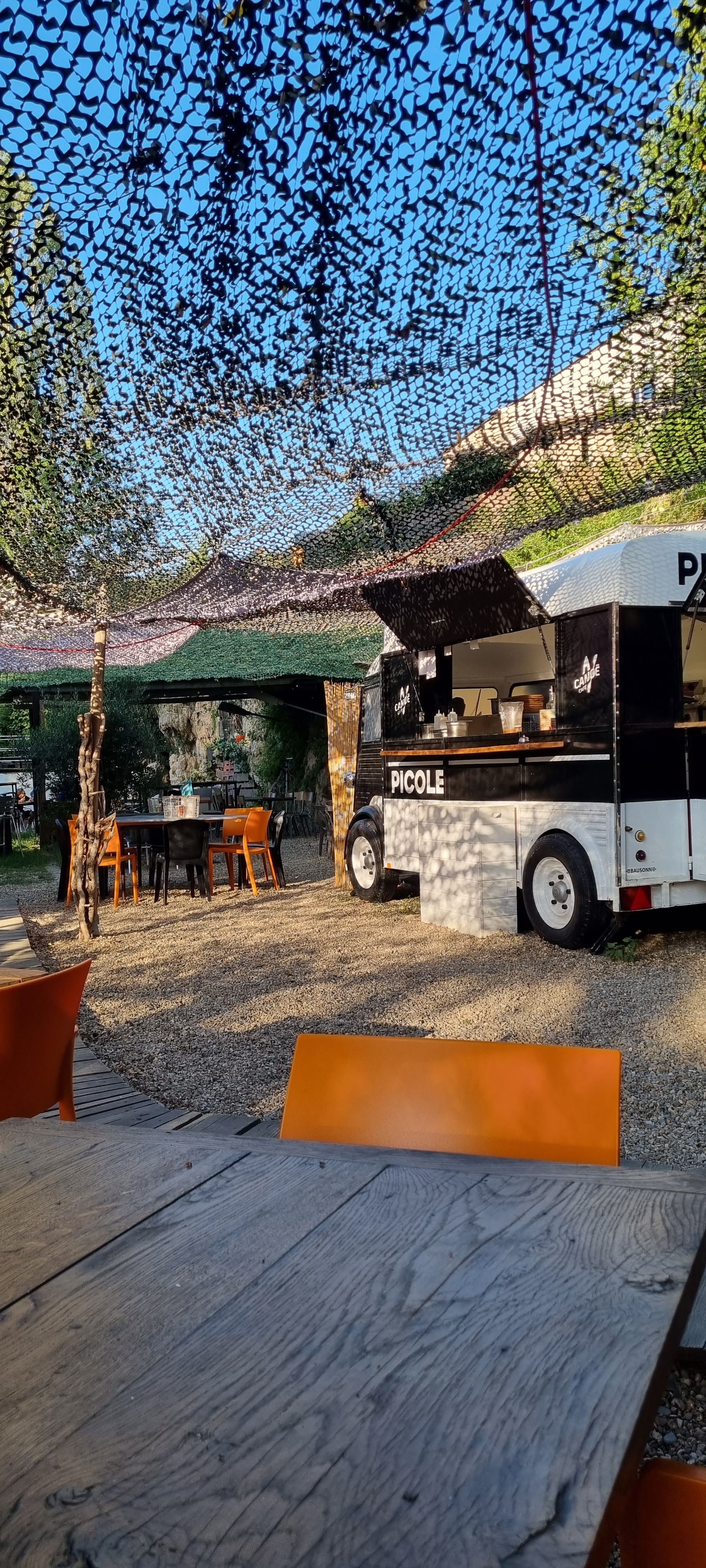 Restaurant insolite à la déco qui l'est tout autant. En bordure du Tarn, toutes les tables sont en extérieur, la cuisine, installée dans un Citroën type H transformé en food truck, est au contact des clients. La cuisine et le service sont à la hauteur des lieux: bon et original. N'hésitez pas si vous appréciez la bonne cuisine dans un cadre authentique. Bravo à l'équipe du Canoë Café. Rdv à notre prochain passage sur Millau.