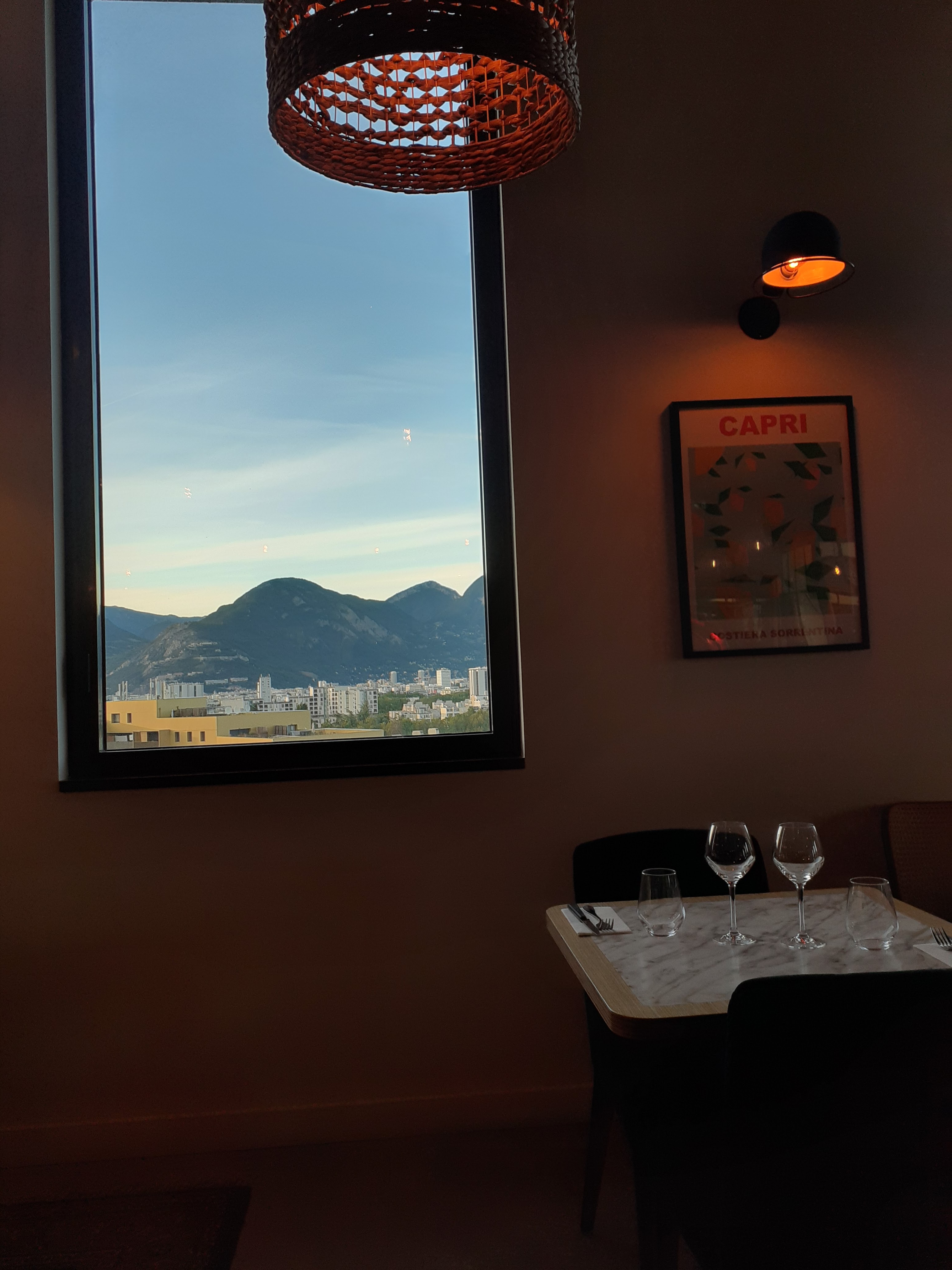 Lieu MAGNIFIQUE !!! une vue sur tous les massifs... mais on aime aussi regarder dedans (belle déco) et evidement dans notre assiette ! Testé le midi et le soir, 2 ambiances très agréables : lumineux le midi, et très cosi le soir avec le lumières de la villes. Repas délicieux et présentation soignée... Ne pas oublié de tester les cocktails signatures ainsi que les classiques.