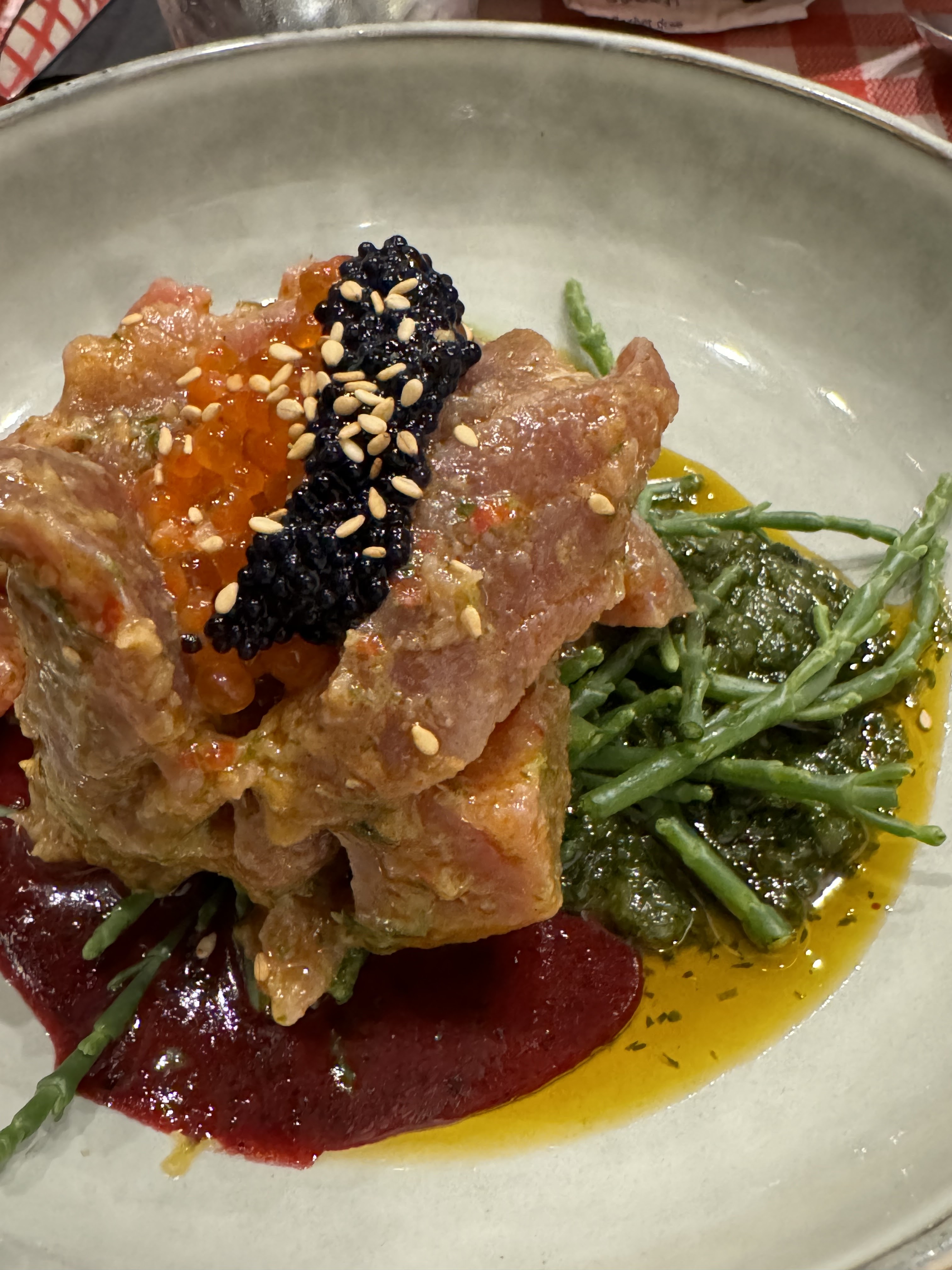Accueil très sympa, produits frais. En revanche j'ai peu apprécié le plat (tataki de thon, salicornes, ponzu, pomme granny et oeufs de poisson) car l'assemblage est trop salé et acide, et sans accompagnement je suis restée sur ma faim.