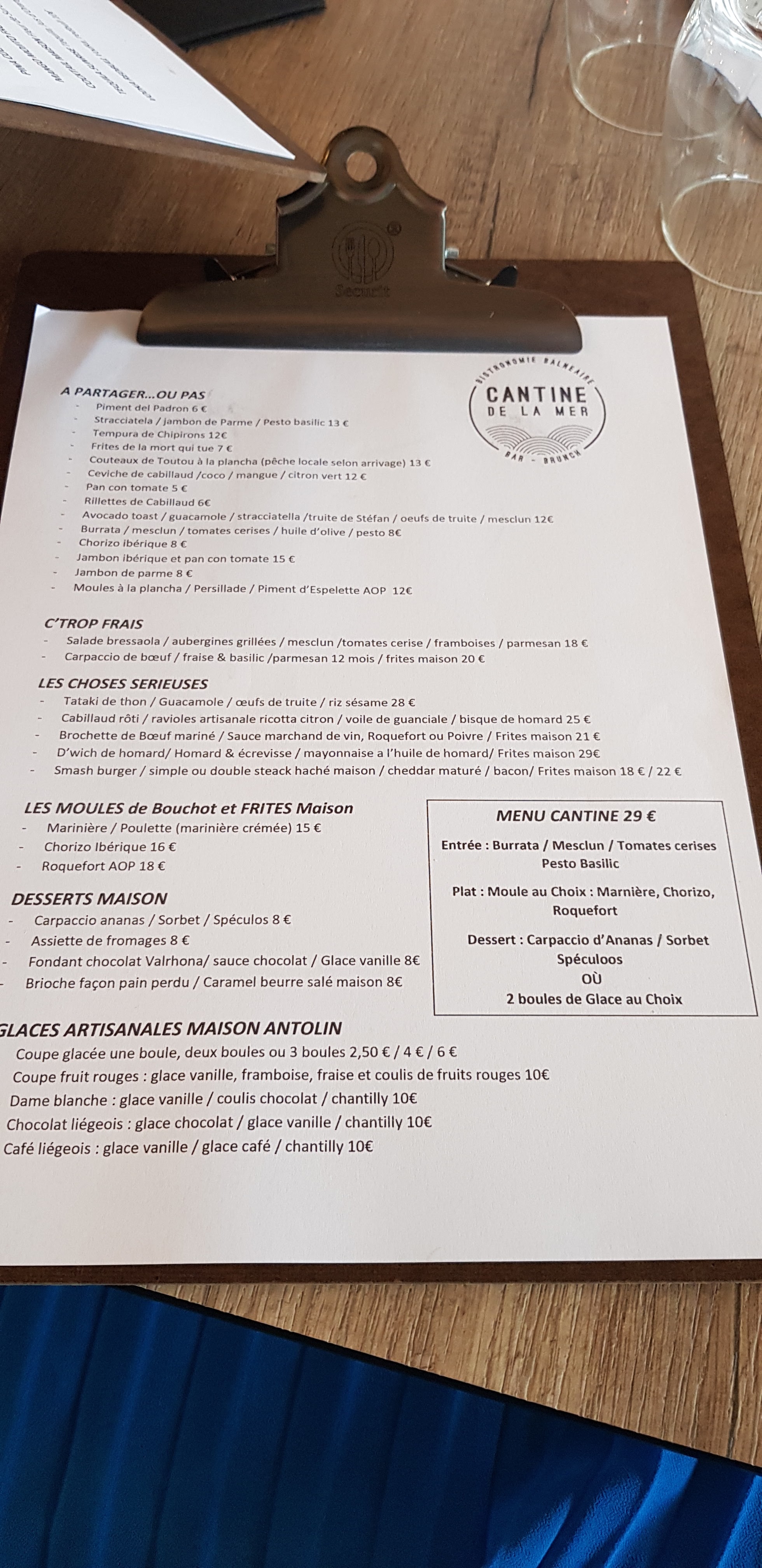 trop chouette Accueil toujours sympa et très bon avec produits de la mer ou de la terre. Y'en a pour tout le monde et fait maison J'adore !!!! On cherchait un resto sympa après le désastre des resto du camping layole ( pour ceux qui sont à ce camping vous comprendrez ce que je veux dire ) Venez tous à la cantine de la mer c'est juste à côté et ils vous accueillent à bras ouverts et à l'ombre ! Bravo!
