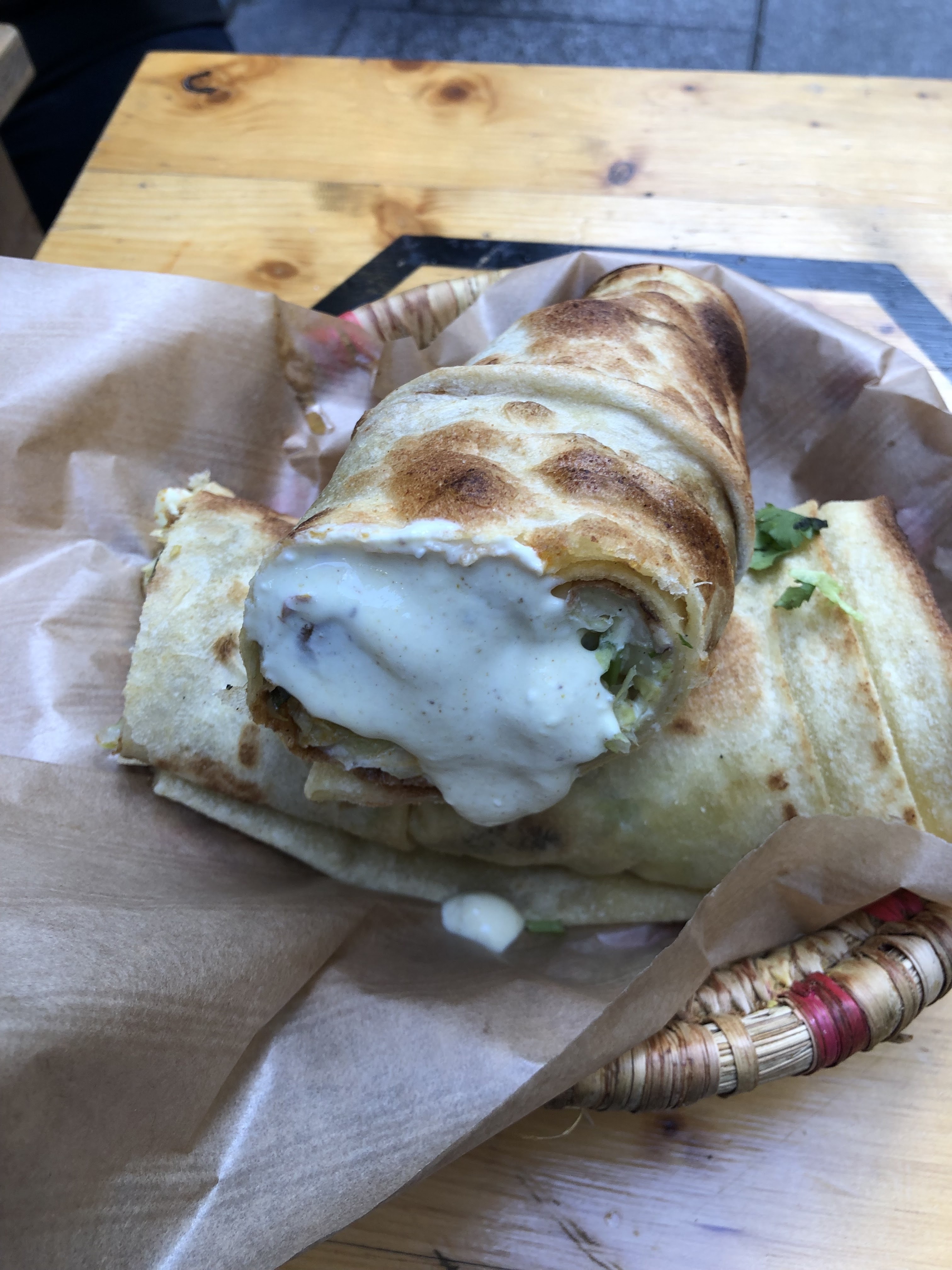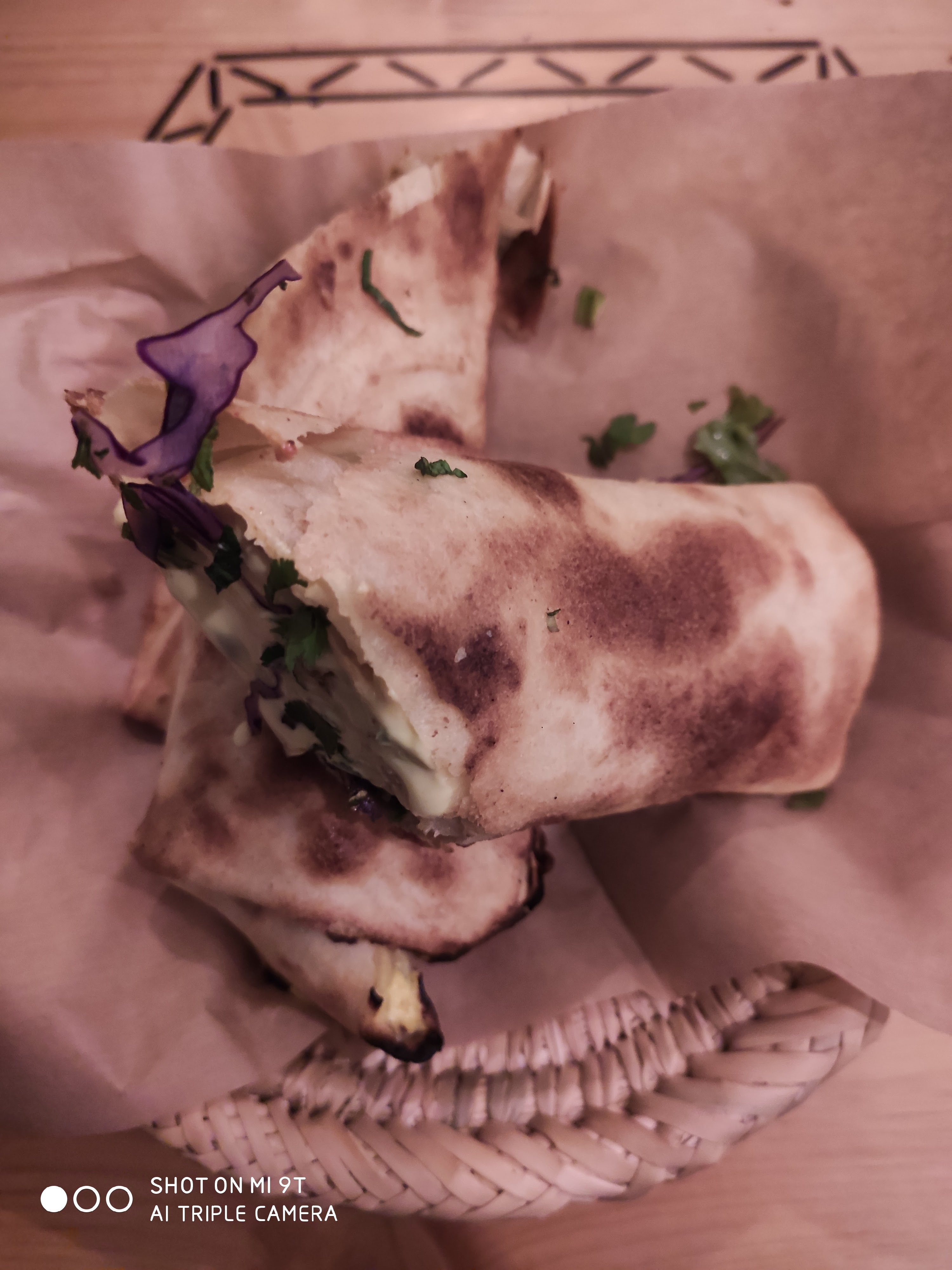 Le restaurant est tout petit mais vous permet tout de même de manger sur place. Le service est rapide, ce que est extrêmement appréciable. Les plats sont excellents. Nous avons adoré le sandwich en galette, les portions sont vraiment généreuses, je vous recommande d’en partager un pour deux si vous n’êtes pas de gros mangeurs.
