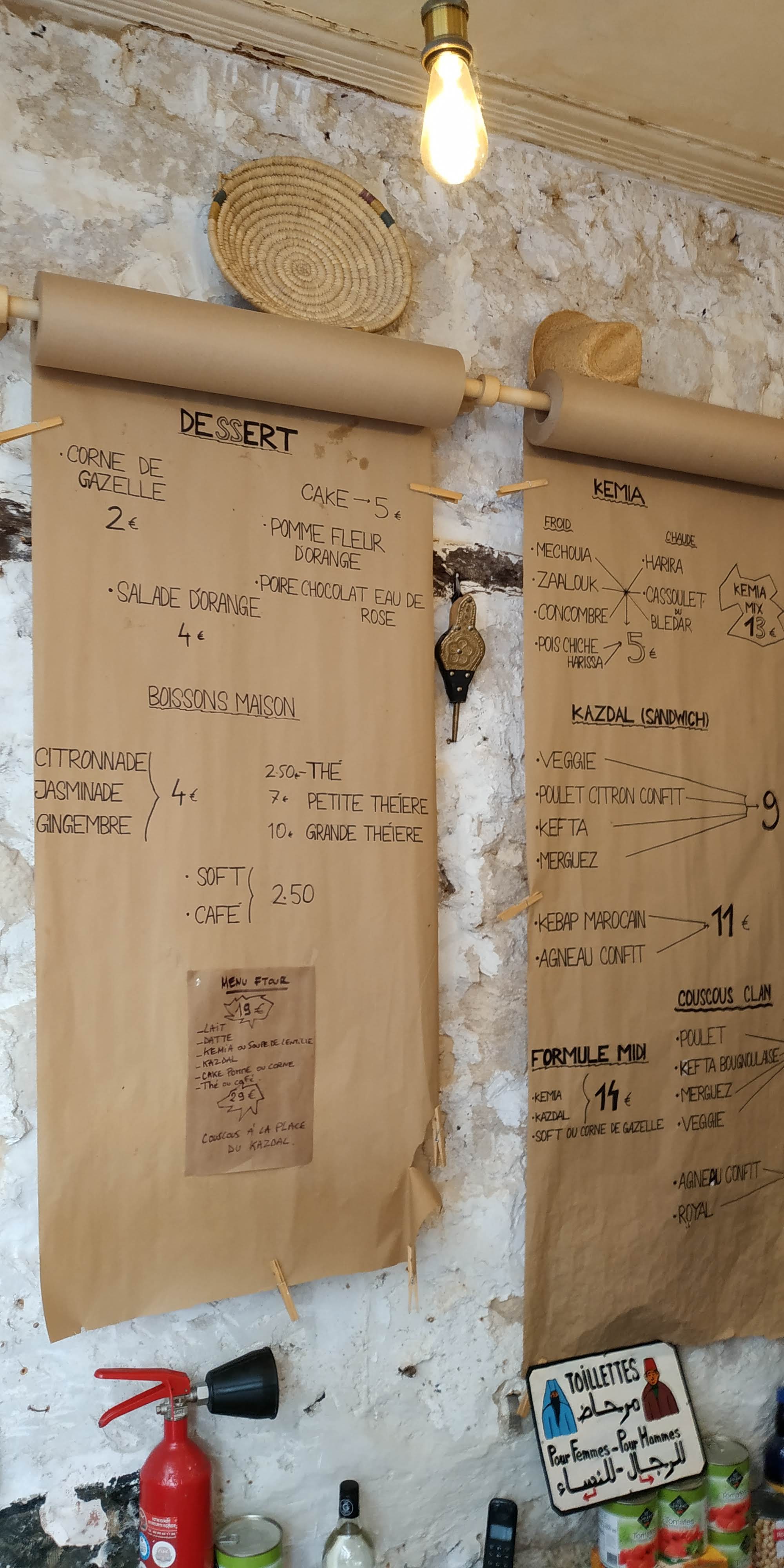Vu hier soir tard, testé ce midi pour un Kazdal (sandwich) Poulet Citron confit et pas déçu 😜 Le pain est remplacé apr des msemen, sorte de galettes feuilletées mais souples, cuites sur plaque chauffante. J'ai adoré, et y retournerai pour goûter le couscous ou encore les kemia (sorte d'amuse-bouche, assortiments à partager. Ils sont 2 dans la boutiques, pas très bavards mais gentils et serviables. C'est tout petit à l'intérieur, mais une dizaine de places assises si on partage les 2 tables 😉 Et s'il fait beau, une petite table 2 places en formica à l'extérieur. Tout est fait maison et à la commande, on attend donc un peu mais pas trop et surtout ça en vaut la peine. Testez, c'est une valeur sûre !