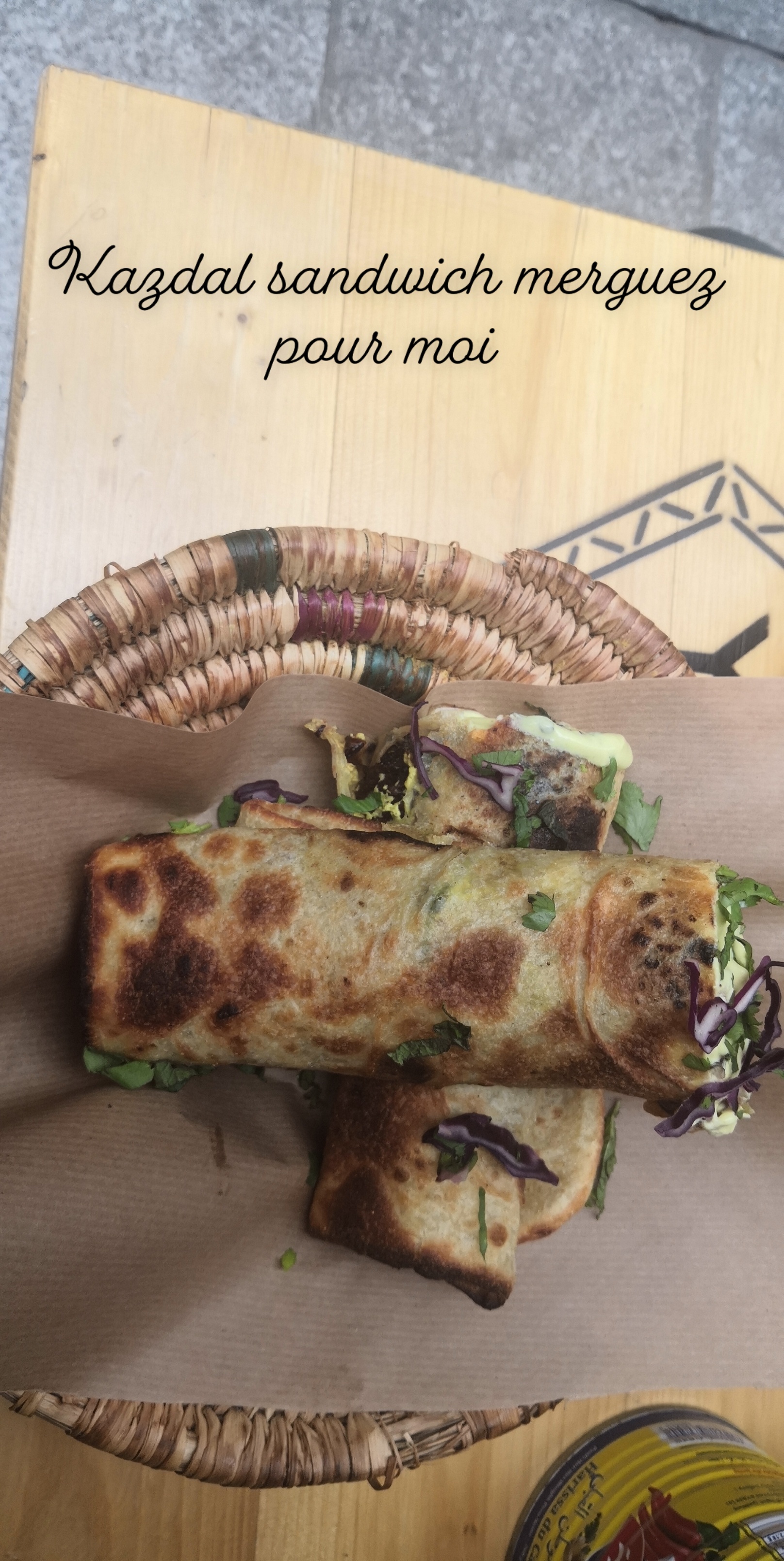 J’ai pu tester le kazdal kefta (sandwich dans un pain msemen). Il était bon sans plus Le goût de la viande un peu trop prononcé à mon goût. Dans celui poulet olive: il y’a fort goût d’épices « ras el hanout » donc à éviter si on est pas fan. Compter entre 9&11€ le sdw. La deco de la boutique est bof: on a une table remplie de sac d’épice et d’huile, cela aurait pu être charmant si ça avait été des produits artisanaux et non pas acheté chez le grossiste metro