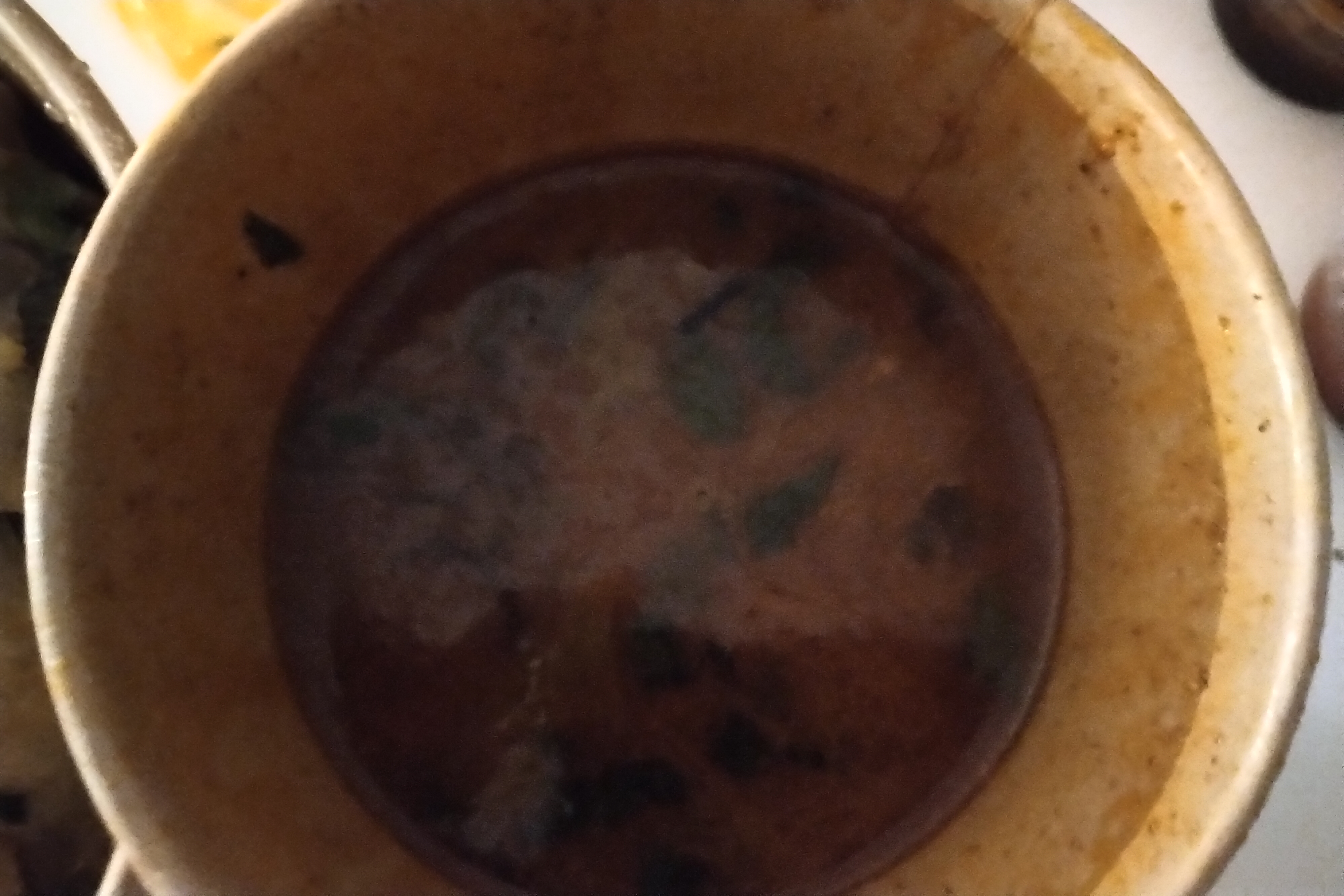 Couscous royal en commande Uber eats. Oubli de la tfaya et cadeau d’un beau long cheveu chatain clair sur le couscous juste en dessous du couvercle de protection.