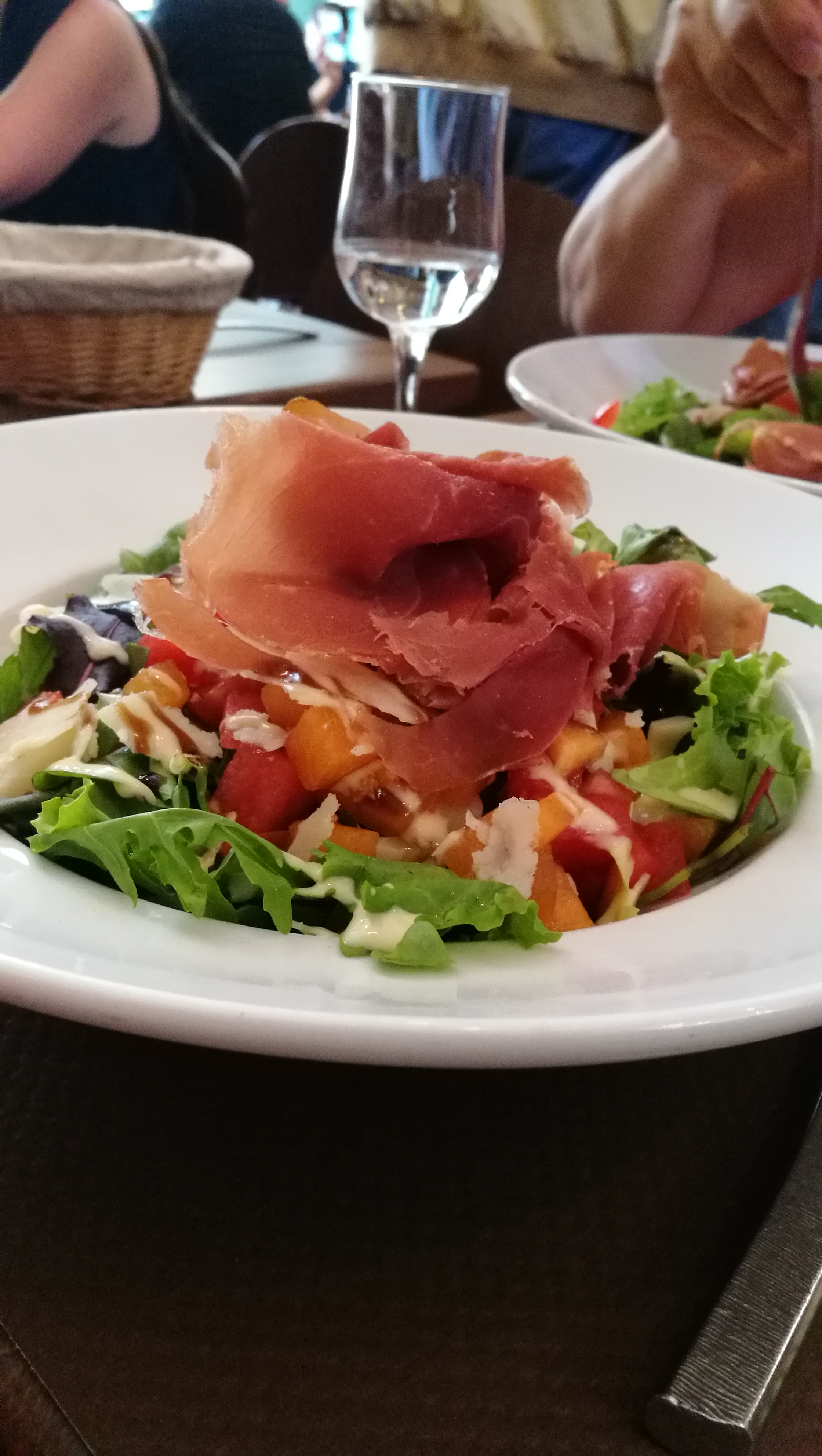 J'ai pris la salade du jour, elle était délicieuse et rafraîchissante en ce jour caniculaire. J'ai ensuite continué avec un tiramisu et là ... déception : trop de biscuit, pas assez de crème, pas assez frais, bref je ne retiendrai que la salade