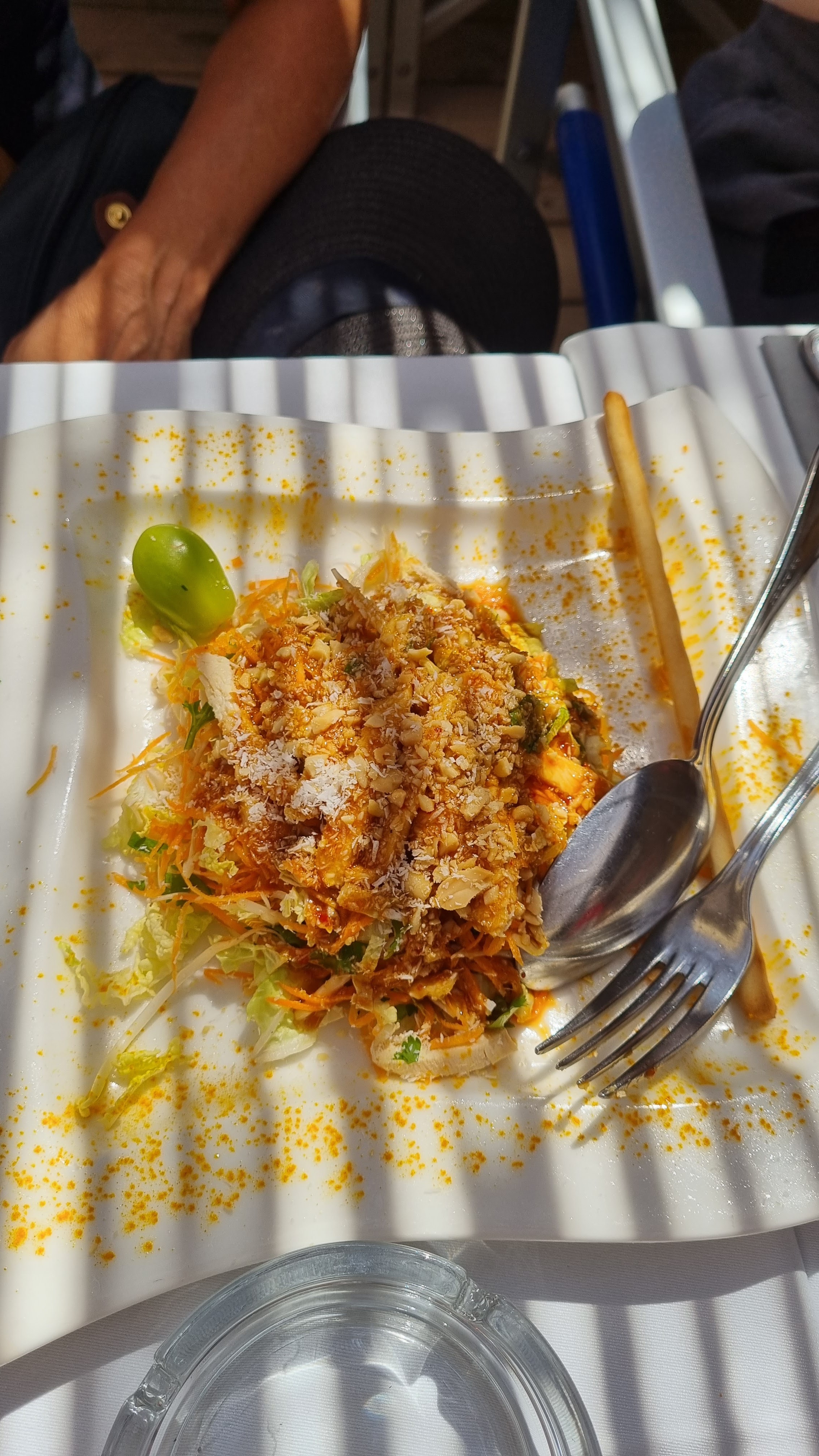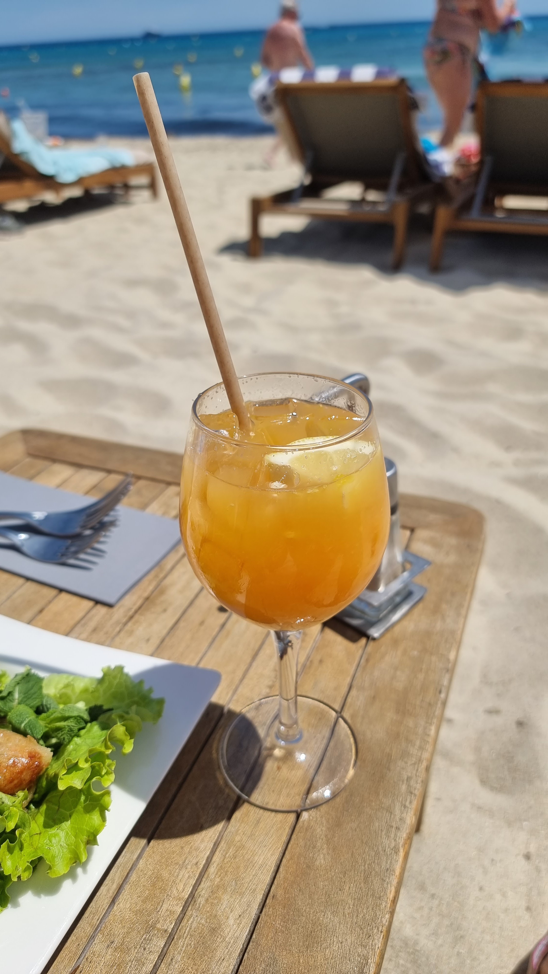 J'aurais aimé avoir un restaurant sur la plage comme celui-ci. Ça doit être une mine d'or ! Quoi qu'il en soit, finie la jalousie, nous avons chacun eu une excellente salade, du vin et une vue sur cette jolie plage. Cela vaut vraiment le détour pour s'éloigner de l'agitation de la ville.