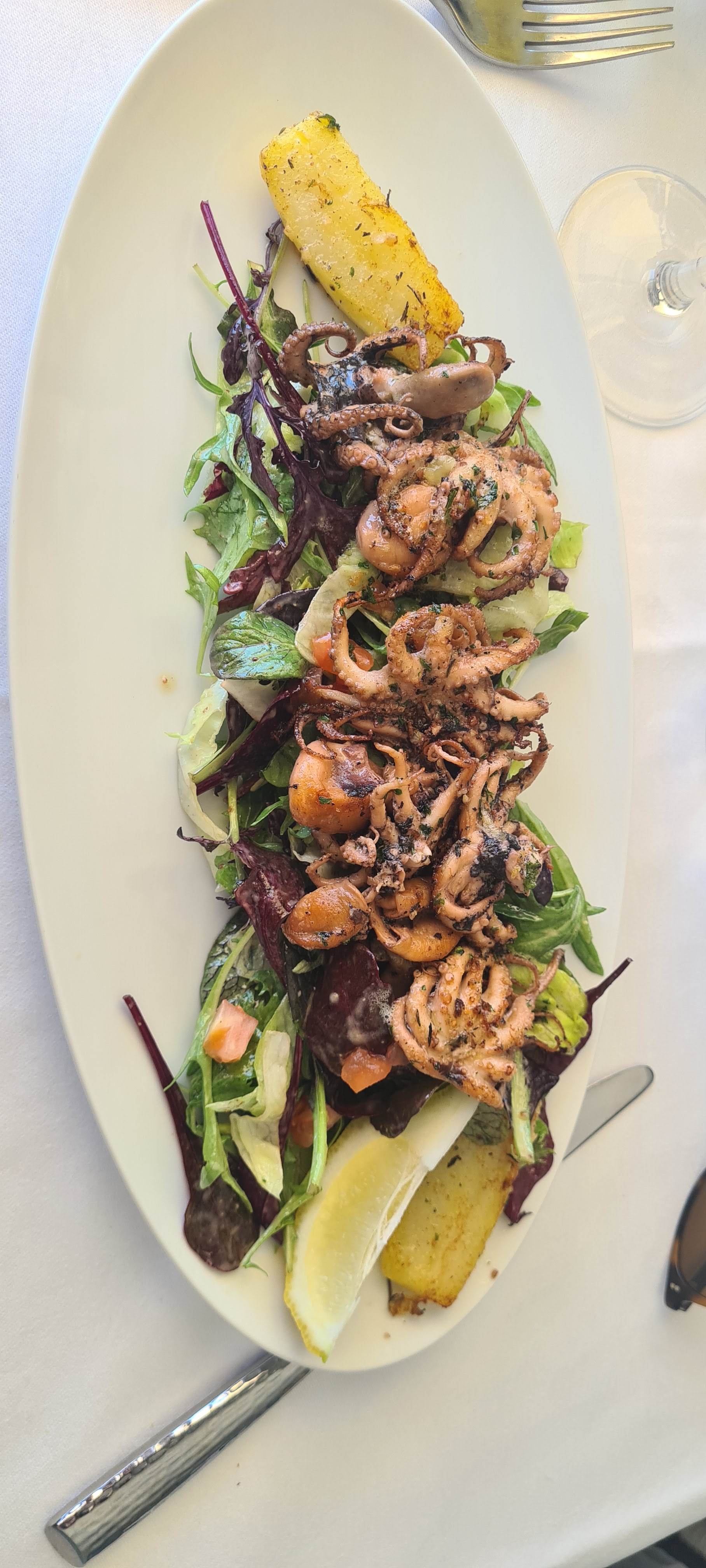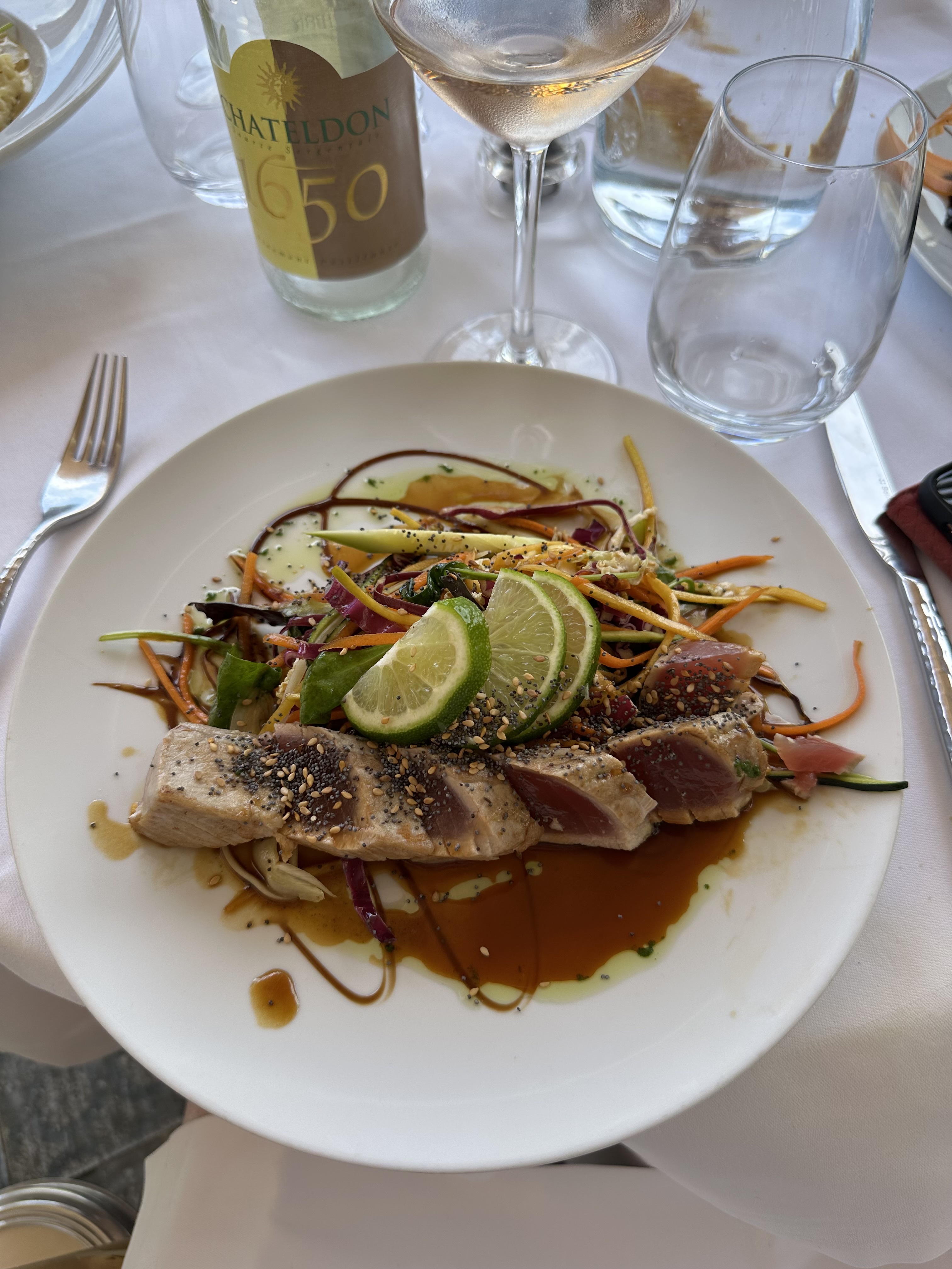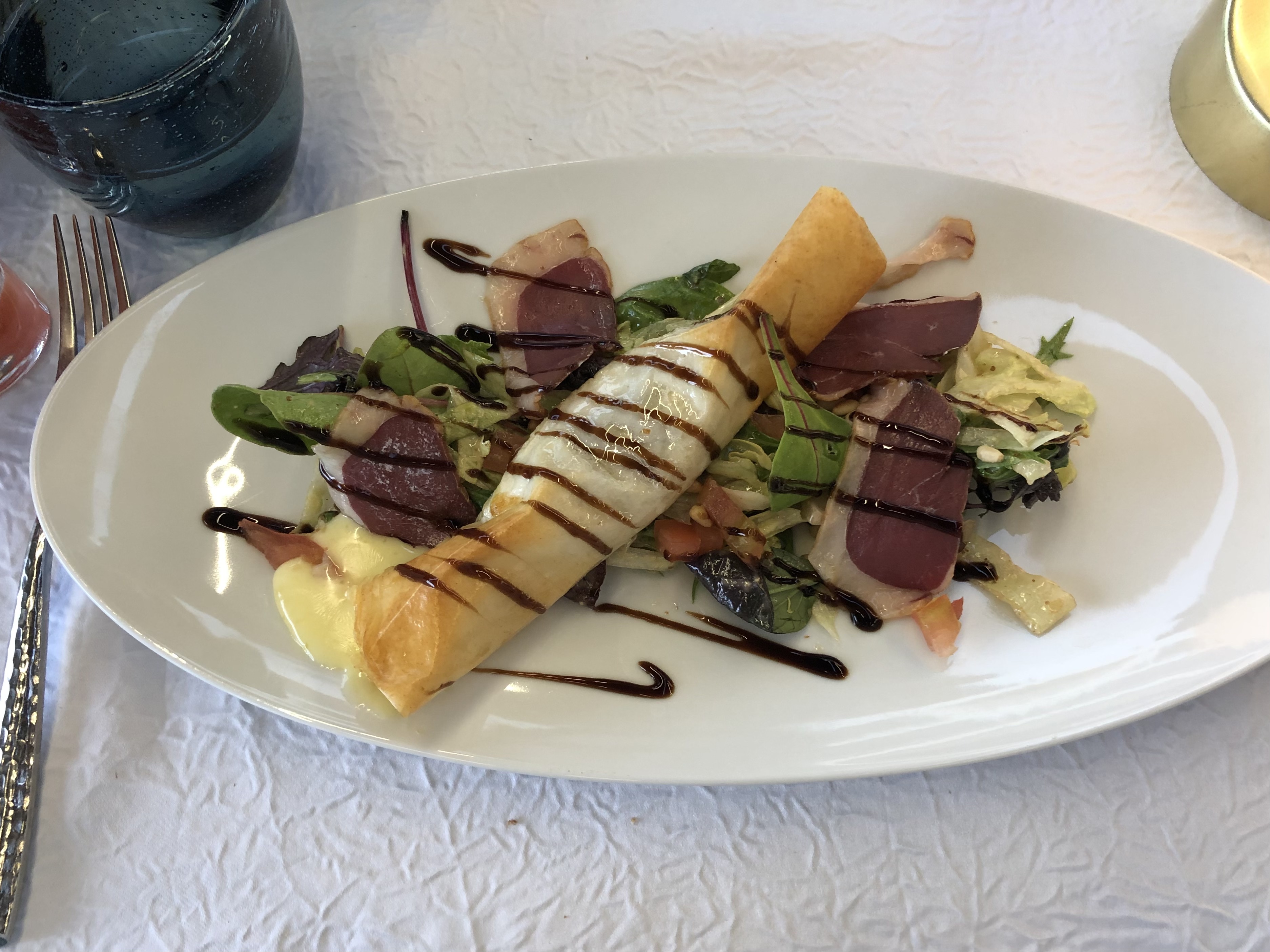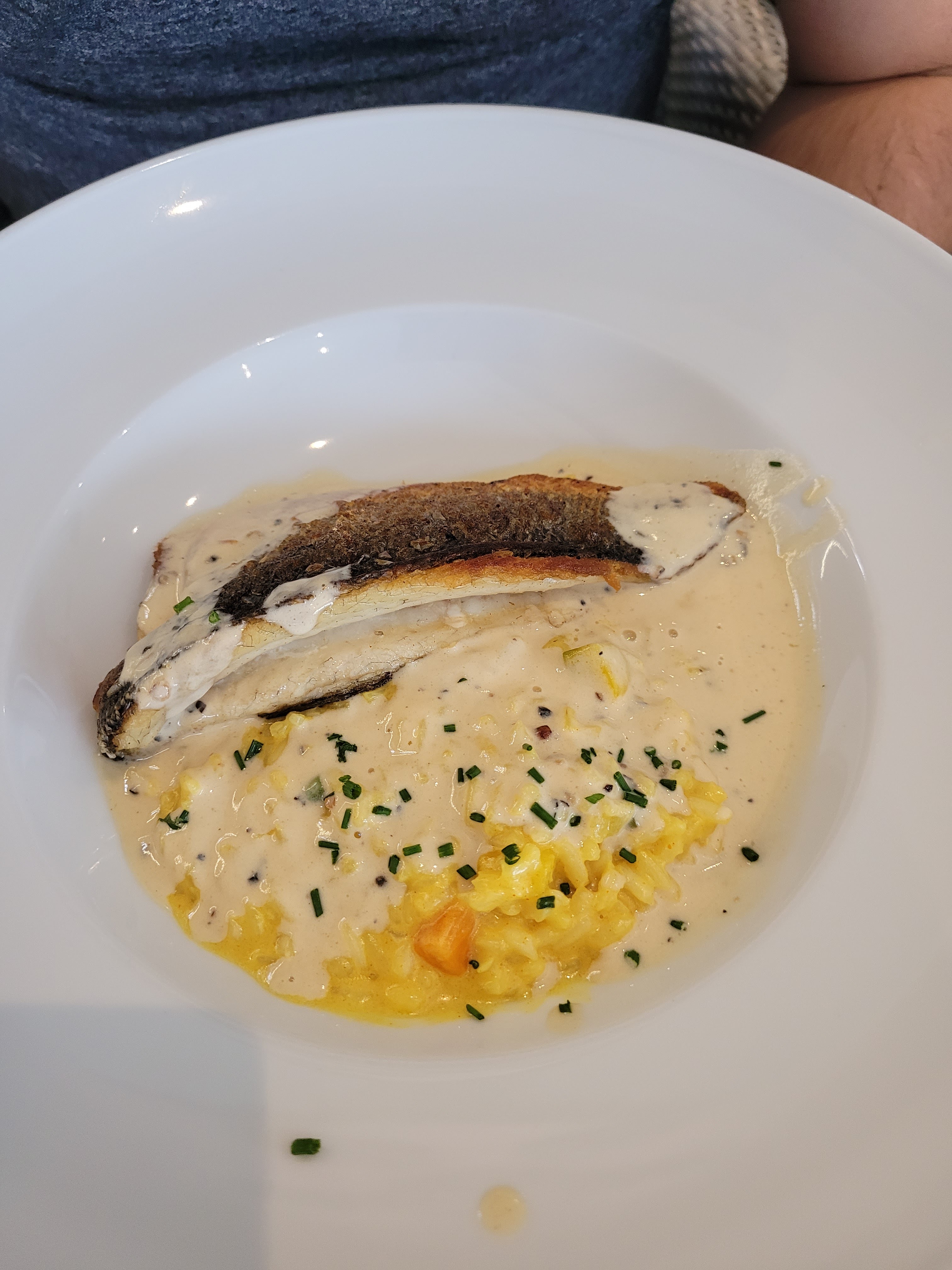 Super visite ! Nous sommes entrés sans réservation, ce qu'ils ont accepté à condition que nous ayons terminé en 2 heures car leurs réservations étaient complètes - pas de problème ! Partagé une entrée, un délicieux tartare de saumon qu'ils ont divisé pour nous et livré dans des assiettes séparées entièrement garnies. Puis j'ai sauté dans un délicieux plat principal de bar et de risotto (je n'ai pas partagé ça !), parfaitement cuit. Il y avait une bonne bouteille de pinot avec le repas (c'était un peu fini avec la rose à ce stade de mon voyage). Le seul reproche (pas vraiment un reproche), c'est que le pain qui l'accompagnait n'était pas le meilleur. La vue était magnifique ! J'y retournerais si jamais je revenais dans la région !