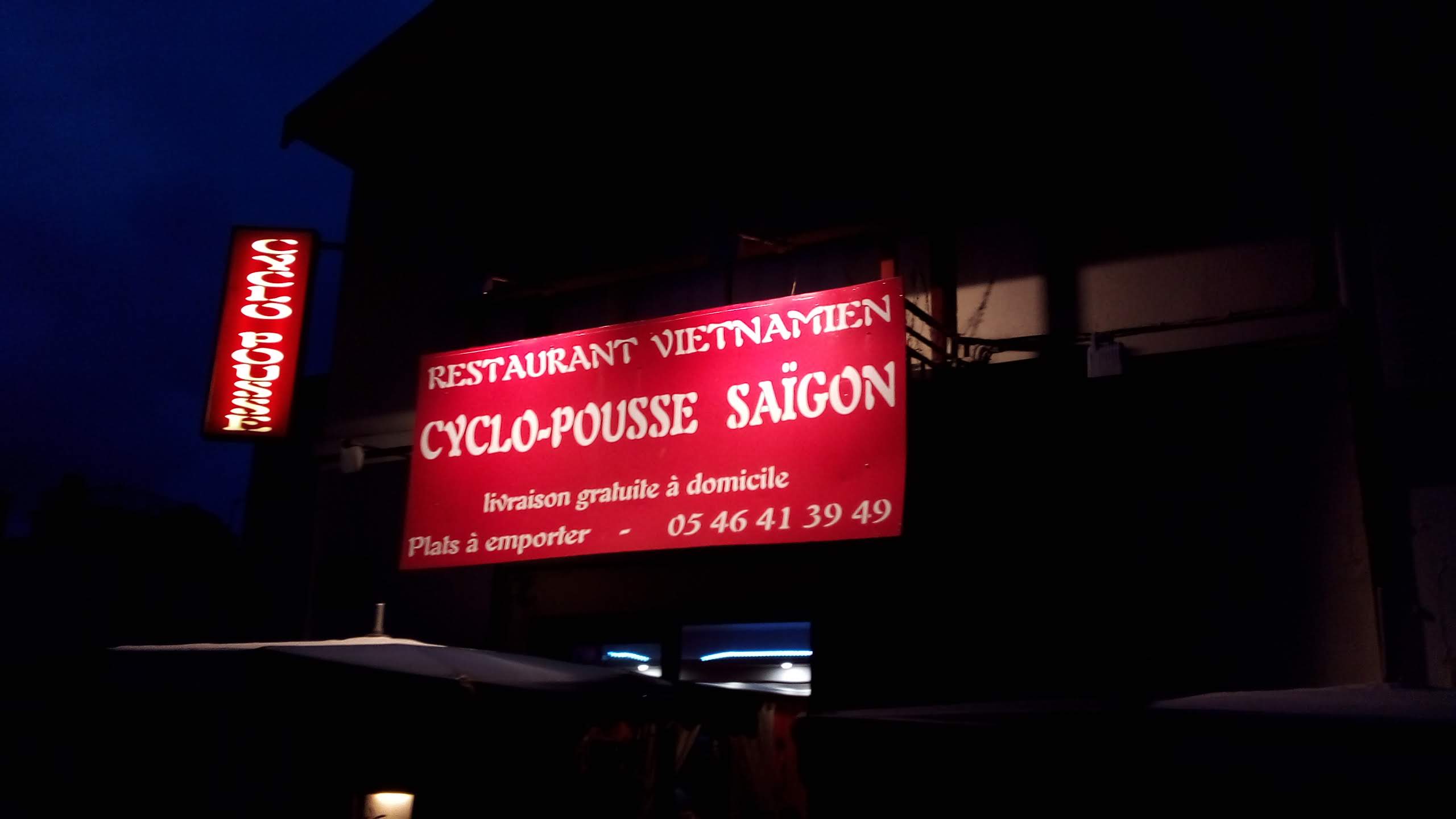 Ce restaurant (Vietnamien) s'appelle désormais et depuis déjà quelques années le cyclo-pousse Saigon. Cette différence de nom ne change pas les critiques positives que l'on peut faire de ce lieu. Accueil, carte et rapport qualité/prix en font un des restaurants asiatiques incontournable de La Rochelle.