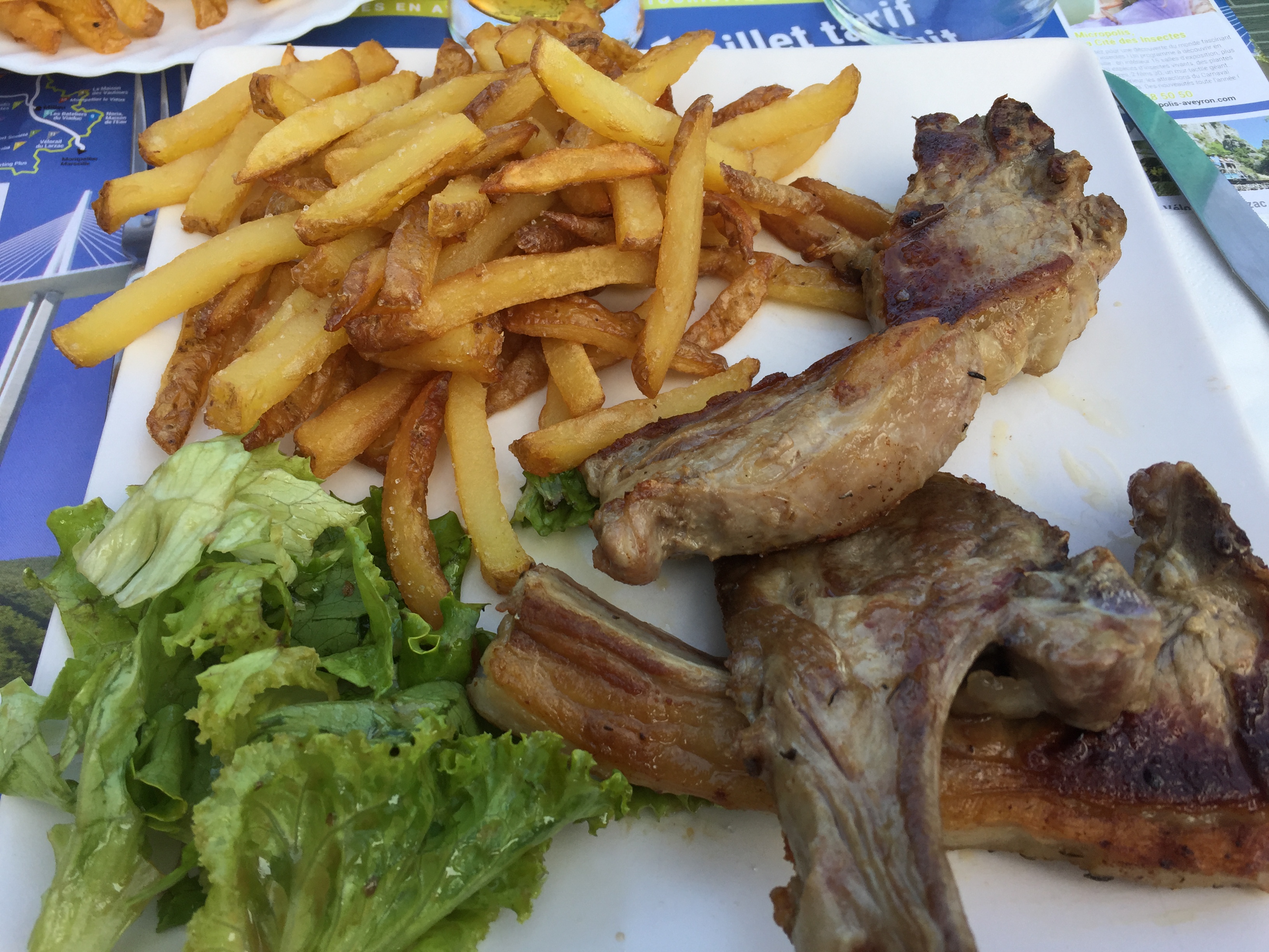 On avait tellement hâte de retrouver ce lieu ouvert début mai, ce n'est pas toujours évident de trouver des restaurants ouverts dans les Gorges du Tarn. Mes enfants ont vraiment apprécié les cocktails sans alcool, la niña colada et le virgin mojito, tous deux délicieux et bien présentés. Mon fils avait dans le menu enfant un choix de saucisses ou de farçous de légumineuses, qui sont finalement des légumes hachés transformés en galette. Il a pris la saucisse avec des frites et une petite salade. Ma fille et moi avons pris les plats d'agneau et de porc. Si vous avez faim, prenez la côtelette de porc car c'est une coupe plus épaisse. Mon agneau était servi avec des frites maison, de la salade et un peu de sauce dans une tasse à expresso à part. Le cheesecake en dessert était léger et délicieux, mais la prochaine fois j'essaierai probablement la mousse au chocolat !