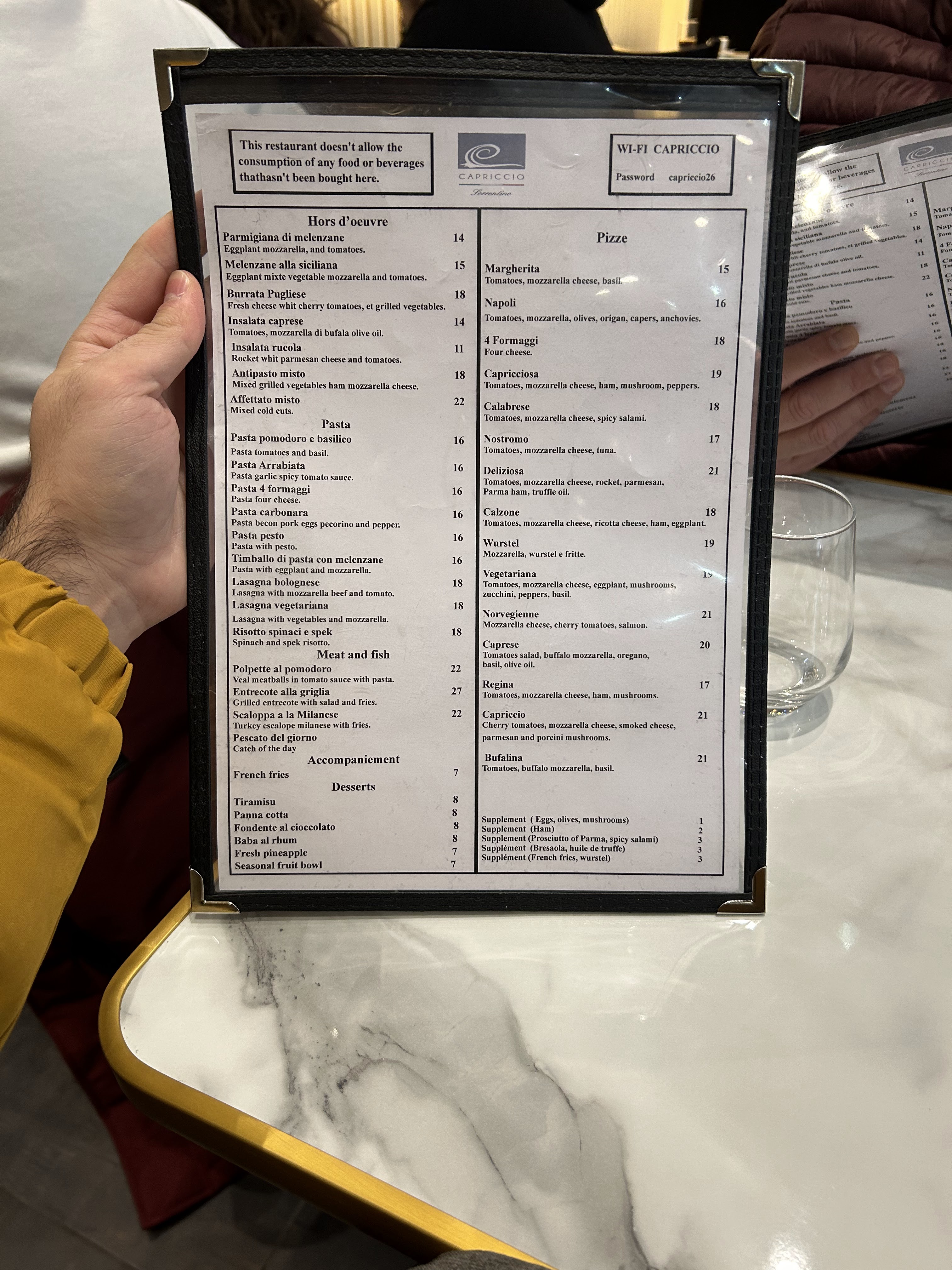 Si vous quittez le tourniquet de sortie de la Tour Eiffel, vous ne pouvez pas manquer M. Pasquale du Capriccio Sorrentino. Vous vous sentez immédiatement chez vous et profitez de tout ce que vous voulez de bon, de la pizza aux entrées excellentes et abondantes, en passant par les premier et deuxième plats de votre choix et de haute qualité. Merci Pasquale, à 23h15 le lundi de Pâques, vous avez satisfait 13 compatriotes avec des enfants. En plus de la gentillesse de tous, vous êtes un professionnel avec tout votre personnel et vous êtes un grand gentleman. Félicitations, j'espère revenir bientôt. Simplement, Claudio da Foggia et sa famille