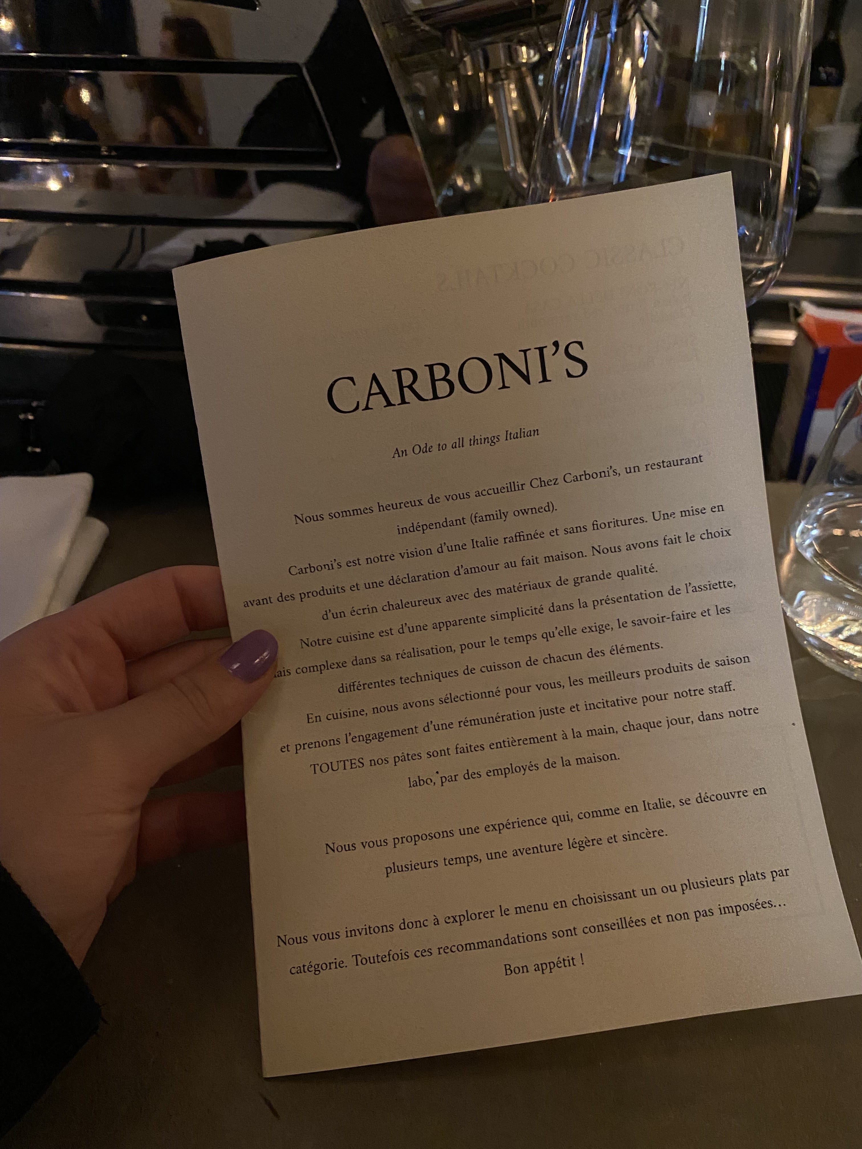 Très bon moment passé chez CARBONI’S ! Nous avons très bien mangé et recommandons ce restaurant. Le seul petit bémol, peu d’options végétariennes.