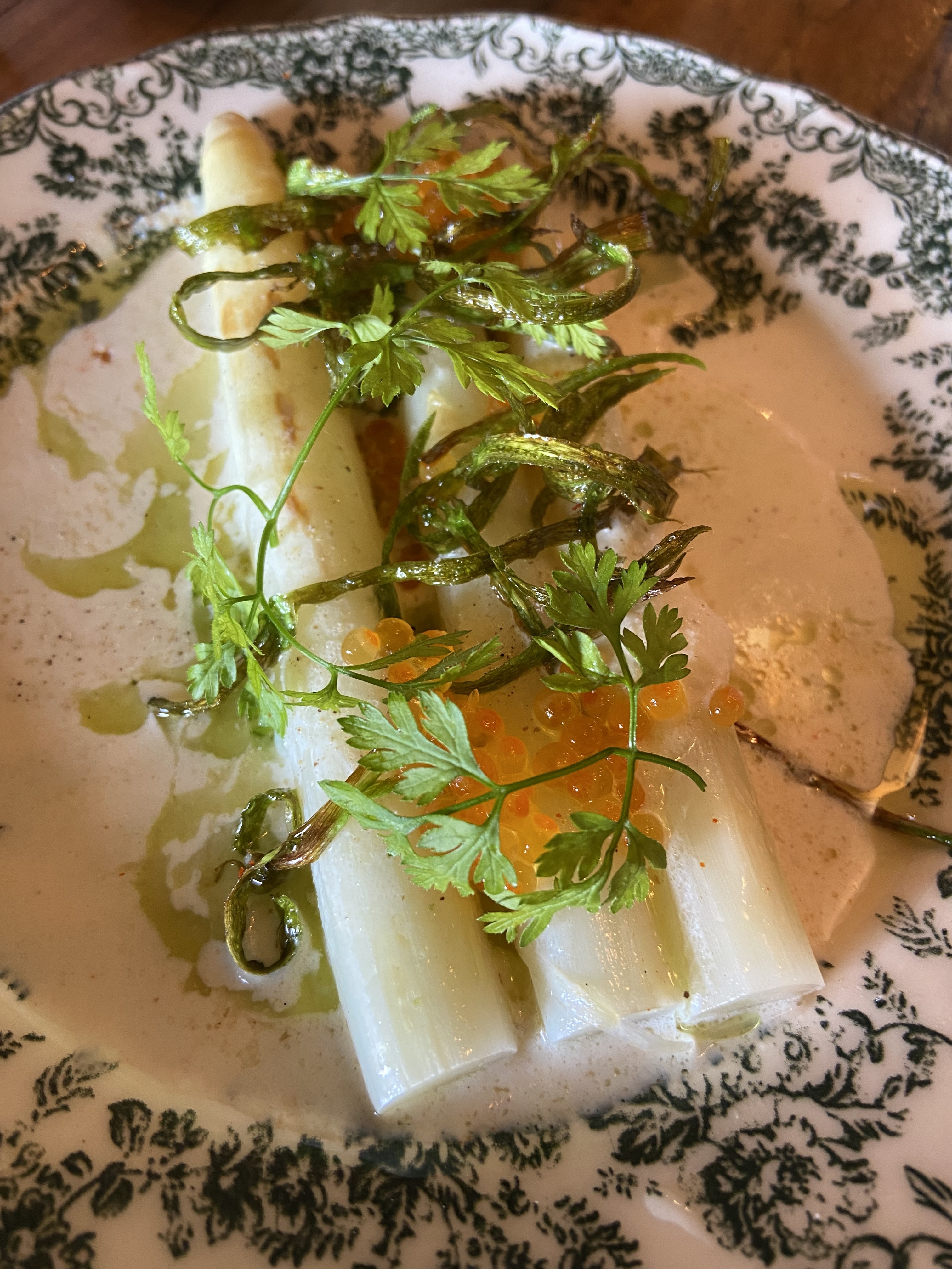 Dans l'intime refuge de Carcasse, chaque plat évoque les saveurs de chez mamy, enveloppant les convives dans un cocon de réconfort. Les œufs mimosa, délicieusement préparés, nous rappellent des déjeuners ensoleillés passés en famille, tandis que les asperges fraîches, croquantes et verdoyantes, réveillent les papilles comme les premiers jours du printemps. La viande rouge, tendre et juteuse, offre une danse de saveurs en bouche, rappelant les festins dominicaux partagés avec amour. Accompagnée de purée onctueuse, elle ravive les souvenirs d'enfance. La brioche perdue, entièrement faite maison, est une ode à la gourmandise, servie avec un généreux nappage de caramel au beurre salé et une crème d'Isigny à la vanille, chaque bouchée est un délice sucré qui réveille les sens et fait chavirer les cœurs. La décoration réconfortante enveloppe chaque convive d'une étreinte nostalgique, tandis que le service attentionné, empreint de gentillesse et de générosité, achève de transporter les convives dans un univers où chaque détail est imprégné d'amour. Chez Carcasse, chaque bouchée est un poème de tradition et de bonheur, offrant une expérience culinaire empreinte de réconfort et de douceur.