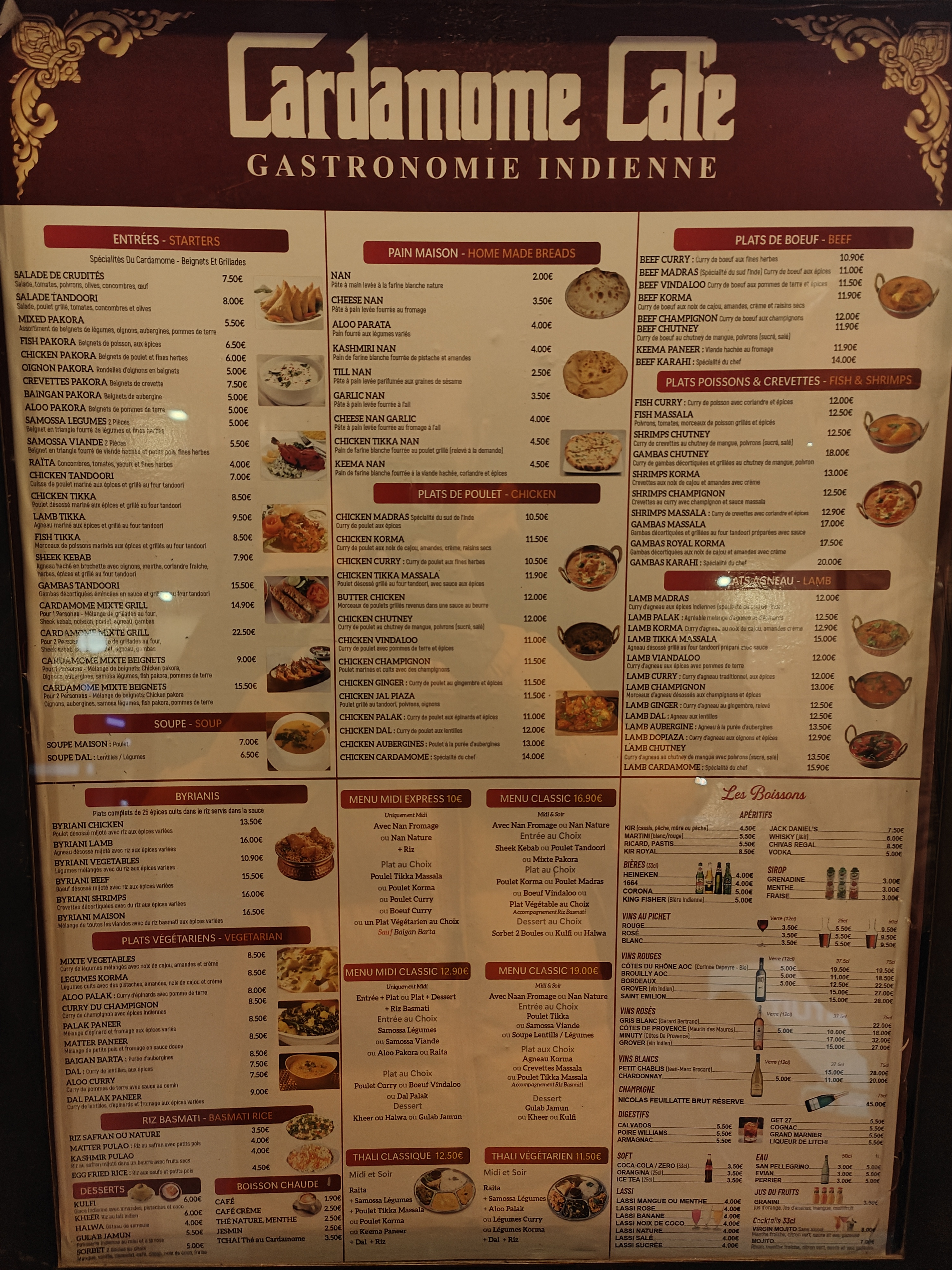 Quand je suis arrivé à Paris, l’une des premières choses qui m’a préoccupé a été de trouver un restaurant indien décent. Après de nombreuses déceptions, je suis passé par Cardamom Cafe et j'ai décidé d'essayer une fois de plus grâce à leur offre de menu à un prix très raisonnable. La nourriture était excellente, tout était vraiment délicieux, le personnel très sympathique et l'addition était loin d'être aussi effrayante que dans d'autres restaurants indiens. Depuis, j’y suis retourné plusieurs fois et j’ai l’intention d’y retourner plusieurs fois encore. Excellent.