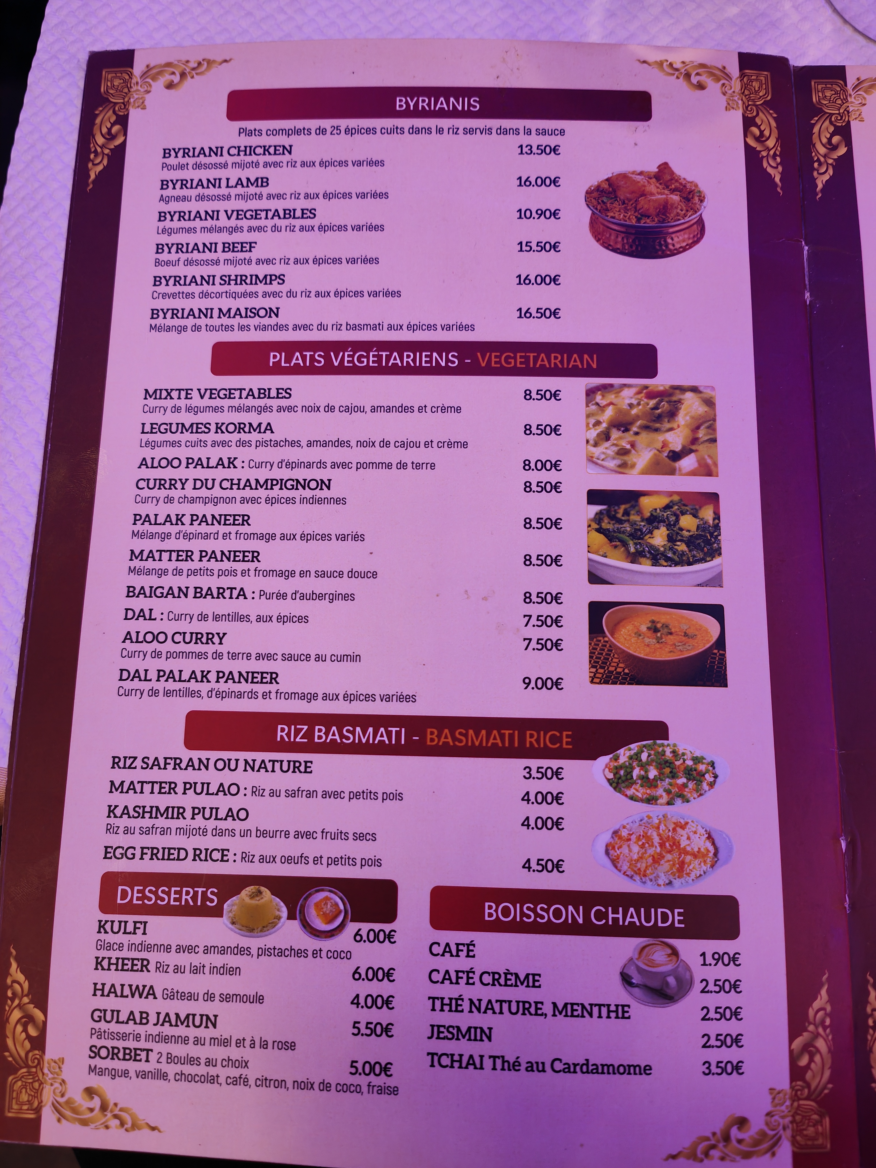 Je voulais mettre 4 étoiles et finalement ça sera 2 avec du recul La carte est grande et il propose plein de spécialités de l'Inde Les naans étaient bons, et coup de coeur pour le lassi rose, très bien fait Le gérant a tenté de nous arnaquer. Il ne parle pratiquement pas Français. J'ai réservé sur TheFork et ai payé 25€ d'avance et il a tenté de me la mettre à l'envers. Malhonnête C'est vraiment dommage parce qu'en dehors de ça, c'était vraiment bon, et pas sûr que ce soit industriel J'ai dû insister pour avoir mes 25€, c'est vraiment abusé