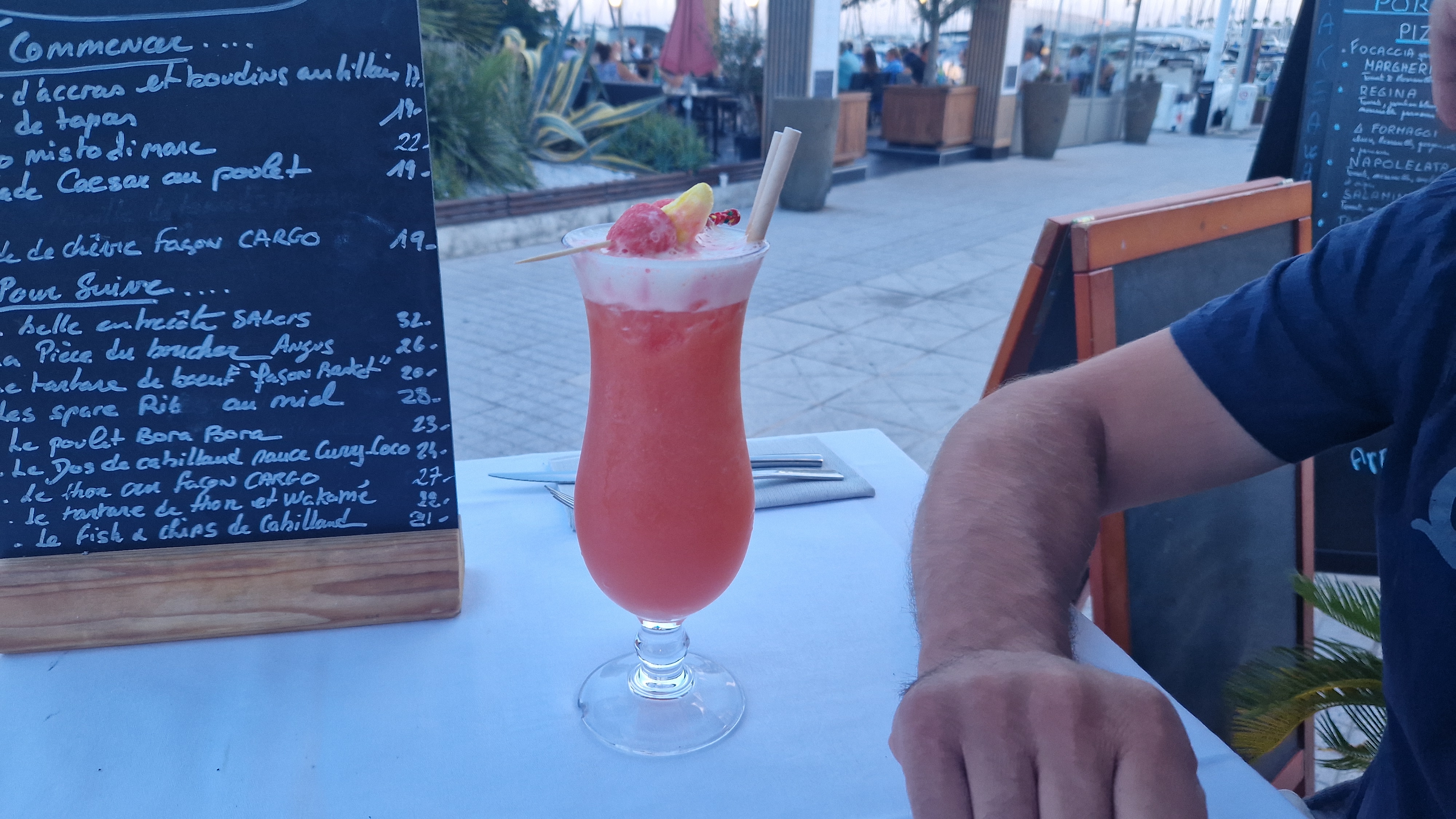 Au debut du port, tout près du parking Indigo. Ambiance super sympa pour les soirées avec music Live. Cuisine à base de produits frais. On a pris le thon cru Cargo, et c'est délicieux.