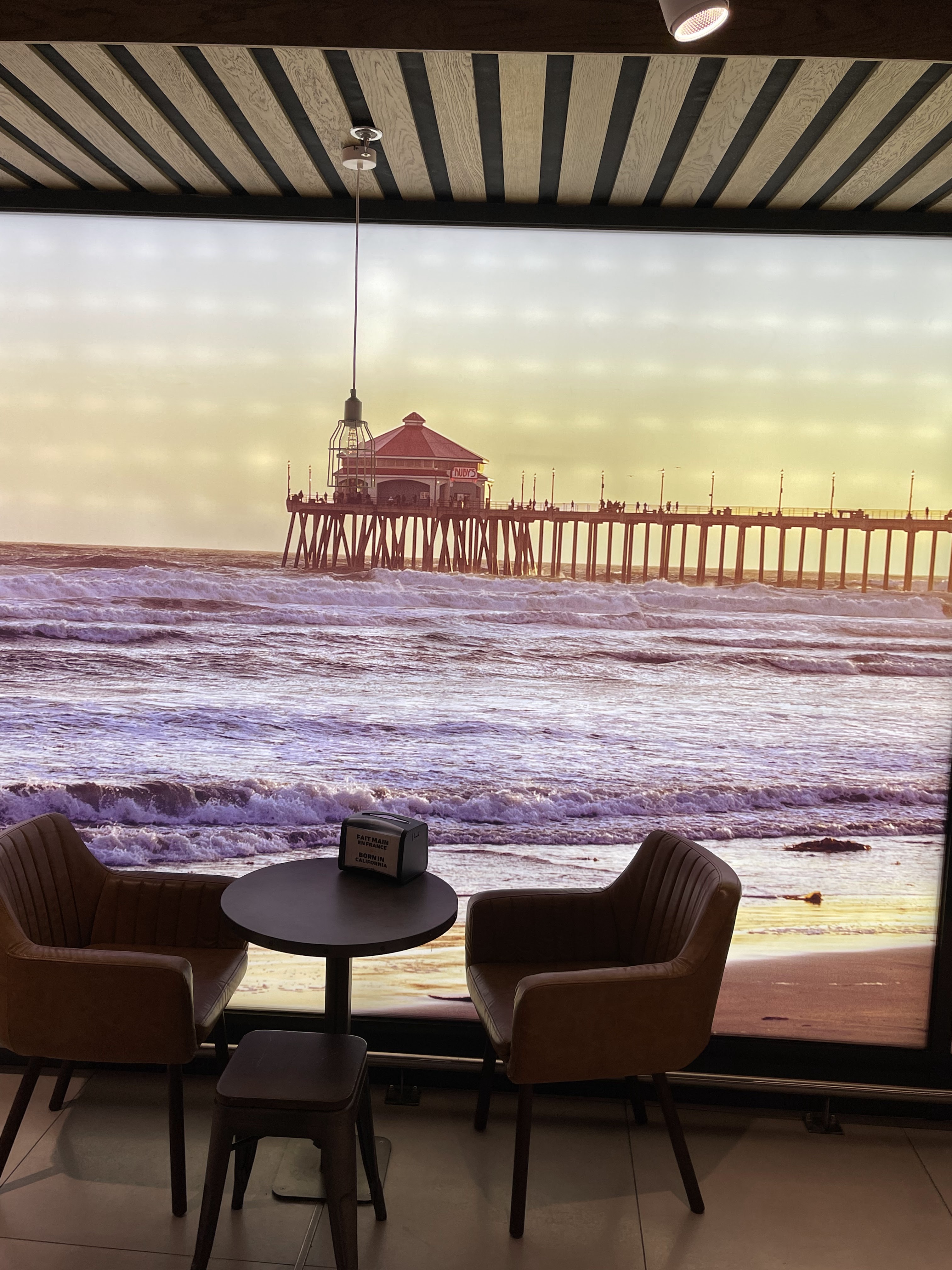 Comme au états Unis ! Belle surprise à l'aéroport, un endroit situé dans le terminal 2 donc idéal pour un déjeuner avant de prendre l'avion ou en attendant un proche, servie hyper rapidement, les tables du fond sont pas mal avec sièges confortable. en espérant que la chaîne se développera dans d'autres grande villes prochainement !
