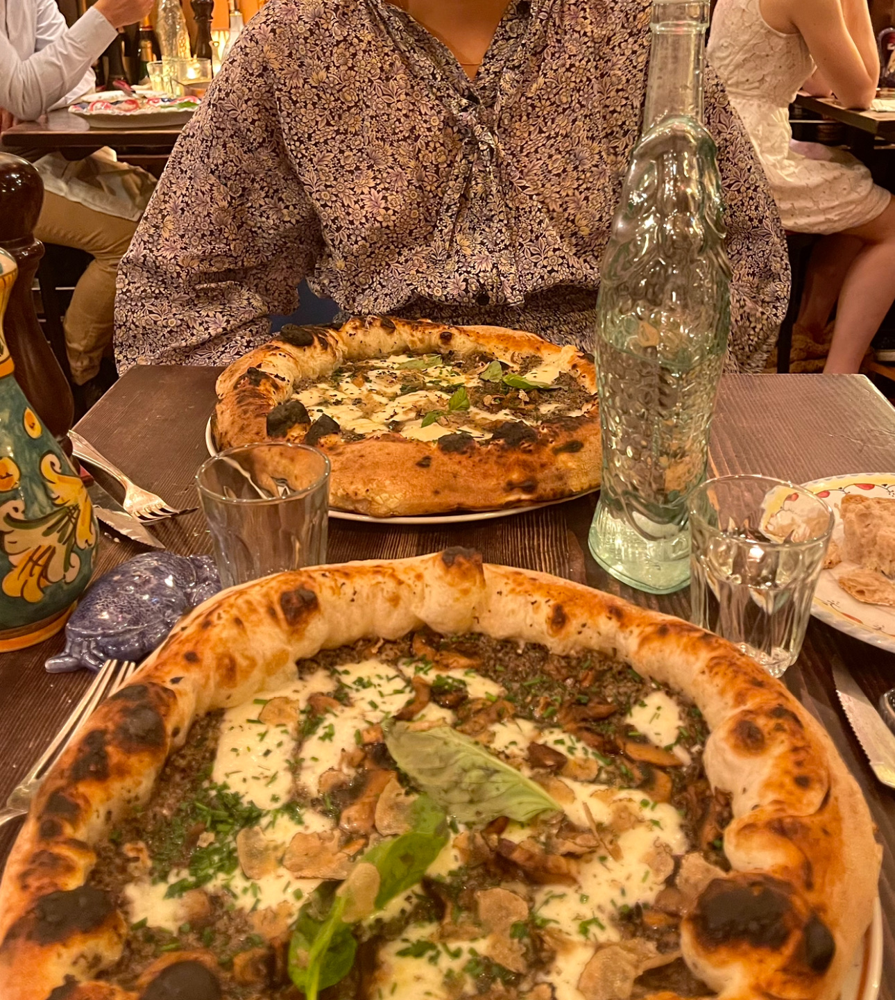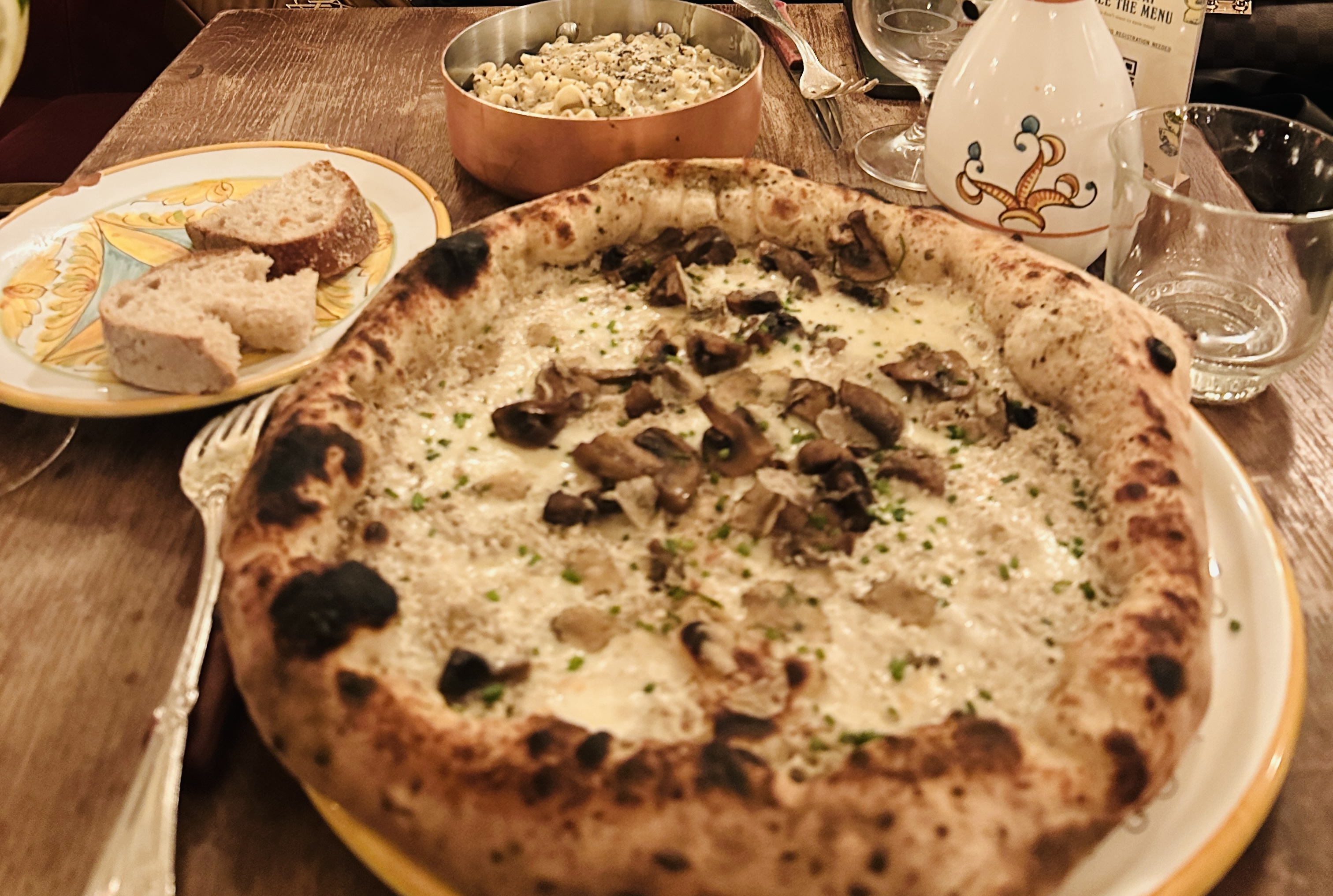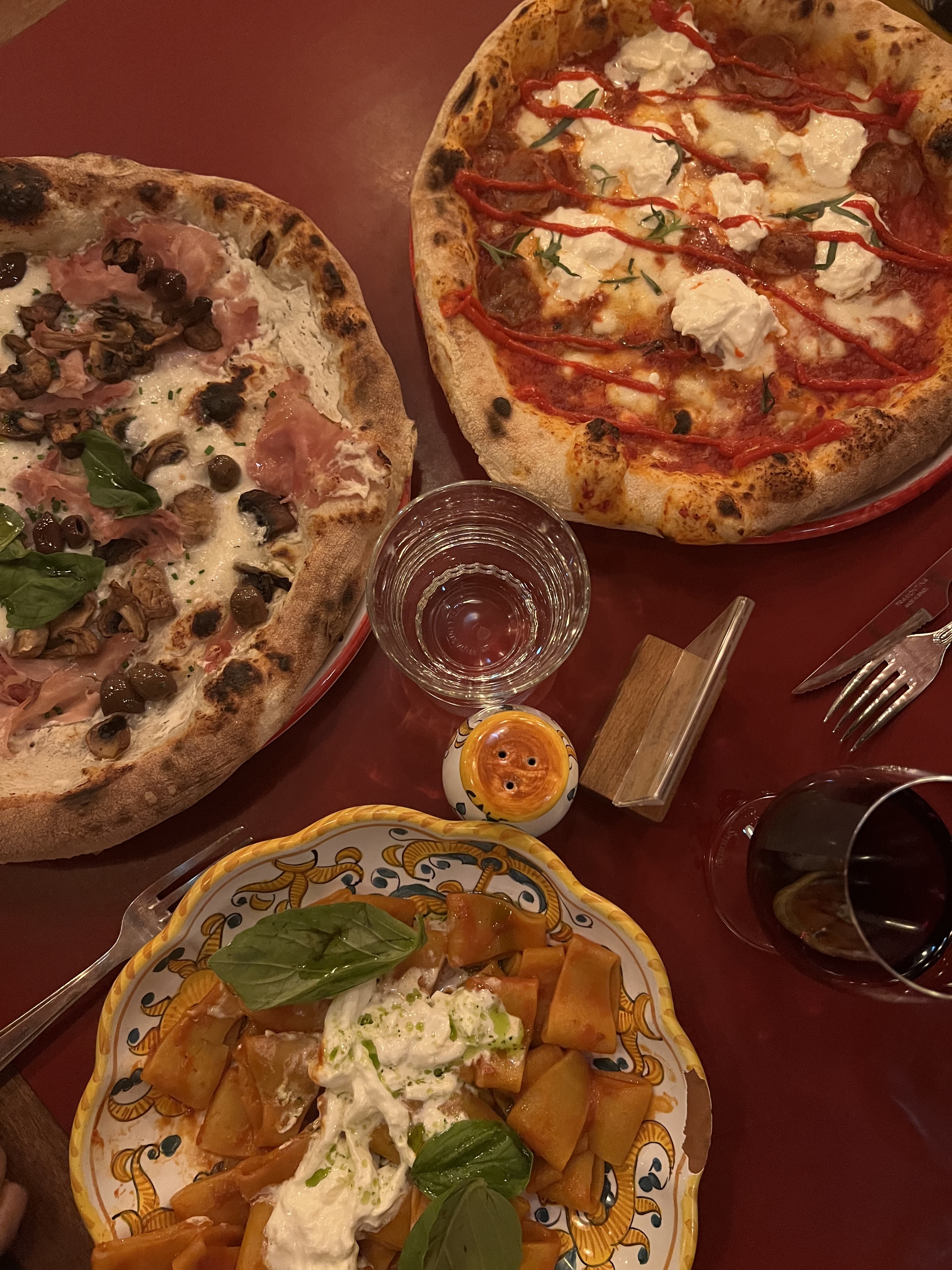 Bien si vous voulez faire des photos fantaisistes. Mais c'est tout. L'intérieur est magnifique et la nourriture est excellente. Nous avions réservé à 21h30, mais avons néanmoins dû attendre dehors jusqu'à 22h10 jusqu'à ce que notre table soit libre. Notre eau était vraiment hostile. La pizza était correcte. Malheureusement, la pâte était assez moelleuse. Les pâtes aux truffes n'étaient pas vraiment chaudes et elles sont devenues froides au bout de quelques minutes. Nous avons dû attendre 30 minutes pour notre facture. Même s'ils avaient déjà allumé la lumière et la table derrière nous, les serveurs nettoyaient les couverts. C'était extrêmement bruyant et au lieu de nous apporter la facture, ils ont simplement continué à nettoyer. Il y a de meilleurs endroits italiens en ville.