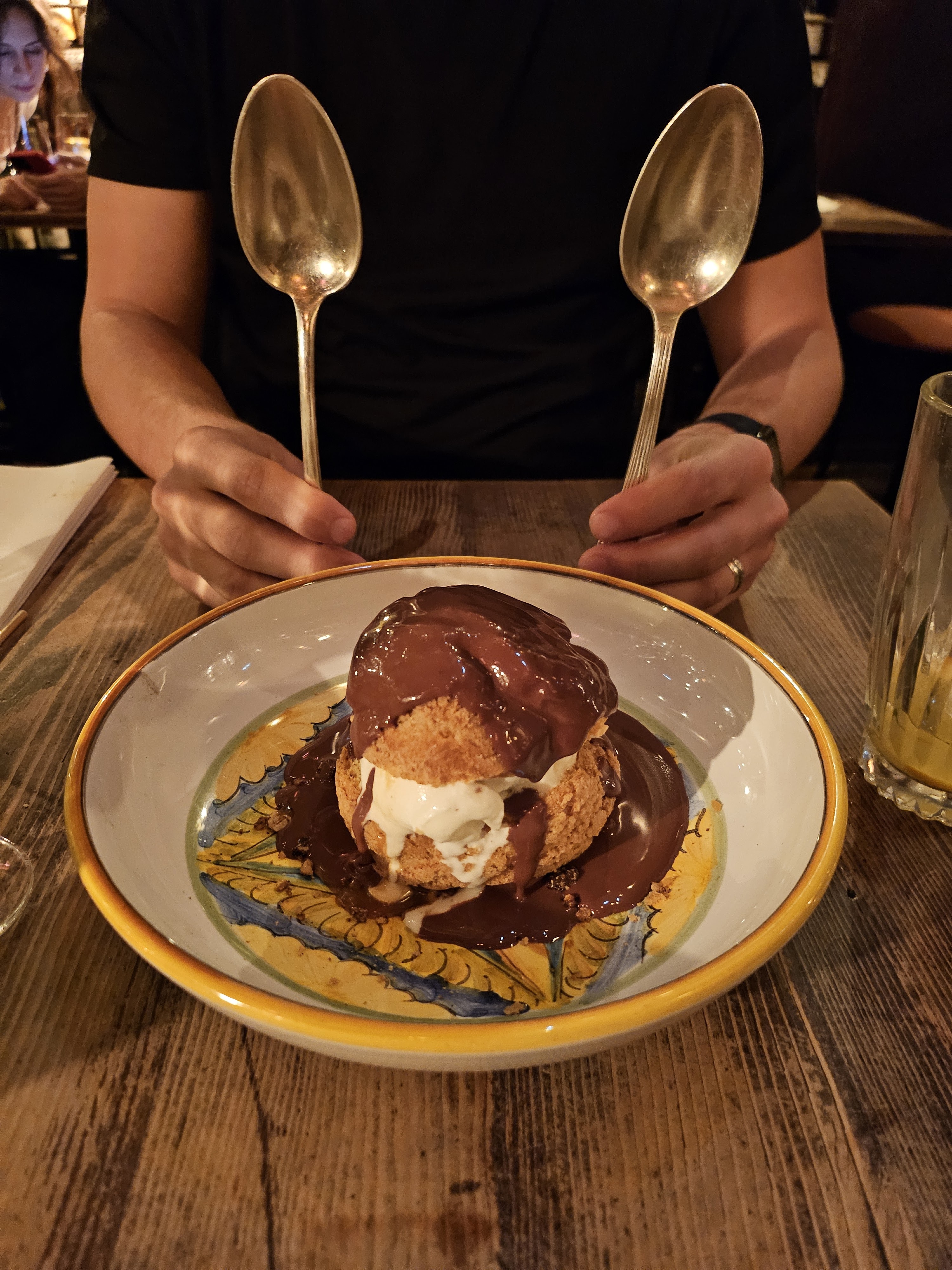 Mon mari et moi avons partagé l'apéritif stracciatella fumée, les pâtes aux fruits de mer, les pâtes aux épinards et le dessert profiterole. Aucun de nous n'a beaucoup aimé les pâtes aux fruits de mer, mais tout le reste était fantastique. Nous avons également essayé deux cocktails, tous deux très bons. Assurez-vous de réserver, car cet endroit semble complet, pour cause !