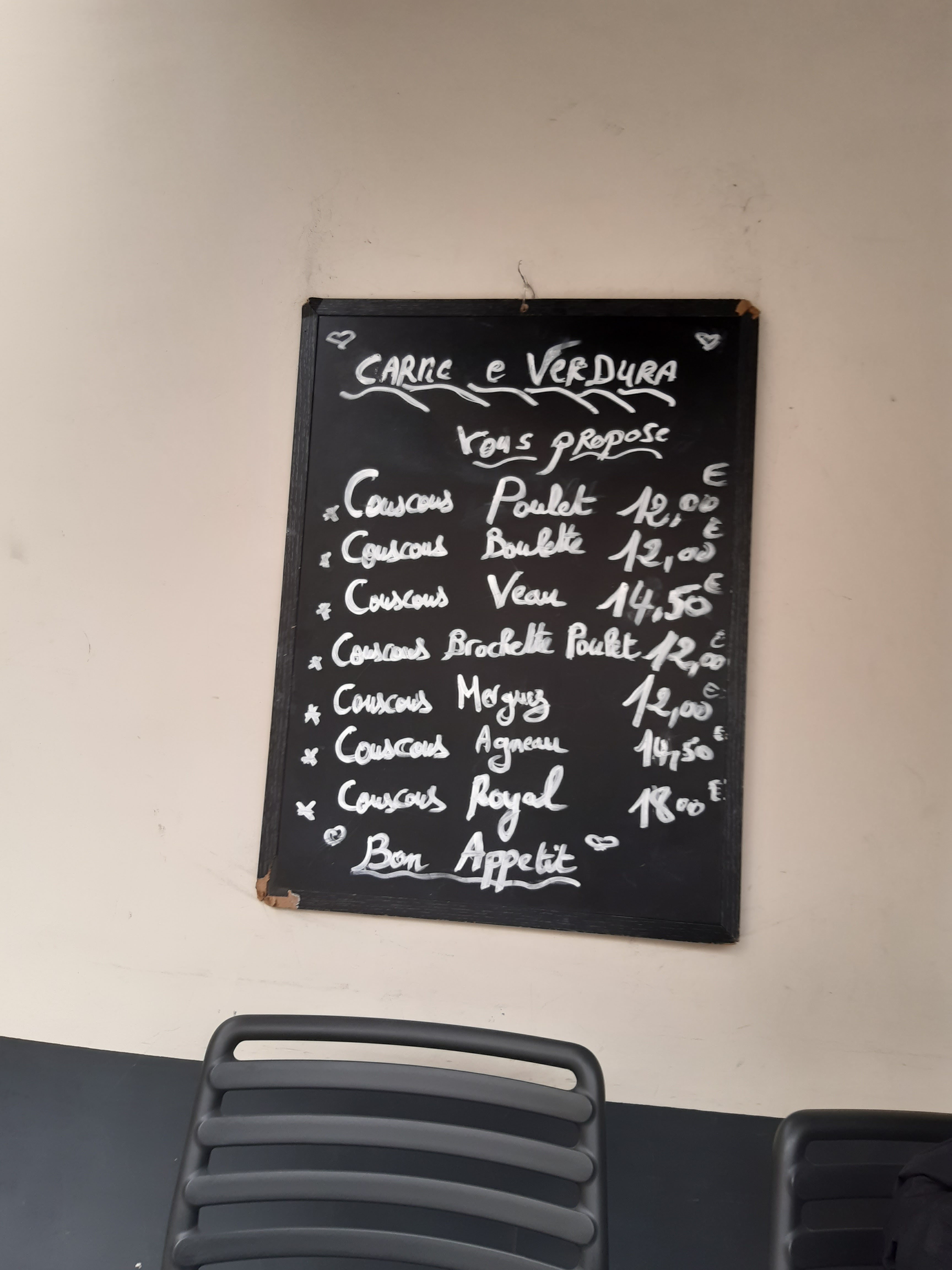 Super adresse . Les plats sont copieux , voir très copieux surtout le couscous royal . L’équipe est génial . C’est pas cher . Des bons desserts , très important pour les gourmands comme moi . Je vous conseille de passer voir par vous même ! Merci Carne e Verdura pour votre accueil . A bientôt !
