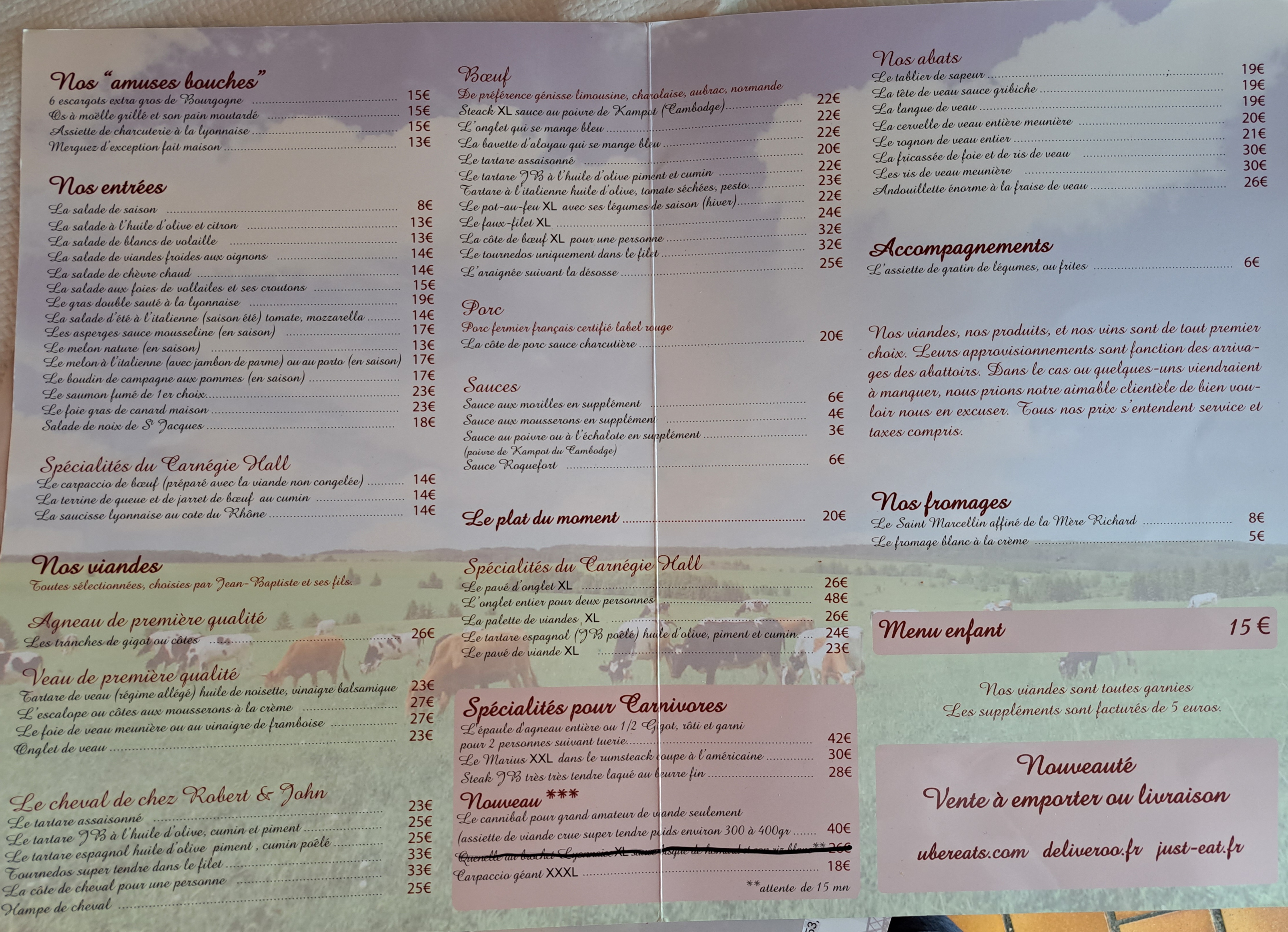 de la viande encore de la viande le temple des carnivores un choix exceptionnel un très bon accueil et une bonne ambiance ouvert le midi seulement et en semaine.il faut réserver mais ne vous précipitez pas sinon cela sera vite complet