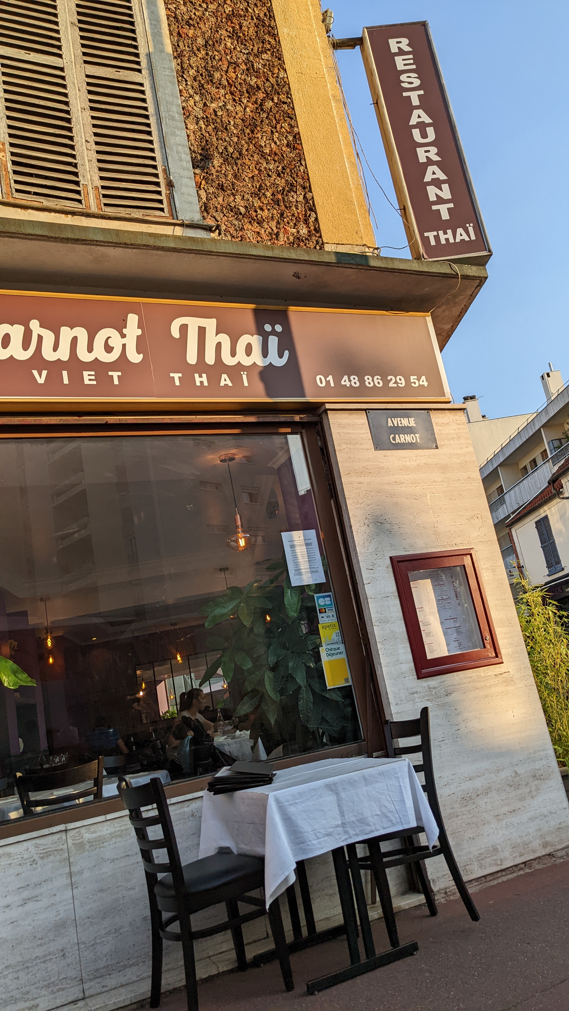 Carnot Thaï a un nom un peu trompeur, car on y trouve autant de nourriture vietnamienne comme la devanture l'annonce que de cuisine thaïlandaise. Et on y trouve aussi de la cuisine chinoise et quelques spécialités japonaises. C'est plus cela qui m'a dérangé car la déco et l'accueil sont bons. Avec un ami, nous avons pris des salades de papaye verte et de boeuf à la citronnelle plutôt réussies. En plat, ce fut du poulet au curry vert et lait de coco (excellente sauce) malgré un poulet quelconque, et un poulet curry rouge pas très relevé. En dessert, le Mango sticky rice m'a plus même si j'en ai goûté des meilleurs. Le prix est un peu élevé selon moi.