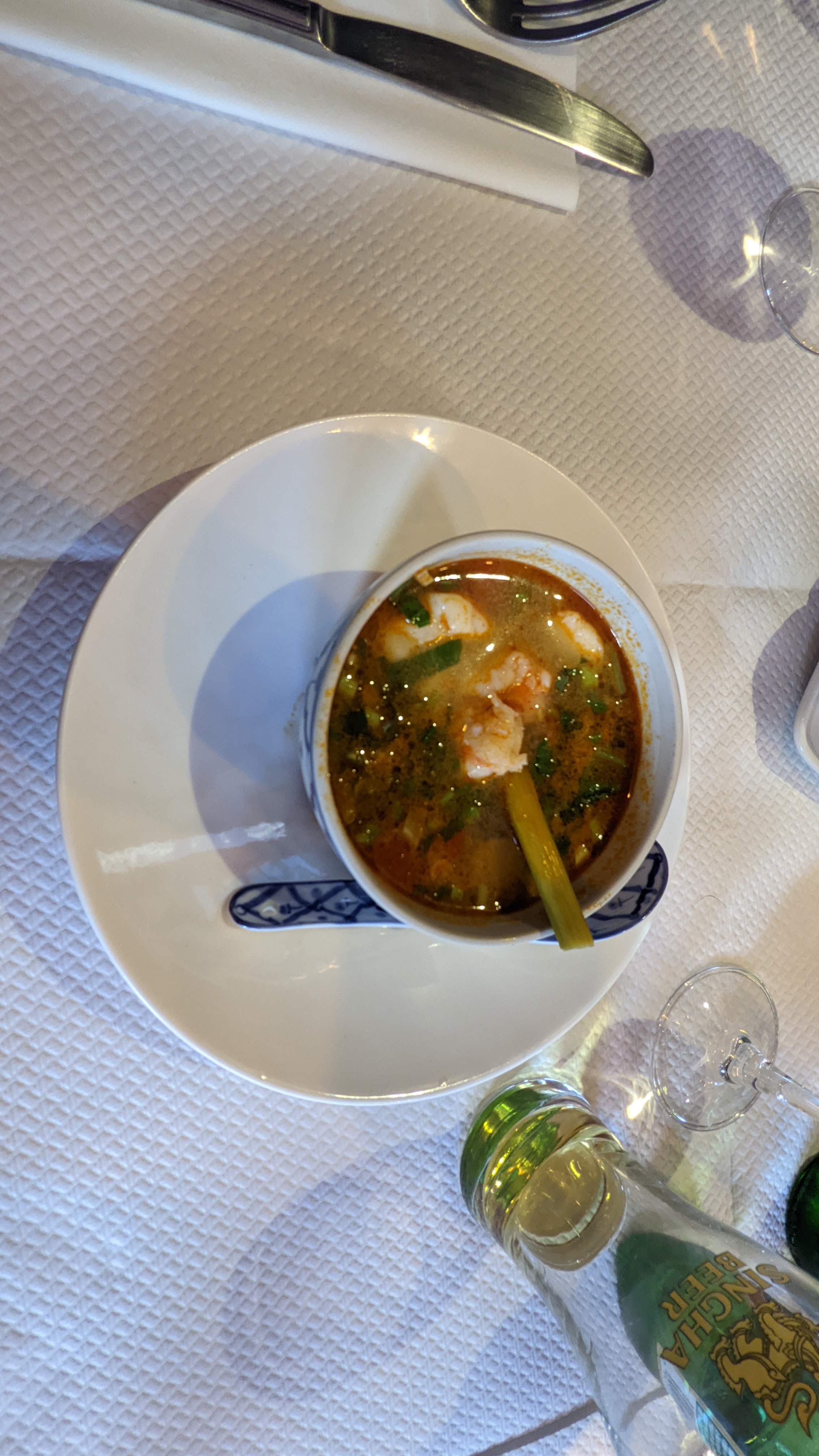 accueil, saveur, quantité et bon rapport qualité prix( premier menu à 14,90 entrée, plat, dessert le midi en semaine, deuxième proposition de menu en semaine à 16,90 entrée, plat, dessert). Soupe thaï citronnelle crevette parfumée , bouillon vraiment savoureux, seul regret les quatre crevettes à qui on a laissé la queue. Il faut donc tremper ses doigts dans le bol pour attraper la crevette et lui arracher la queue . Pas très glamour et pas très classe . Le poulet croustillant miel sauce aigre est bien servi et tient ses promesses . Le flan Thai au lait de coco est également très bon juste un peu petit. il faut donc aimer les petits desserts . Finalement, seul vrai bémol l'attente: 30 minutes pour avoir l'entrée, puis à nouveau 30 minutes pour avoir le plat. Heureusement le dessert est arrivé assez vite.