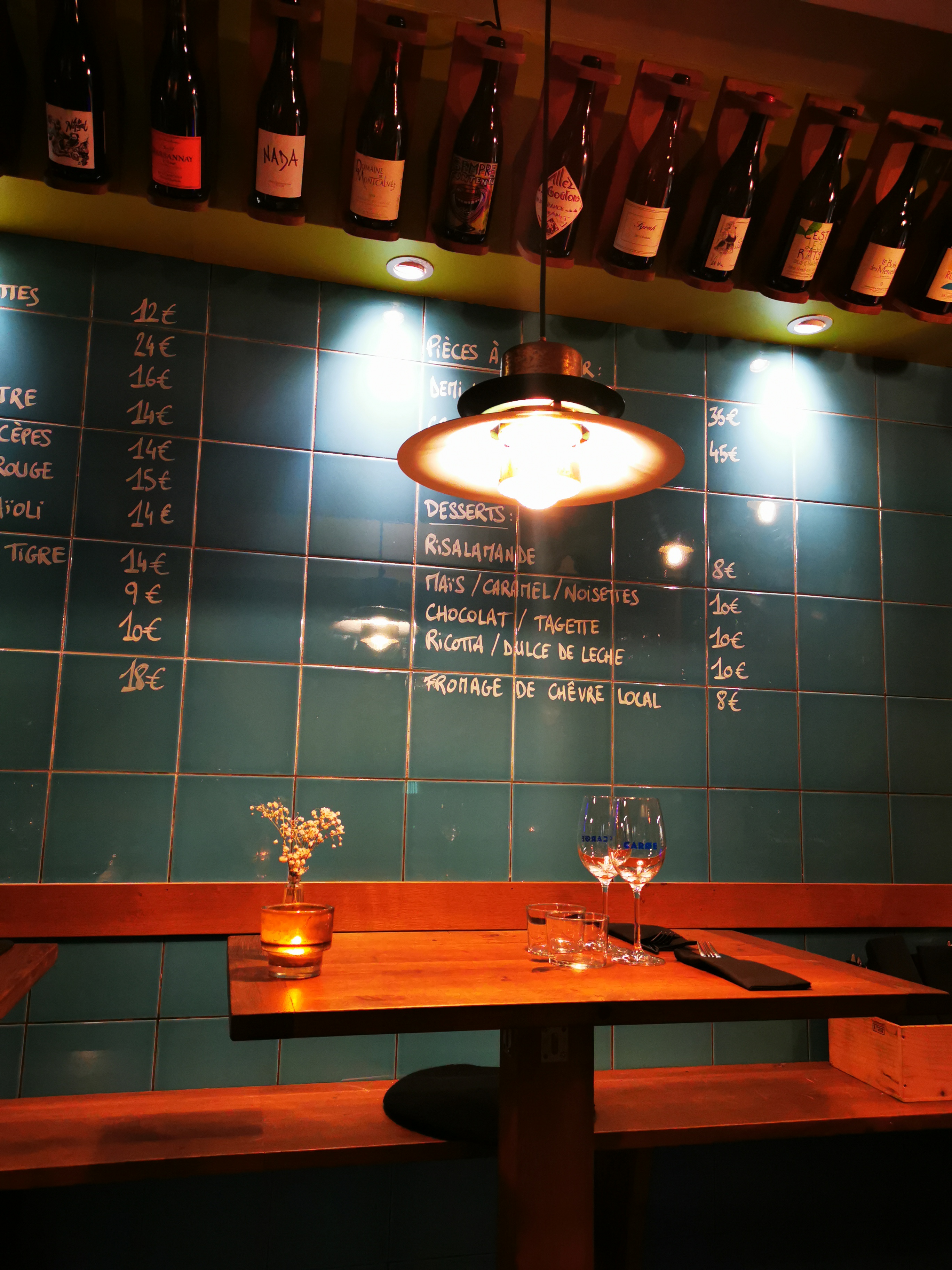 Cuisine très originale et savoureuse Grand choix de vins naturels Nous avons eu un bon temps La musique était super