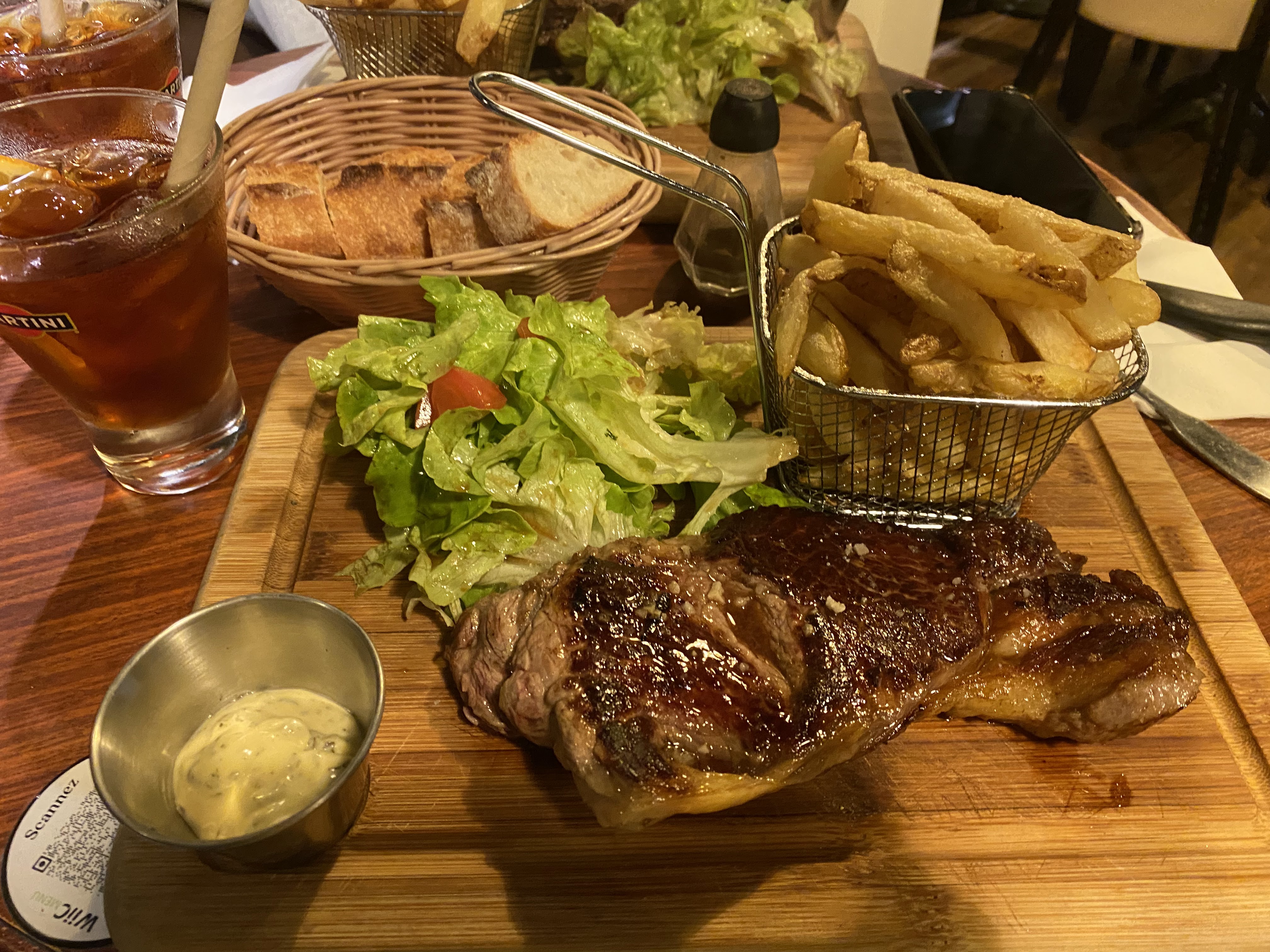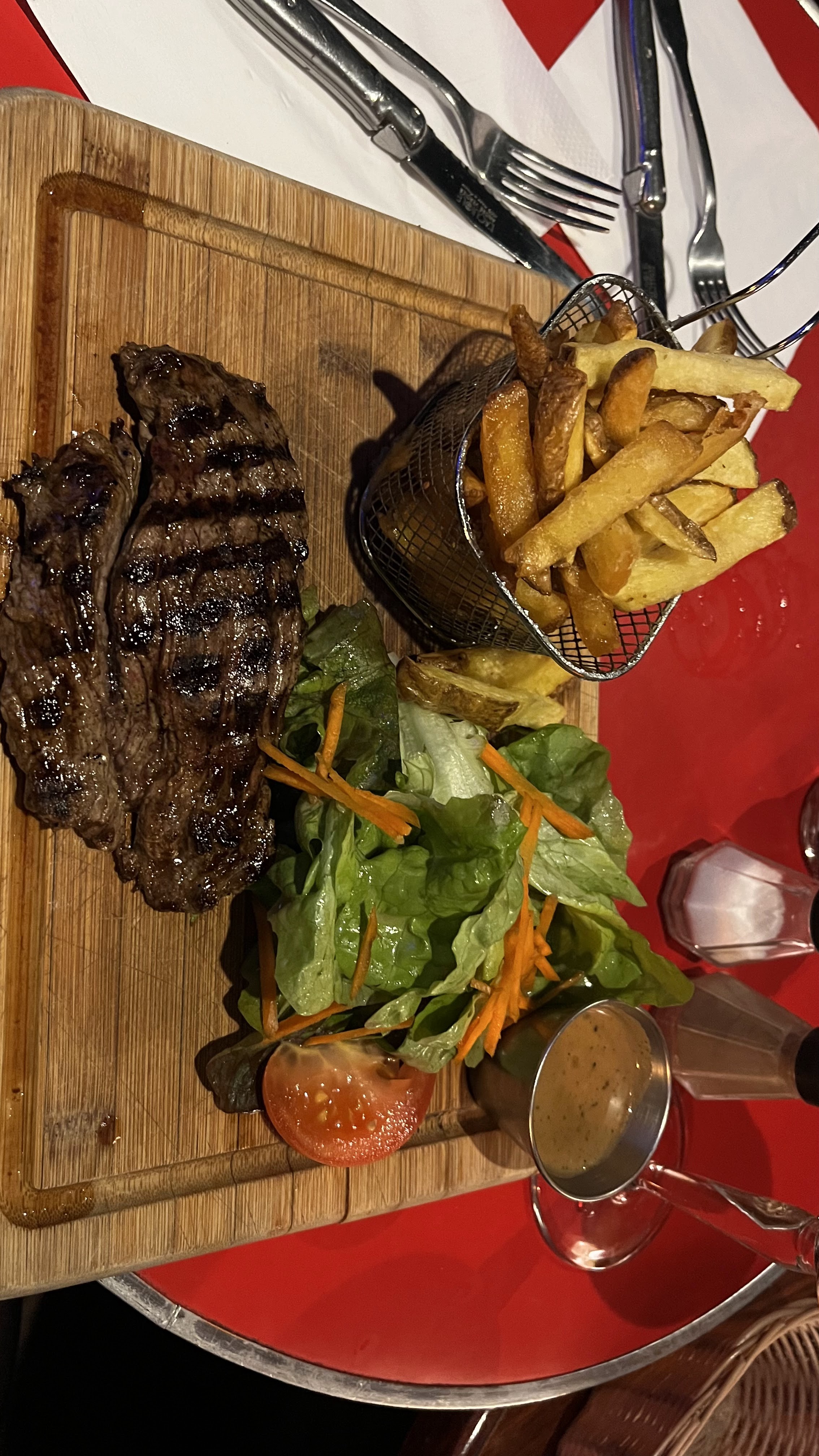 Très bon rapport qualité prix. Pièces du boucher goûteuse et tendre. Frites maison. The gourmand garni. Également fan du service : serveurs aimables et fan de l’ambiance : belles musiques des années 80-90 :)
