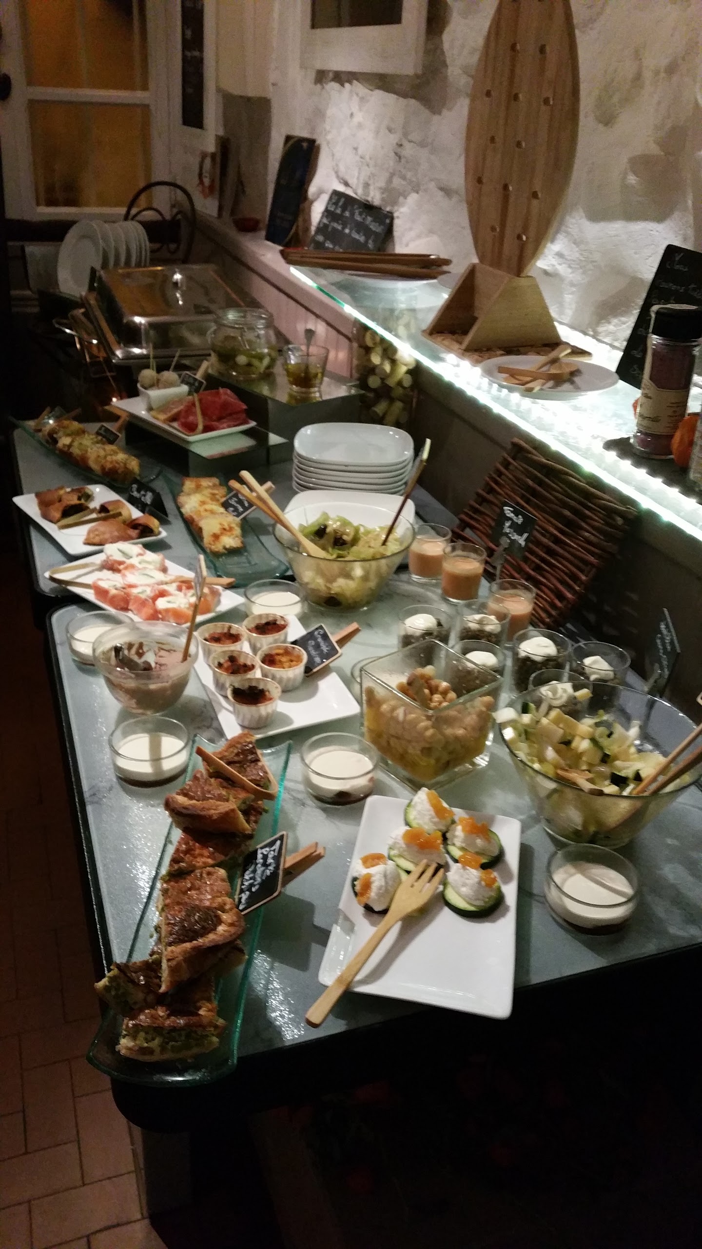 Situé dans des vieux quartiers c est déjà un plaisir d'y accéder même si les rues d accès sont un peu pentues. Arrivé à l interieur le plaisir esthetique continu avec une décoration très très bien pensée. On y est accueilli de manière très courtoise et attentionnée par la maîtresse des lieux qui répète inlassablement aux clients se présentant au buffet la composition des plats. La qualité se poursuit au niveau de ceux-ci faits maison. C'est un.buffet, il vous faudra donc vous lever pour aller chercher votre nourriture. C est petit, donc rassurez-vous pas de grande distance à parcourir ! Peut être plus difficile pour des personnes en fauteuil par contre. Pour les goûts, je ne suis pas un expert culinaire mais il y a des saveurs vraiment bien réalisées si je peux m exprimer ainsi. Nous avons particulièrement apprécié la soupe de cèpes et les entrées en général. Conseil, les quantités semblent petites mais du fait de la variété de choix cela rassasie bien. A savoir pour apprécier les plats de résistance et desserts ! Le propriétaire est également très sympathique et discute aimablement sur son métier. Bref je ne vois pas trop quoi dire de plus si ce n est que comme c est petit et les avis élogieux, je pense qu il vaut mieux réserver. Bonne découverte !