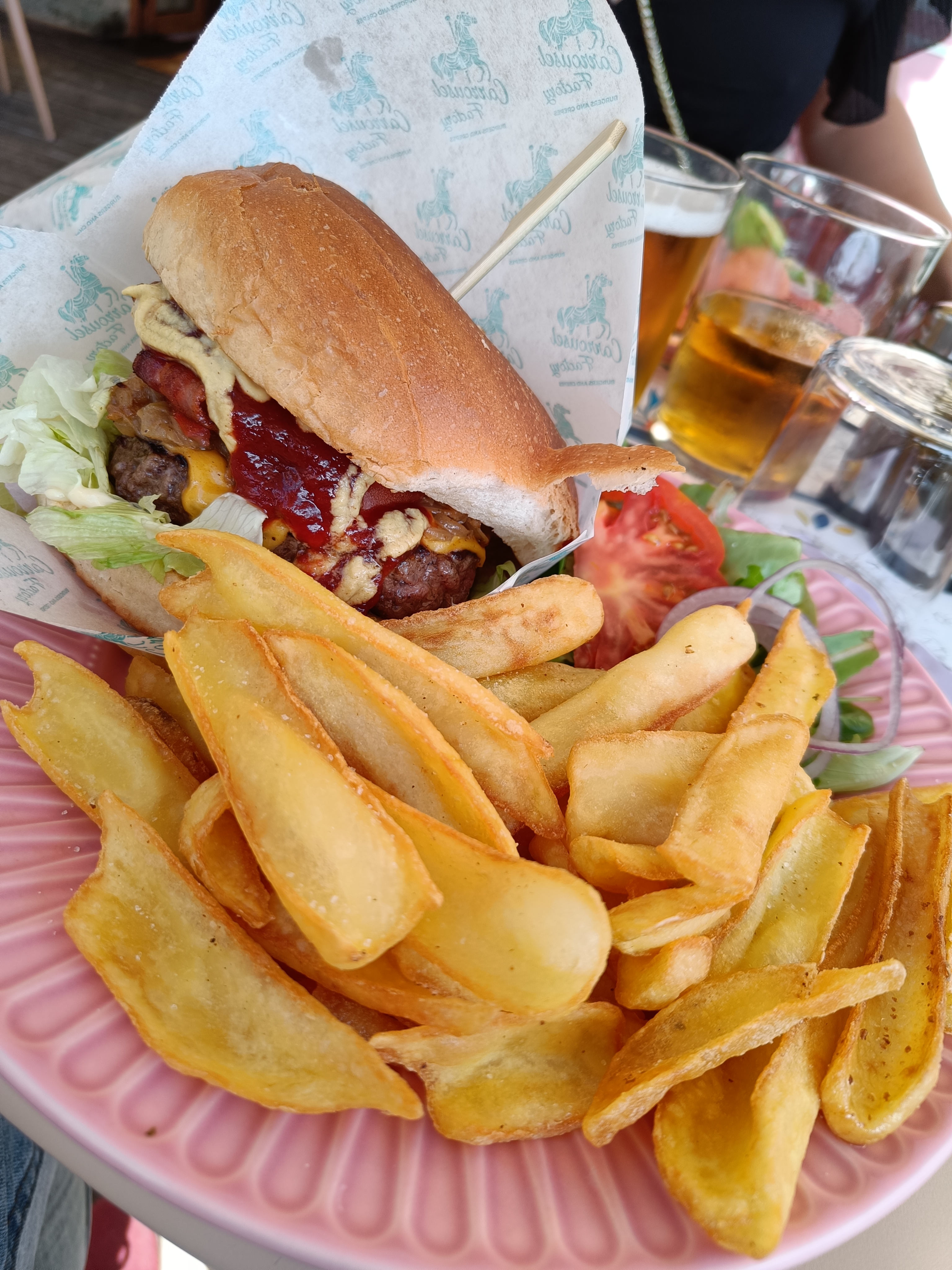 Burger bon, généreux. Menu du midi à 16 euros avec burger/frites/salade, boisson et café. Tessasse un peu triste comparé à l'ambiance intérieure mais au soleil. Abscence de gel hydroalcoolique à l'entrée.