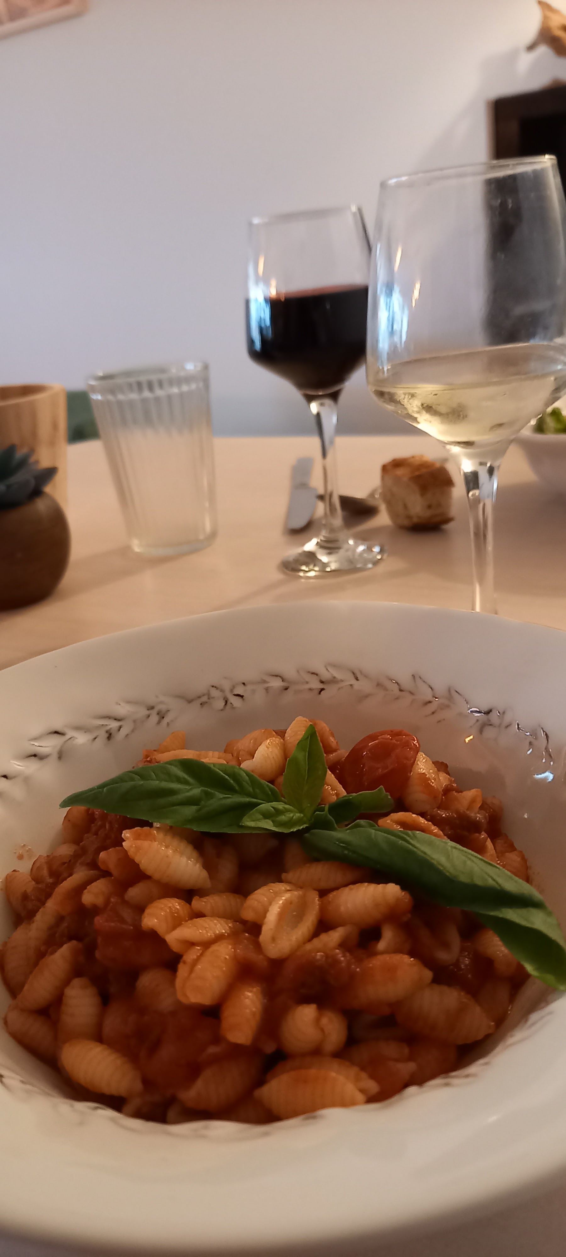Ingredients de qualité. Pâtes à la façon italienne, préparées et agrémentées par un professionnel à la vue du public. Vin au verre présentant des saveurs gustatives exceptionnelles. Desserts légers et onctueux. On y reviendra.