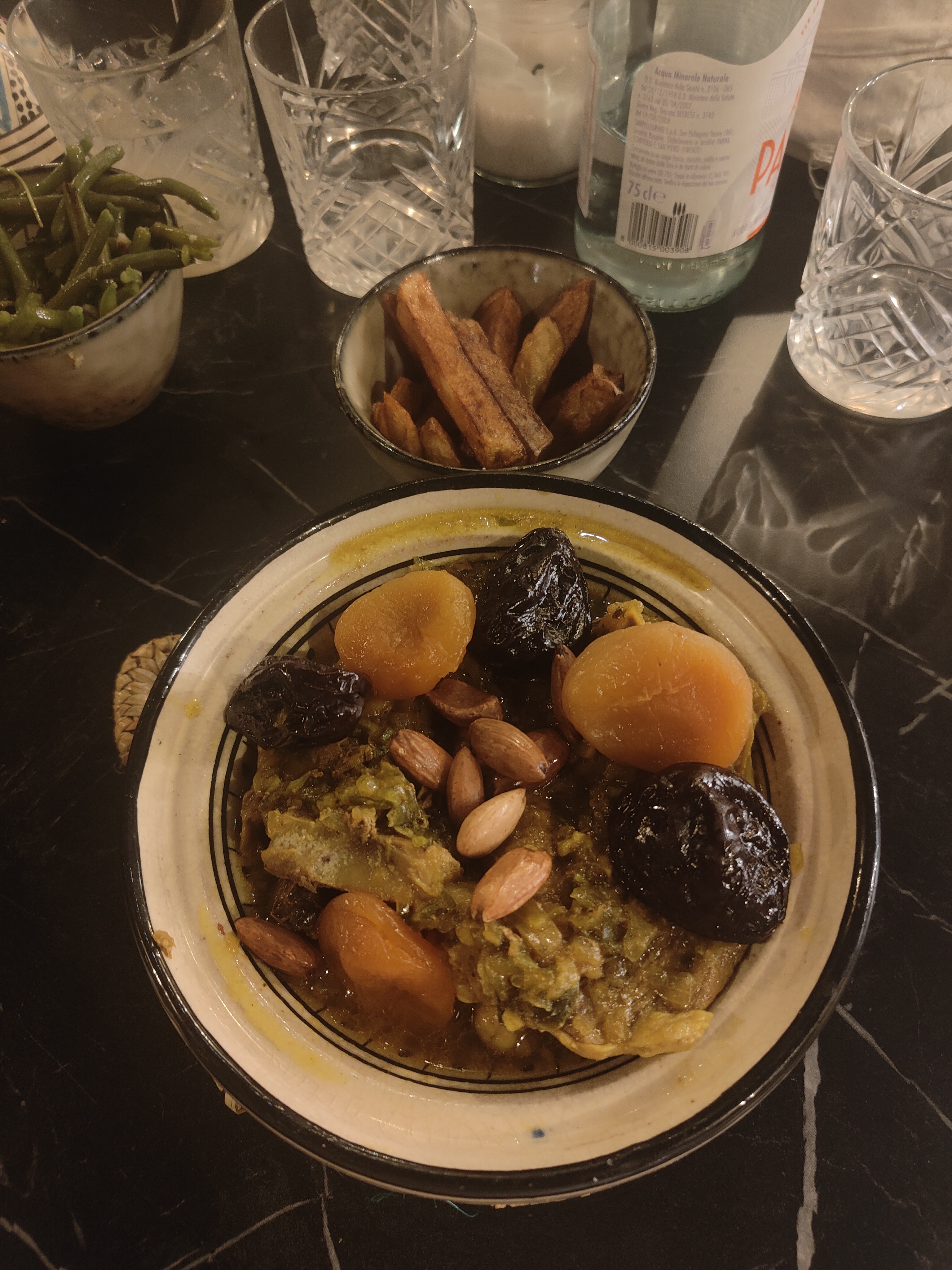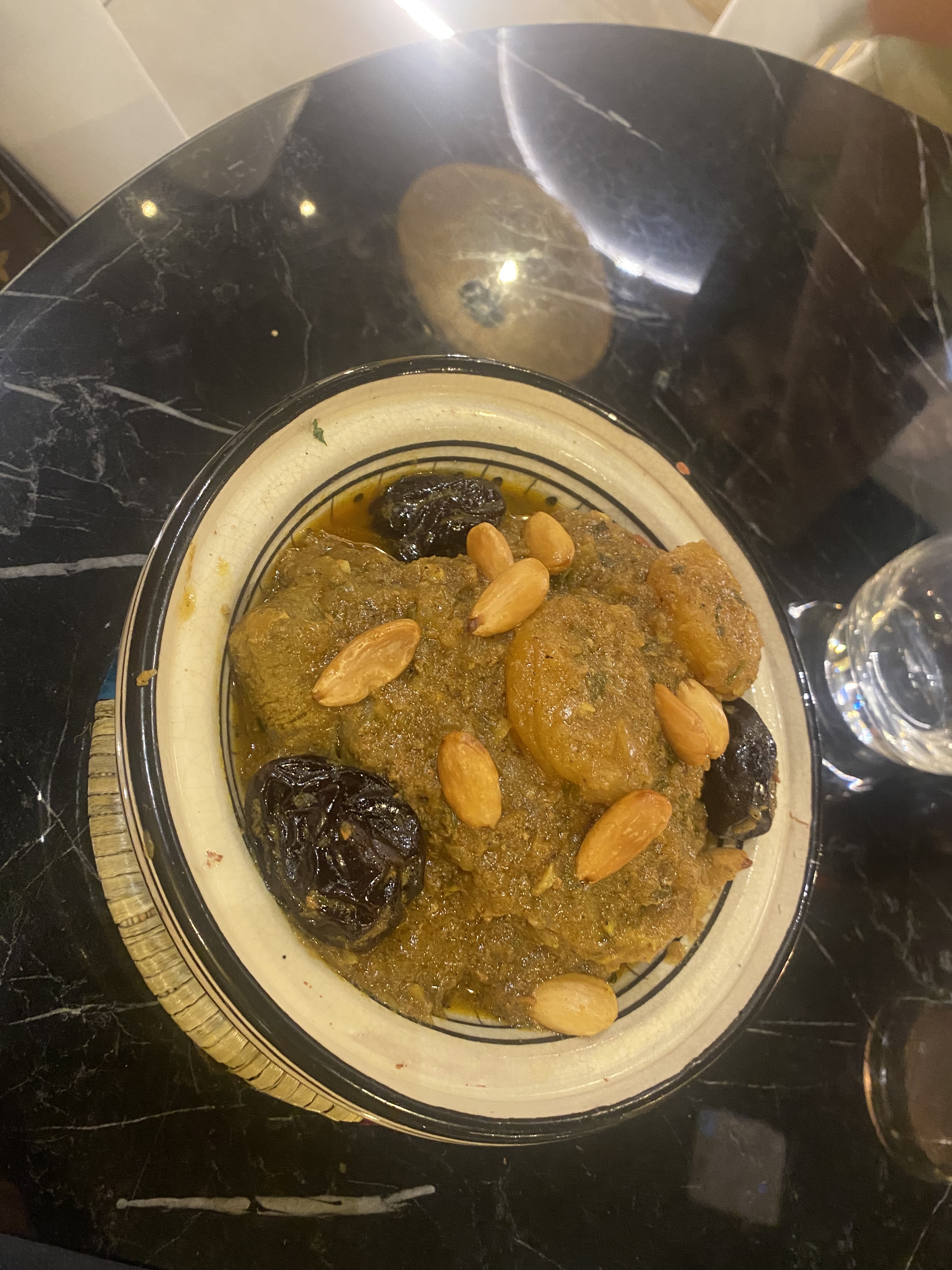 Degeulasse j'ai eu le droit a 2 pruneaux froid , 2 abricot, des amandes mêmes pas grillées ce n'est pas digne d'un tajine au pruneaux et le tajine au poulet baigner dans un bouillons ! 23 euro le plat lamentable
