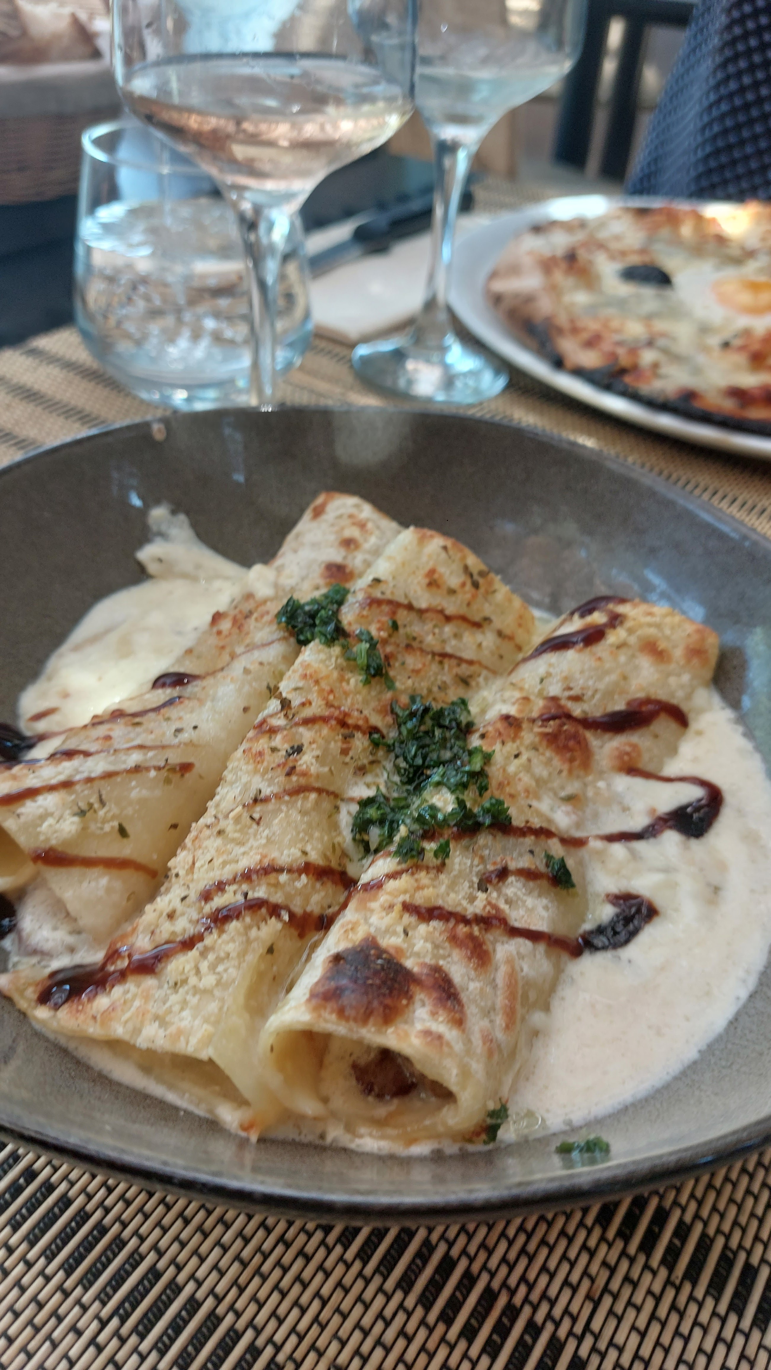 Endroit reposant, la déco apaisante, la cuisine au feu de bois Pizza...cannelloni du chef ....etc .. et tout cela en famille !!!! Vraiment cool 👍 A refaire