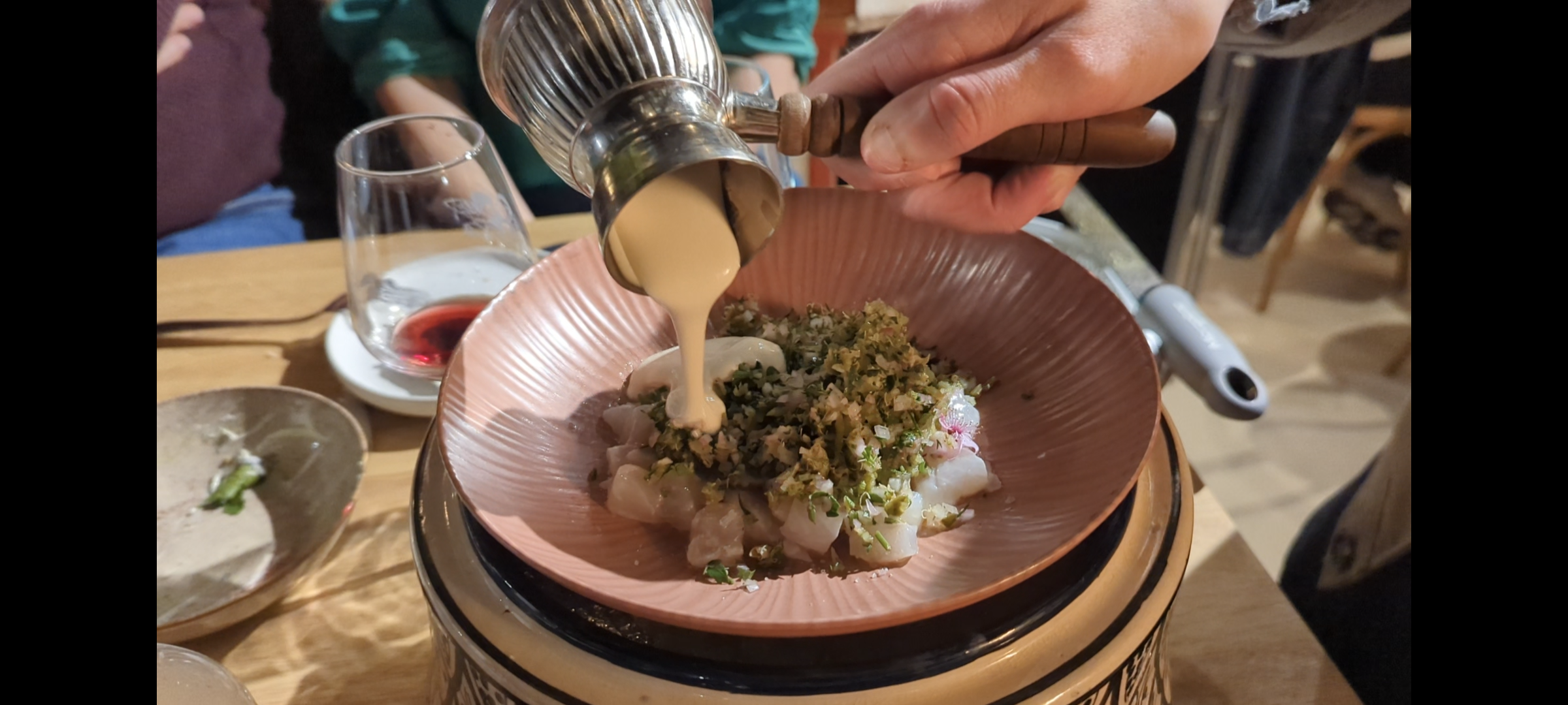 L'ambiance et la cuisine sont top. La décoration et les plats réussis. Les prix sont élevés (Coktail 15€). Le poulpe et le terre en dessert délicieux. Déçue des croquettes et du cocktail, très beaux mais manquait de goût. Service très bien. On était assis sur une chaise haute, dans un coin de la cave a vin, très peu d'espace et l'impression de gêner (les tables voisines, le passage du service).