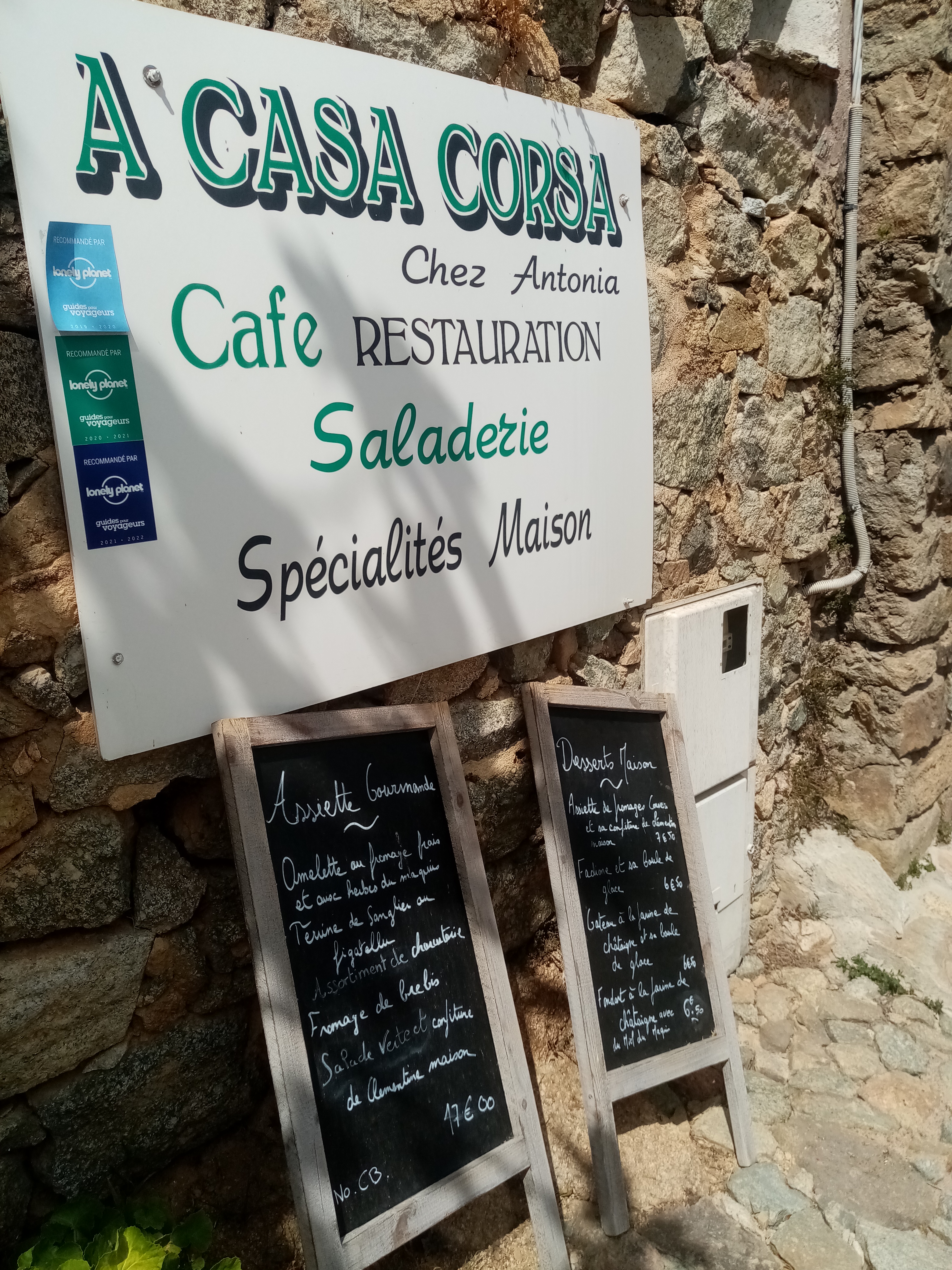 A sant Antonino... ptit resto qui paie pas de mine , accueil agreable, tres tres bon sandwiches fait minute tres copieux savoureux et bien garnis, glaces artisanales, et patisseries maison... gateau de chataigne ( malheureusement en arrivant a 14h il n y en avait plus, du cou je me suis laissé tenté par une part de Fiadone et sa boule dde boule... tres bon pas déçu, du cpu cela m a permis de nouvelles saveurs)la table a coté a mangé a la carte... de bonnes odeurs sont sortis de la cuisine puis de tres belles assiettes ont ete servies omelette brousse. Assiettes de charcuterie et grosse salade...
