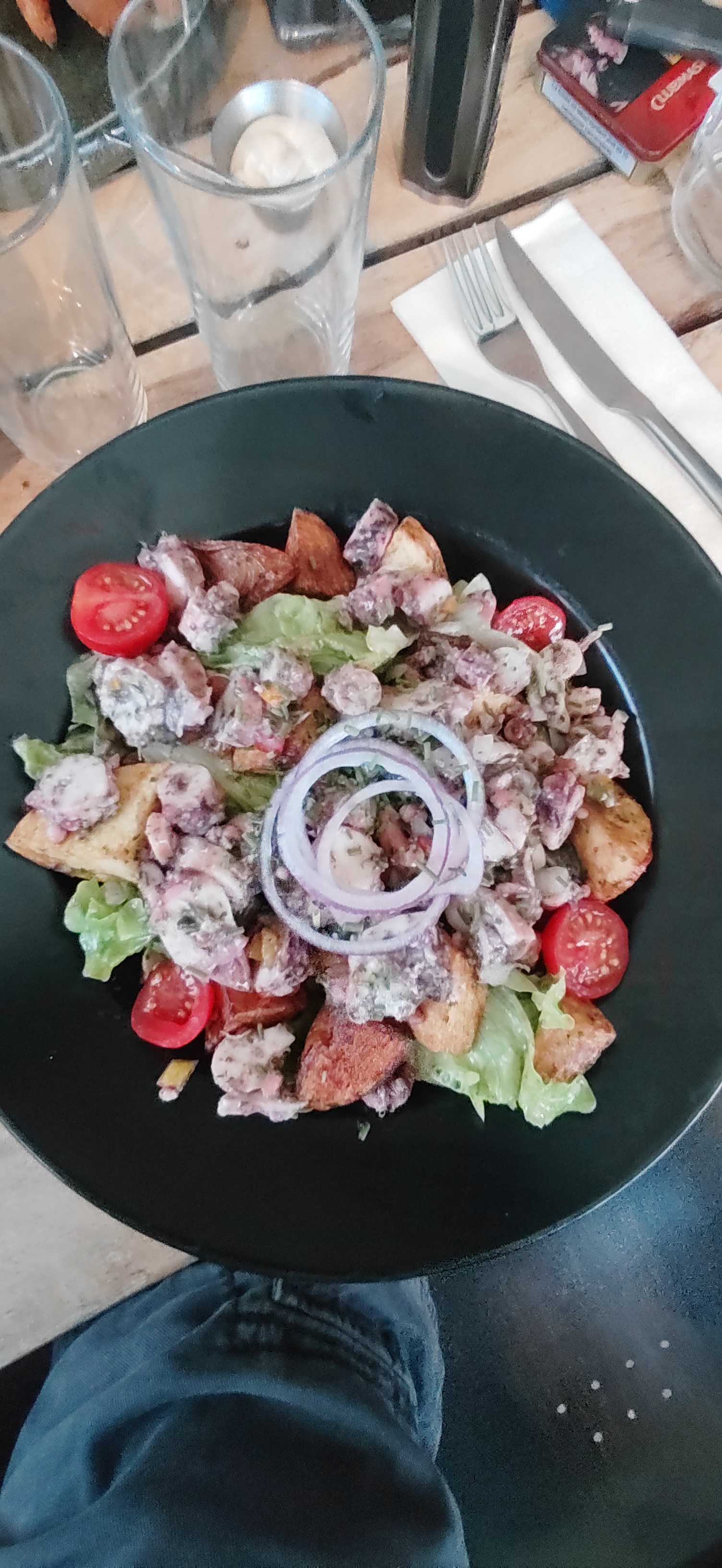 Magnifique cuisine tout fait maison ils n'ont pas besoin de le noter pour se justifier les pommes de terre rissolées fondante, l'hamburger à tomber et le service au top ayant vu 3 serveurs différents tous hypers aimables et détendus 👍👍👍